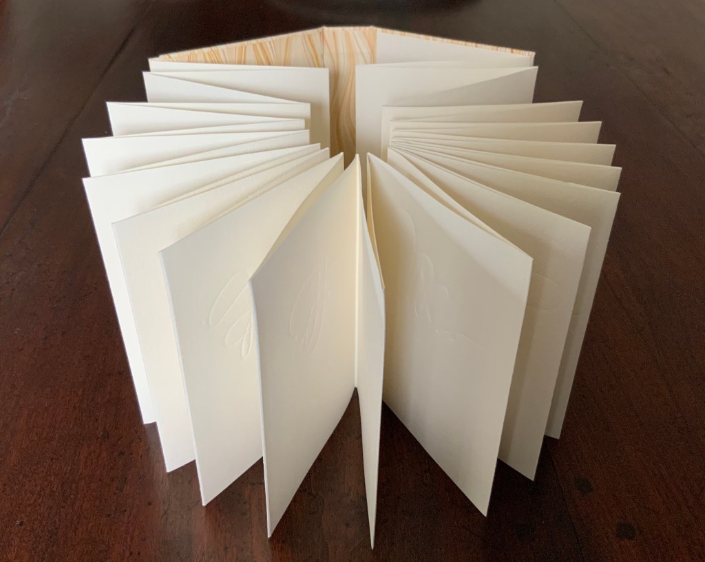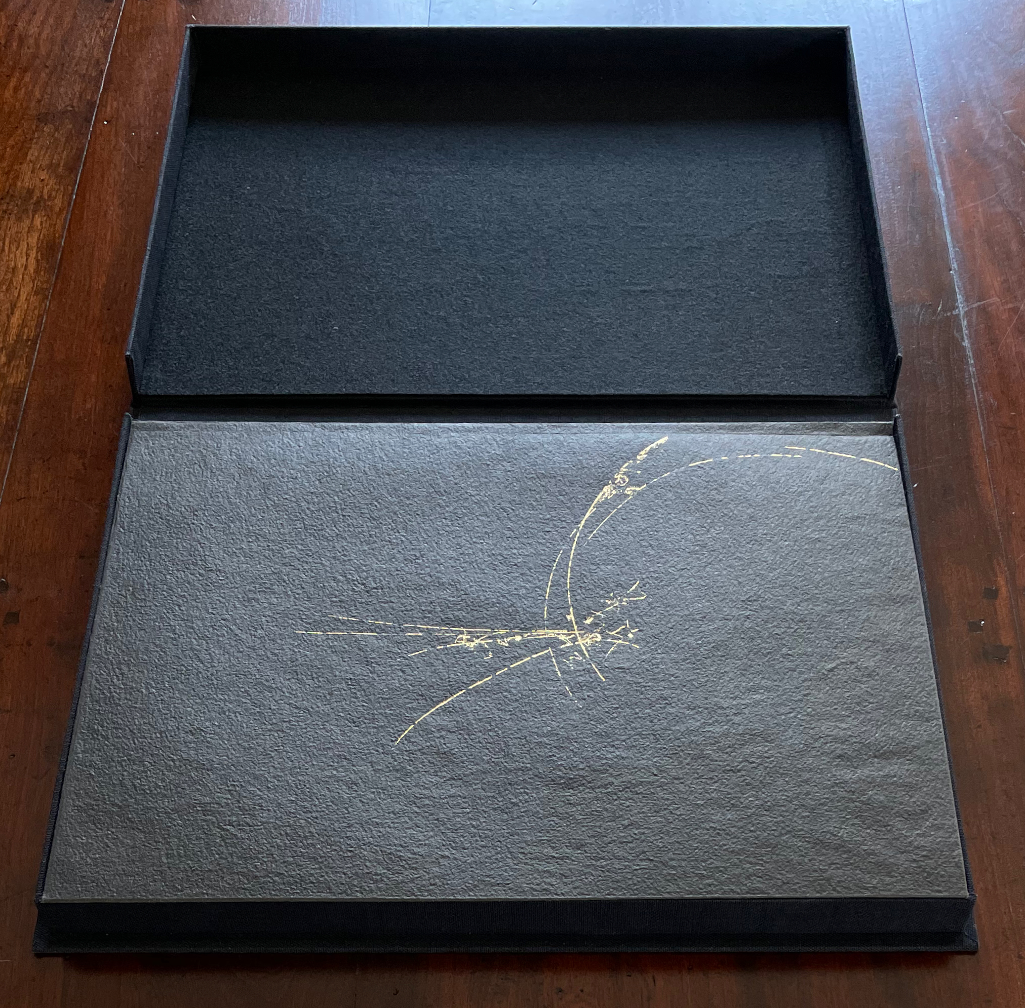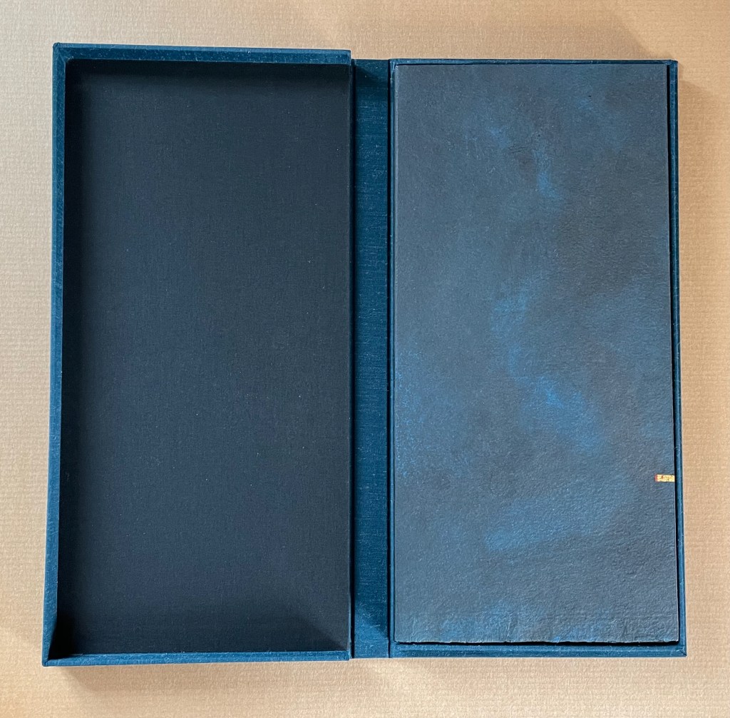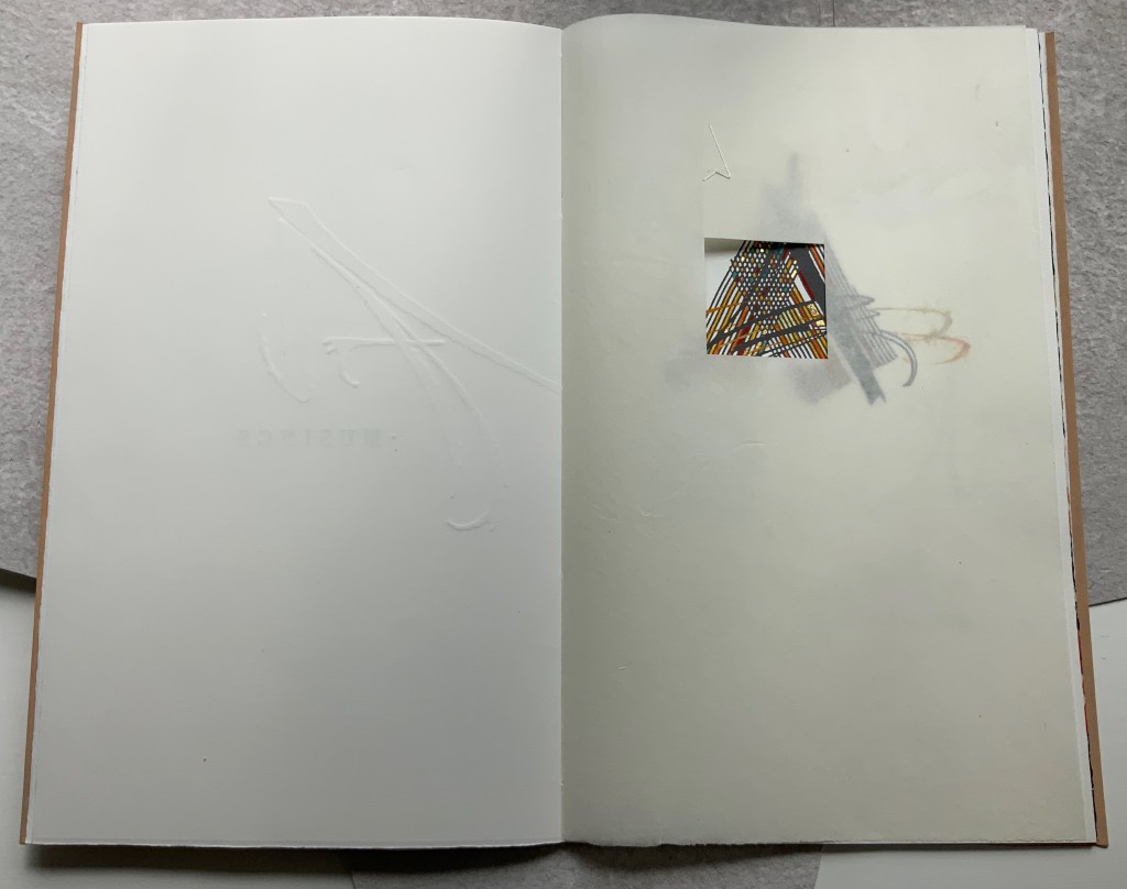 Another manuscript book, A Musings is an encounter between Suzanne Moore and the letter A, one of her 26 muses. As with any artist and muse, this naturally leads to portrayals of A in such varied positions, with such varied tools and techniques and such varied materials that the boxed and bound portfolio must take the amusing title A Musings. The muse finds itself posed across Magnani Aquaforte, Arches Text Wove, transparent kozo and other handmade papers enveloped by a stiffened, painted handmade paper. Moore’s musings fall on the historical, symbolic and spiritual aspects of the letter A with acrylic paint, pencil, freehand foil tooling, gold and palladium leaf, collage, debossing and embossing, sumi ink and gouache, sizing and varnish, monoprint, letterpress, folds and cutouts.