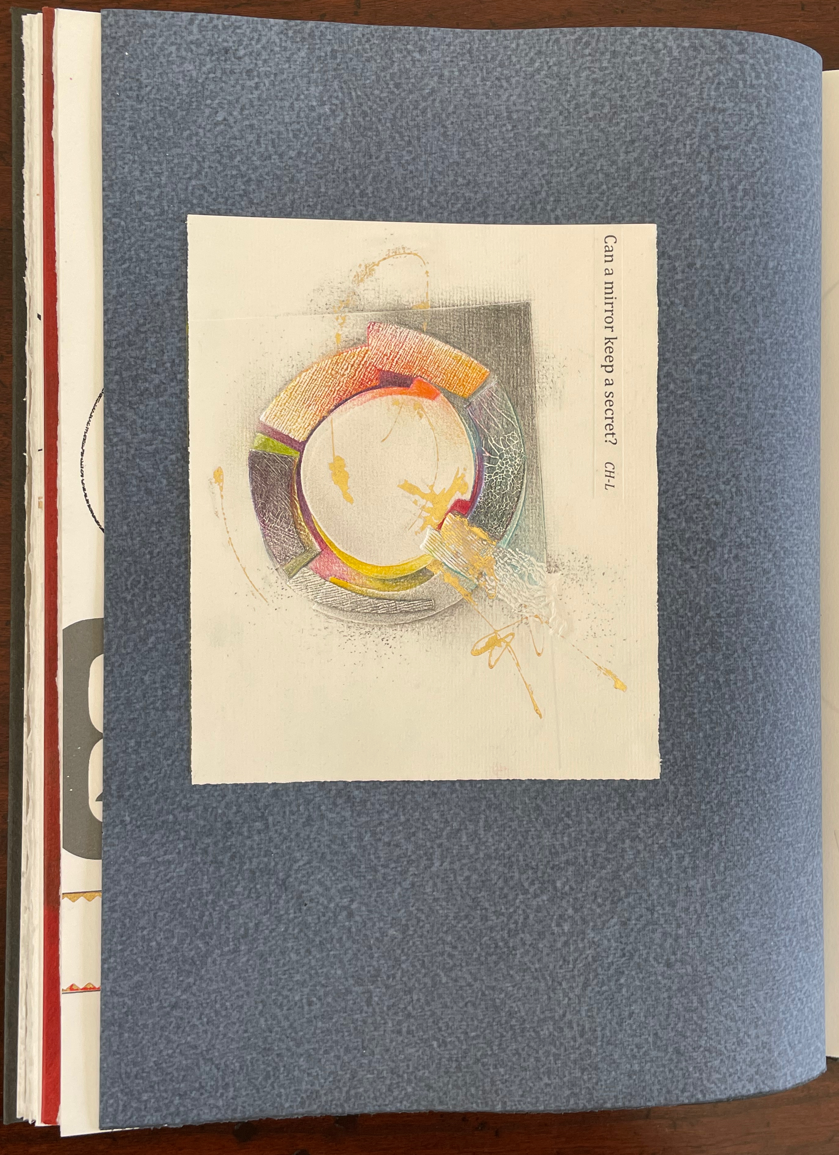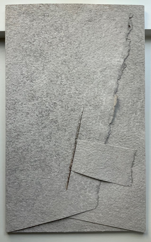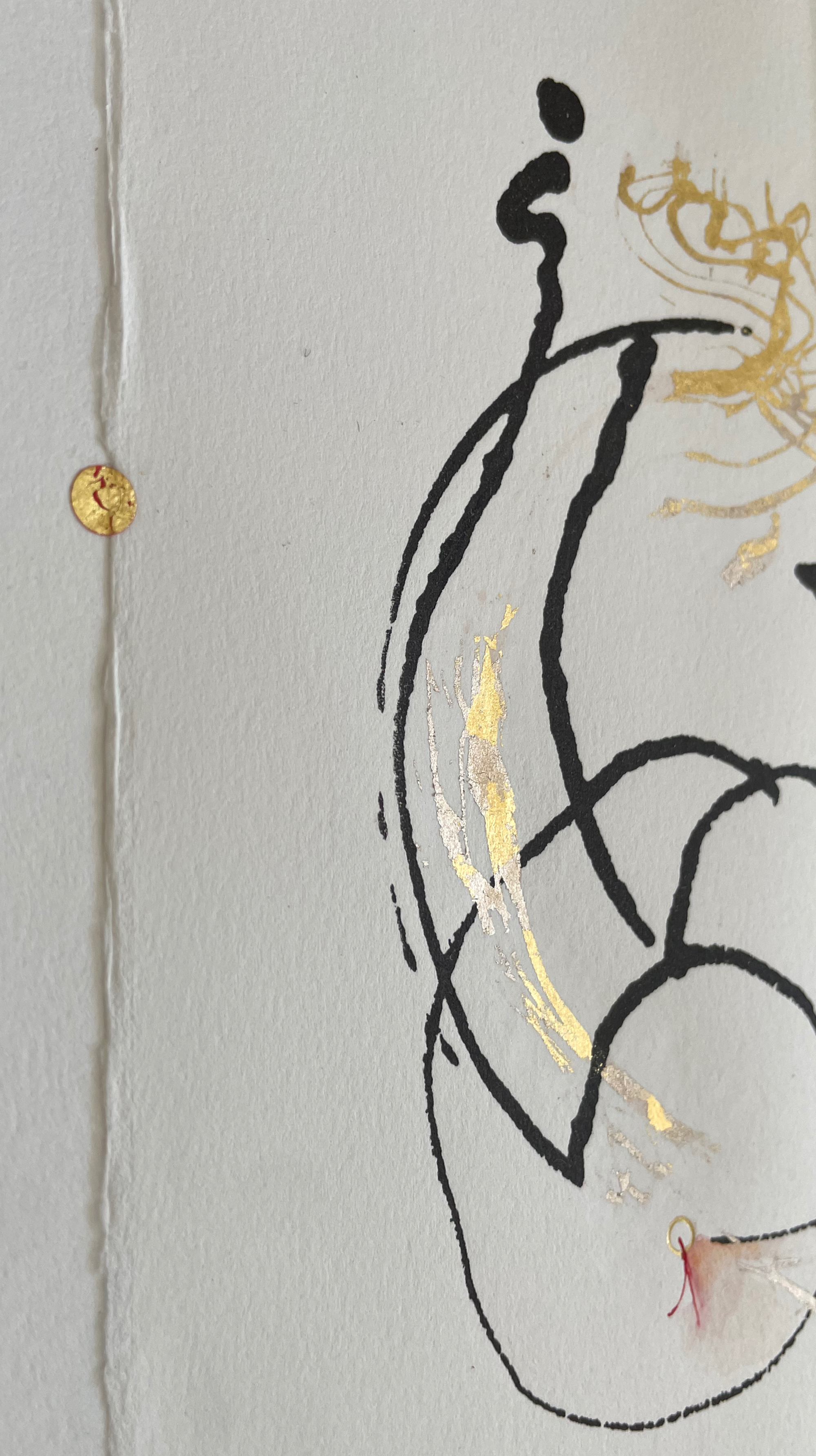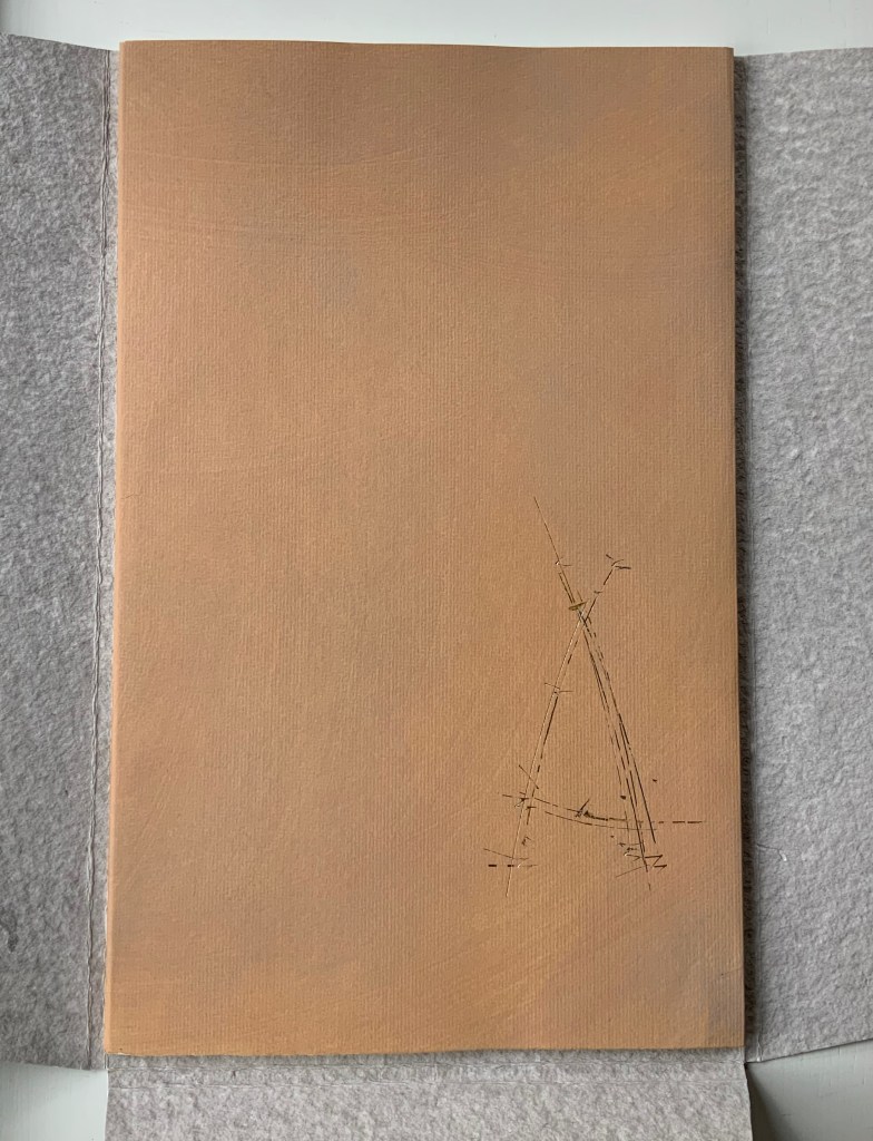 Another manuscript book, A Musings is an encounter between Suzanne Moore and the letter A, one of her 26 muses. As with any artist and muse, this naturally leads to portrayals of A in such varied positions, with such varied tools and techniques and such varied materials that the boxed and bound portfolio must take the amusing title A Musings. The muse finds itself posed across Magnani Aquaforte, Arches Text Wove, transparent kozo and other handmade papers enveloped by a stiffened, painted handmade paper. Moore’s musings fall on the historical, symbolic and spiritual aspects of the letter A with acrylic paint, pencil, freehand foil tooling, gold and palladium leaf, collage, debossing and embossing, sumi ink and gouache, sizing and varnish, monoprint, letterpress, folds and cutouts.