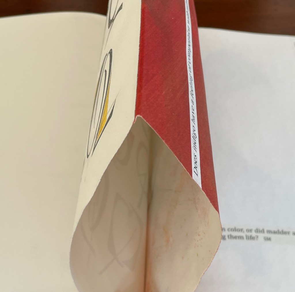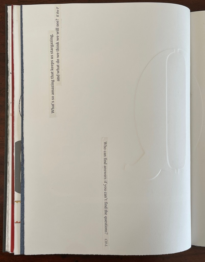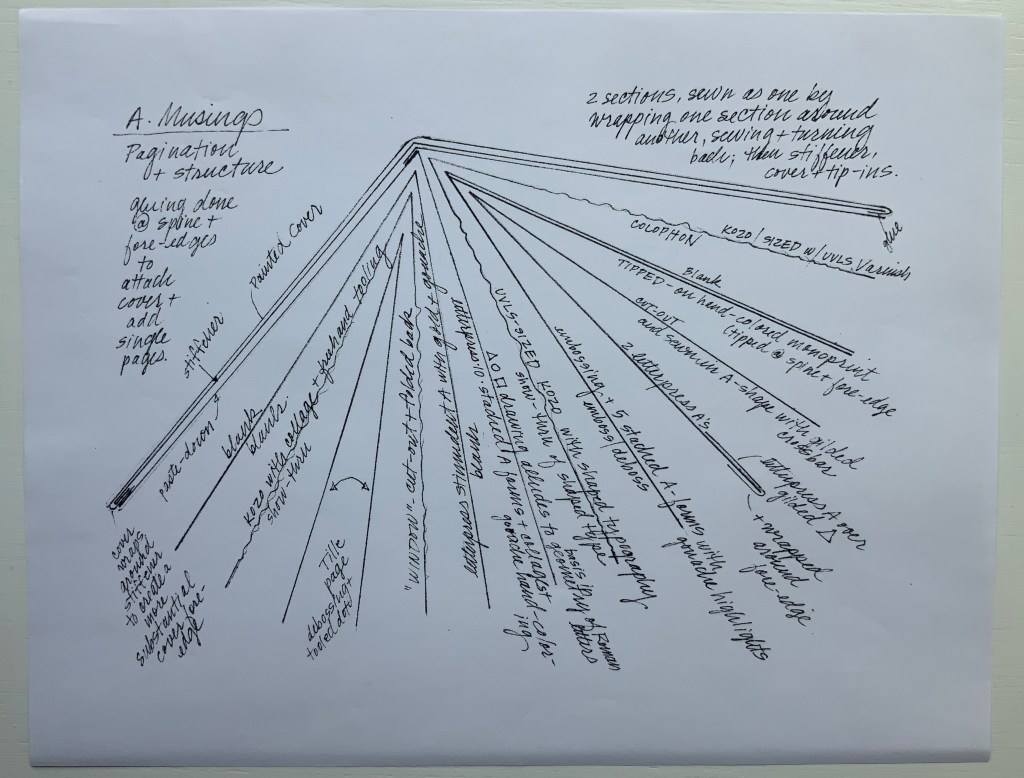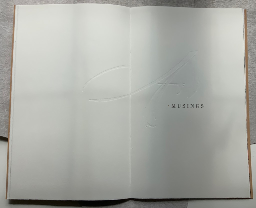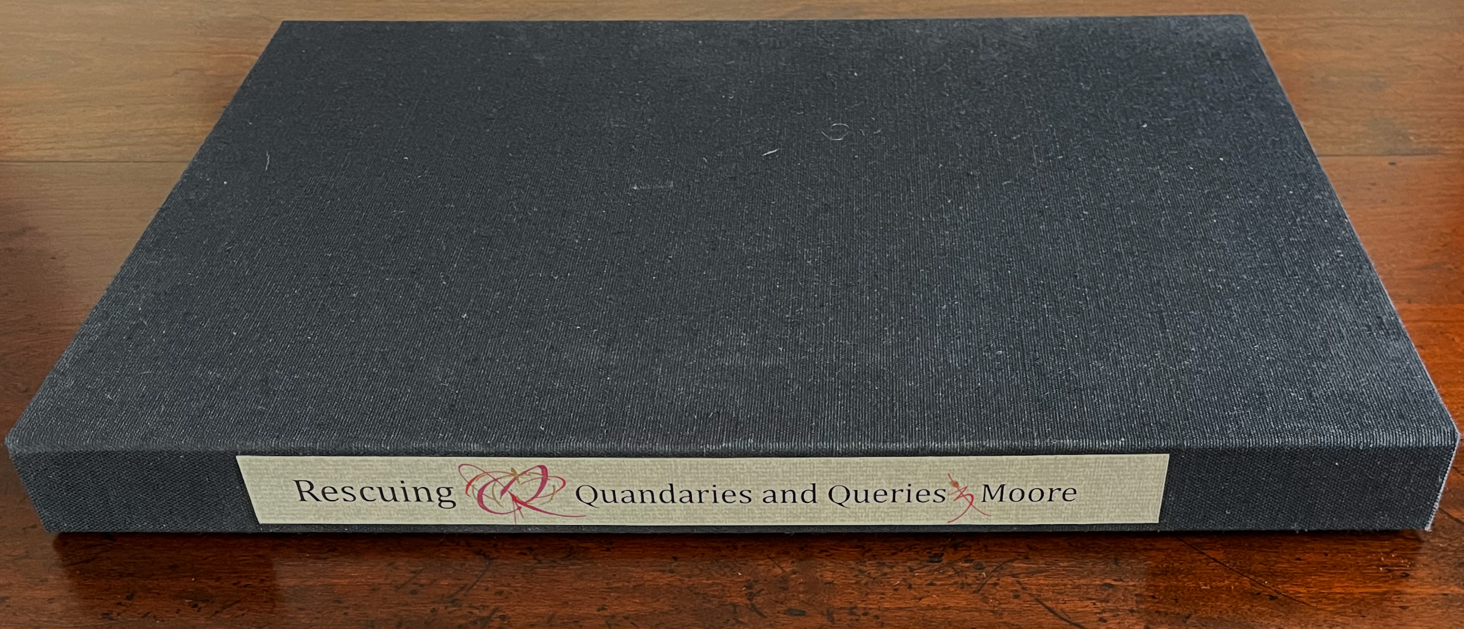 Books are inherently collaborative affairs, and for artists’ books, collaboration can become almost another tool for the artist. Jessica Spring, mentioned above, also debossed the opening A, hand-set the half-A composition and contributed to Rescuing Q. Now a fine binder in her own right, Gabby Cooksey, a studio assistant to Moore and Don Glaister, was essential to A Musing‘s hand work, binding and wrapper. Part of Moore’s creative progression from contributing to overseeing to orchestrating can be traced from here across three other works in the Books On Books Collection.