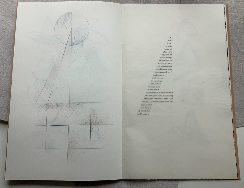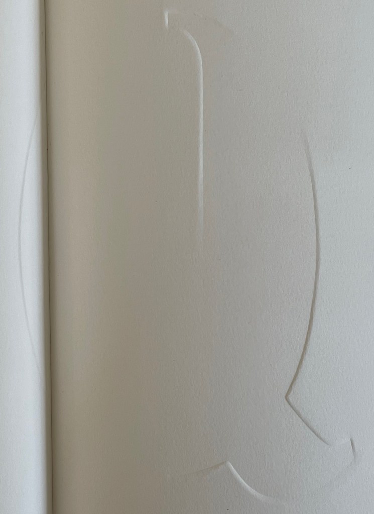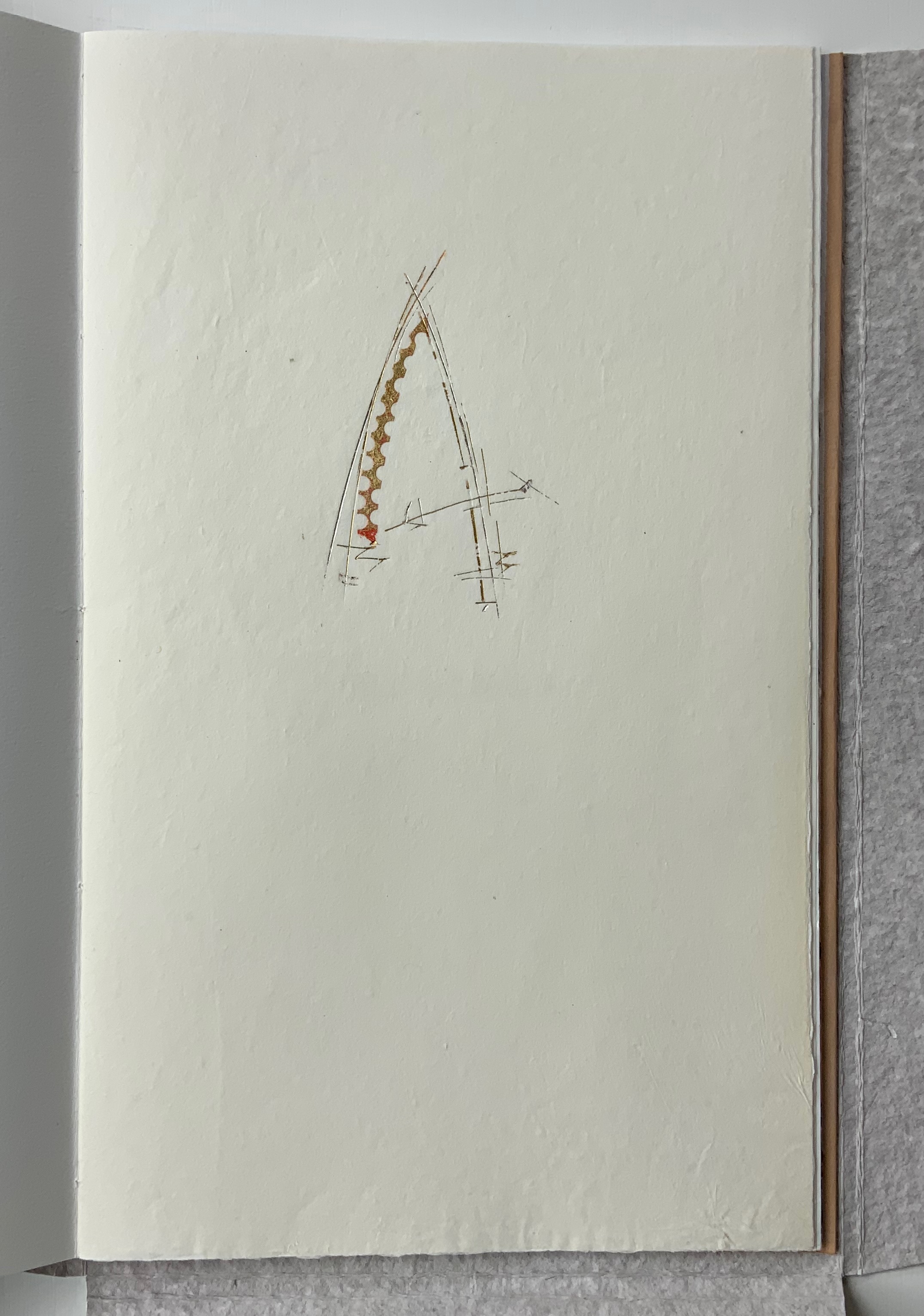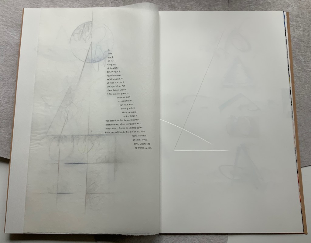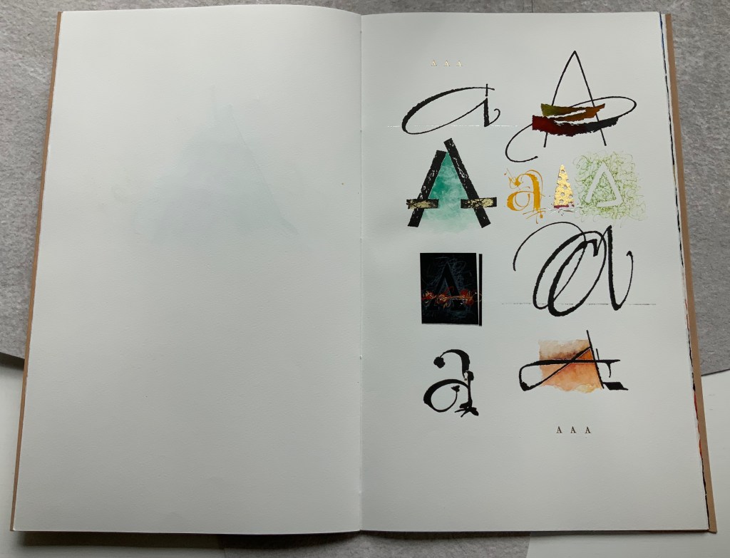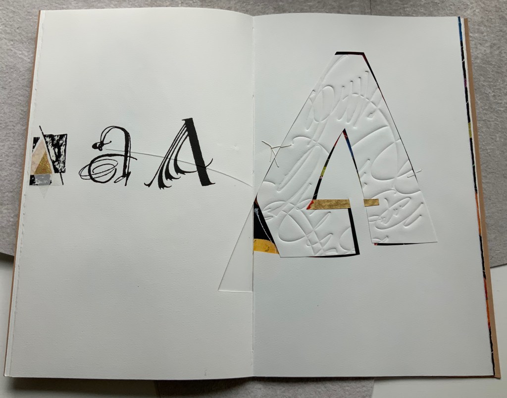 Using a translucent leaf with set type shaping half an A, the next two double-page spreads play (or muse) on uppercase A’s bilateral symmetry poised between geometric and freehand approaches to lettering, between typography and calligraphy and between inking and debossing.