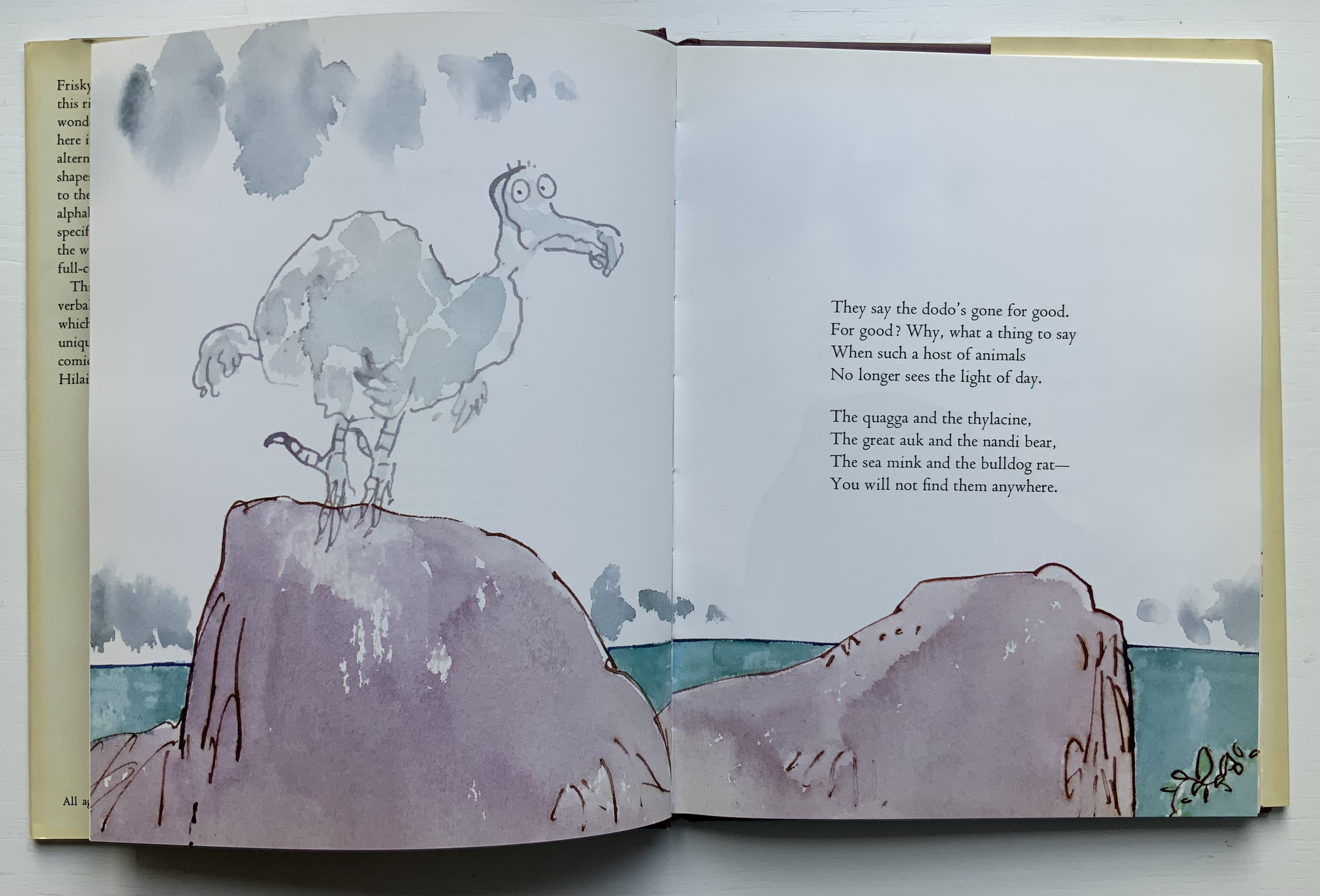 Quentin Blake’s page-by-page visual narrative married to Dick King-Smith’s opening verses in Alphabeasts.