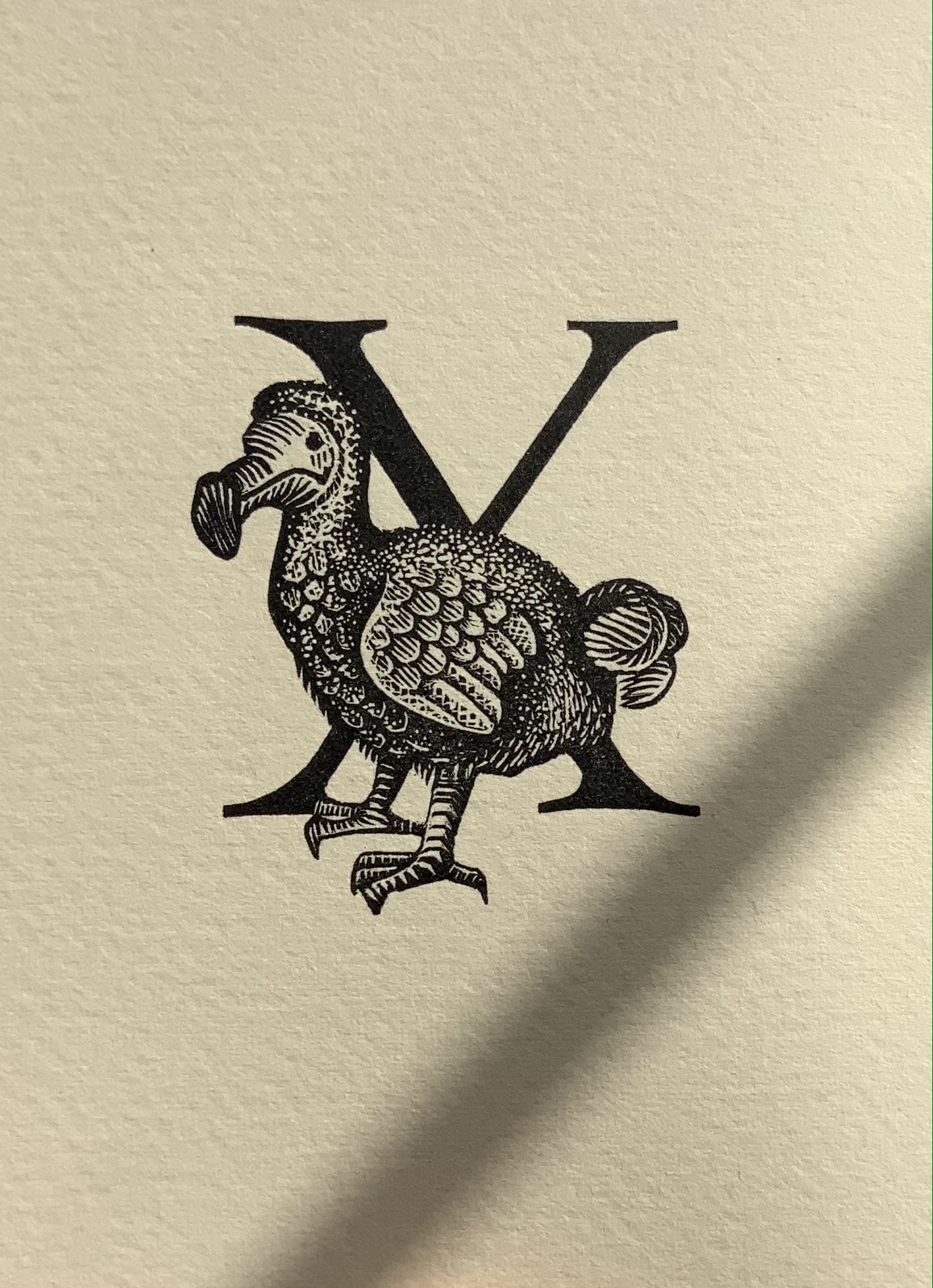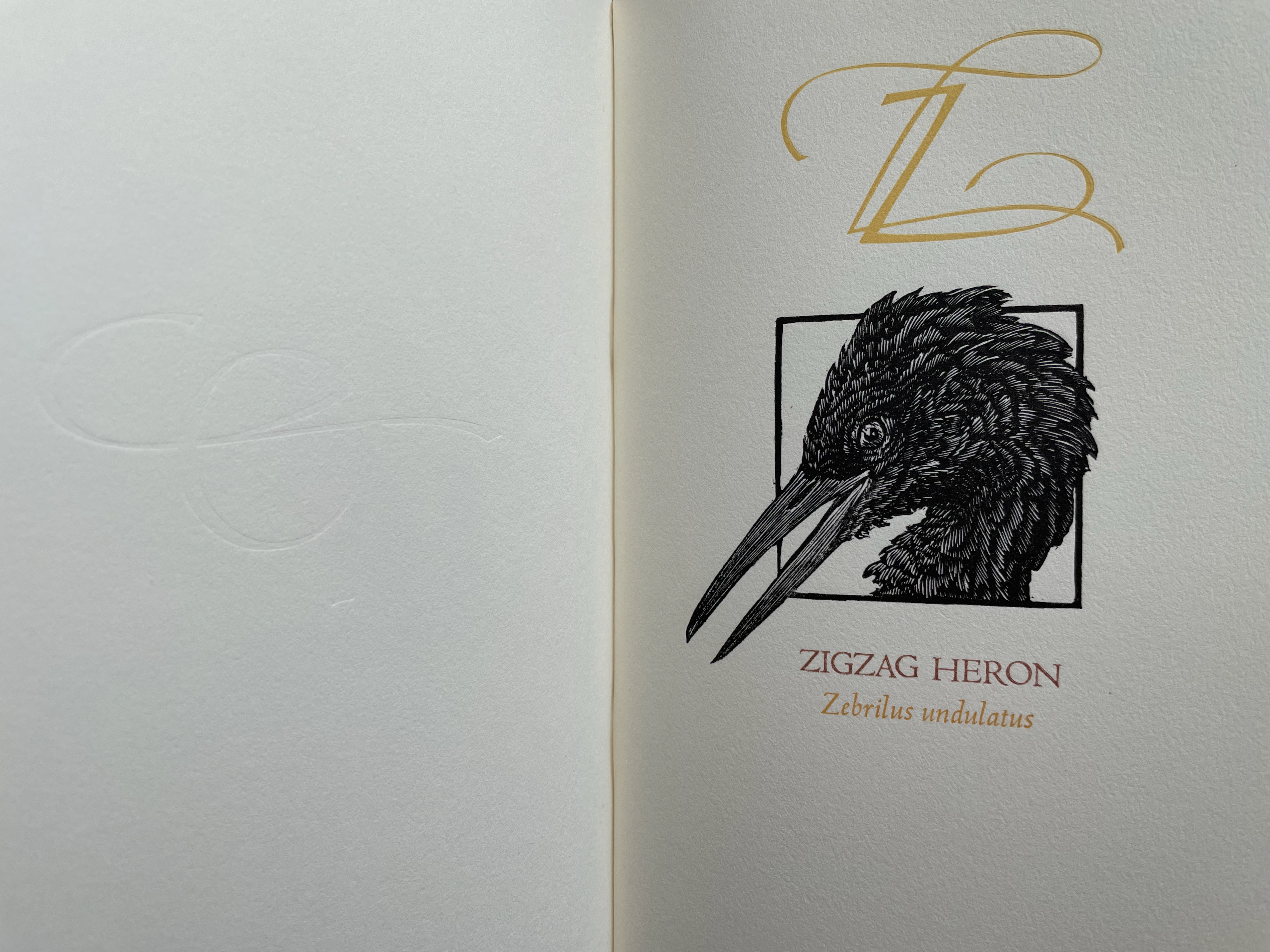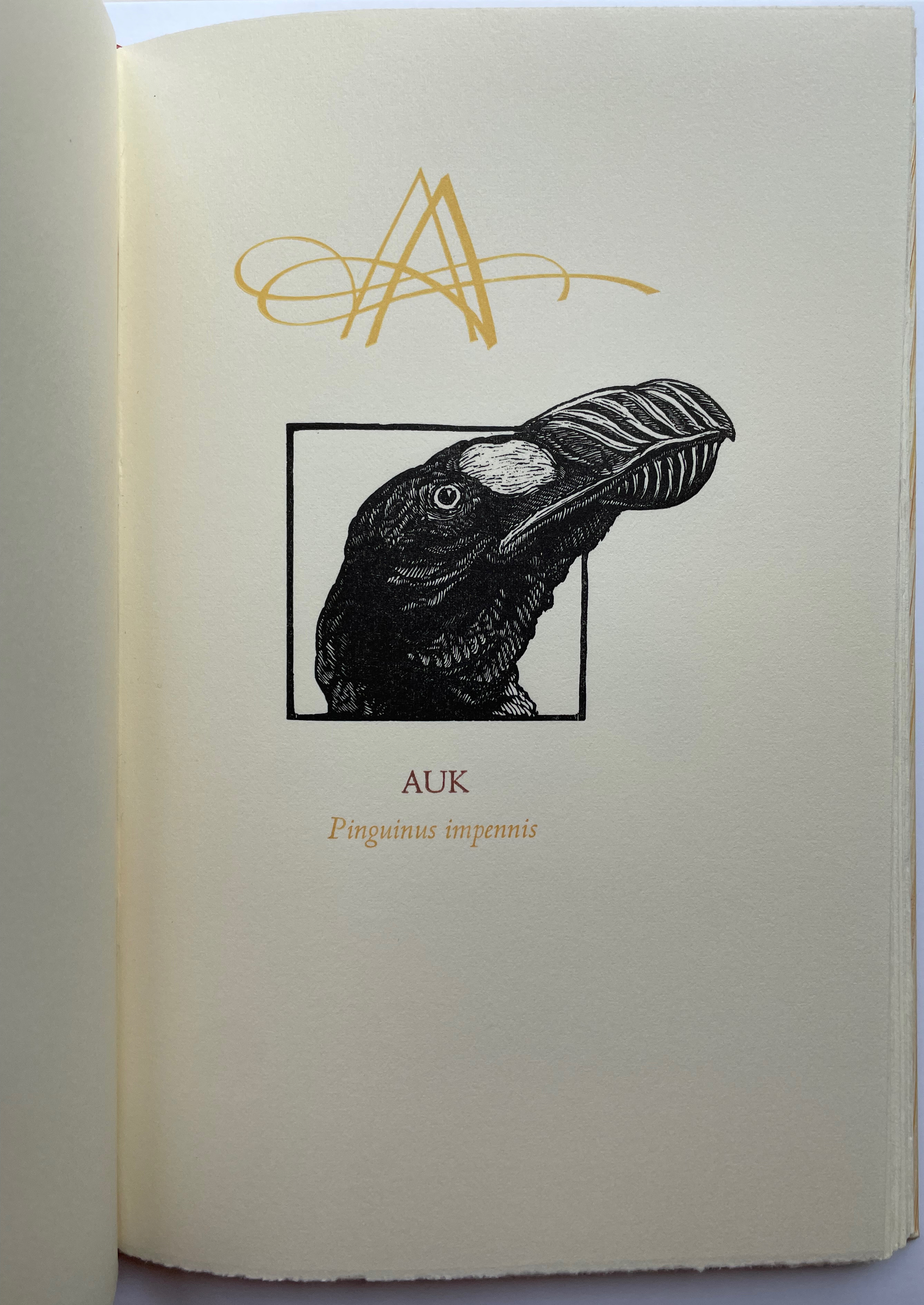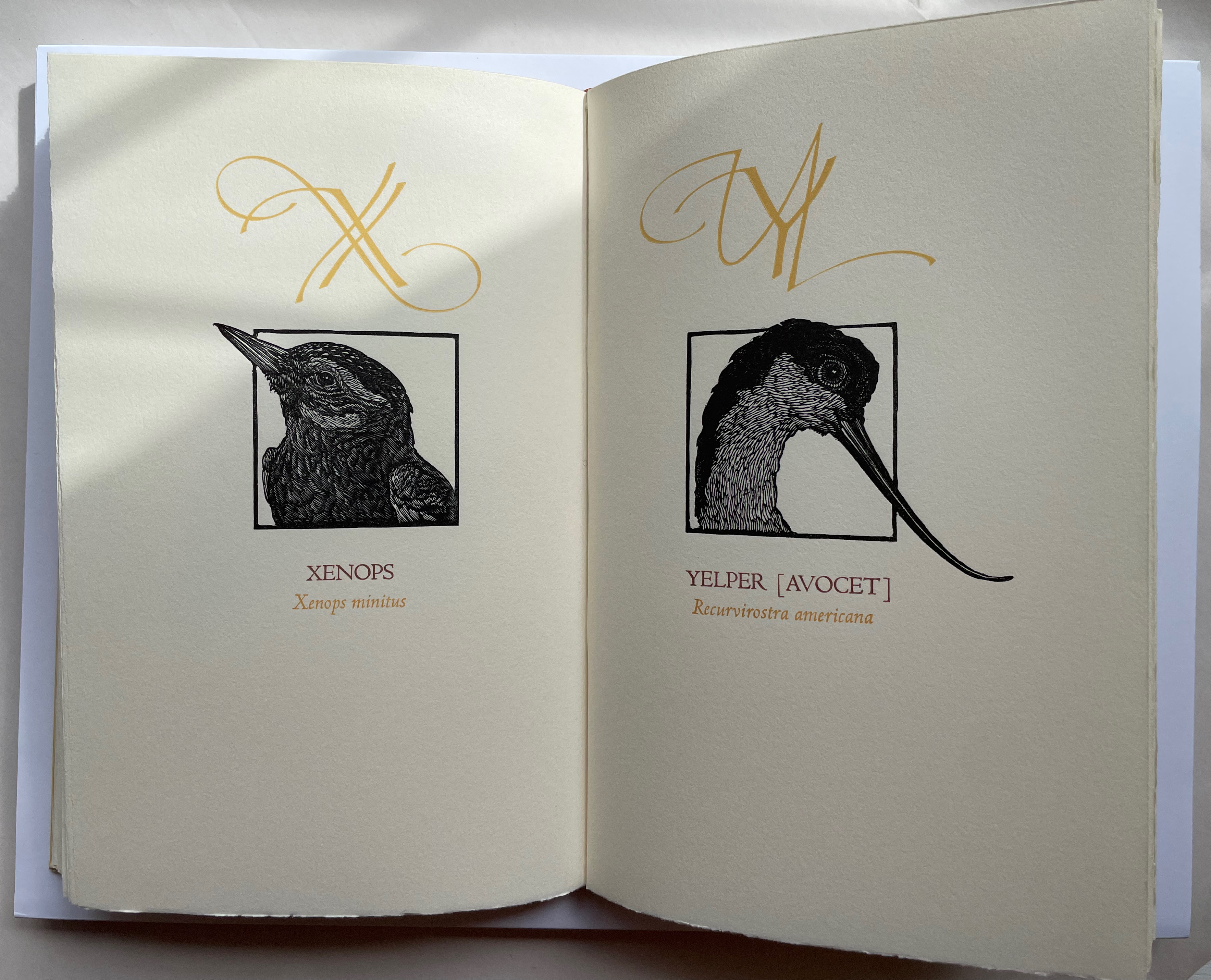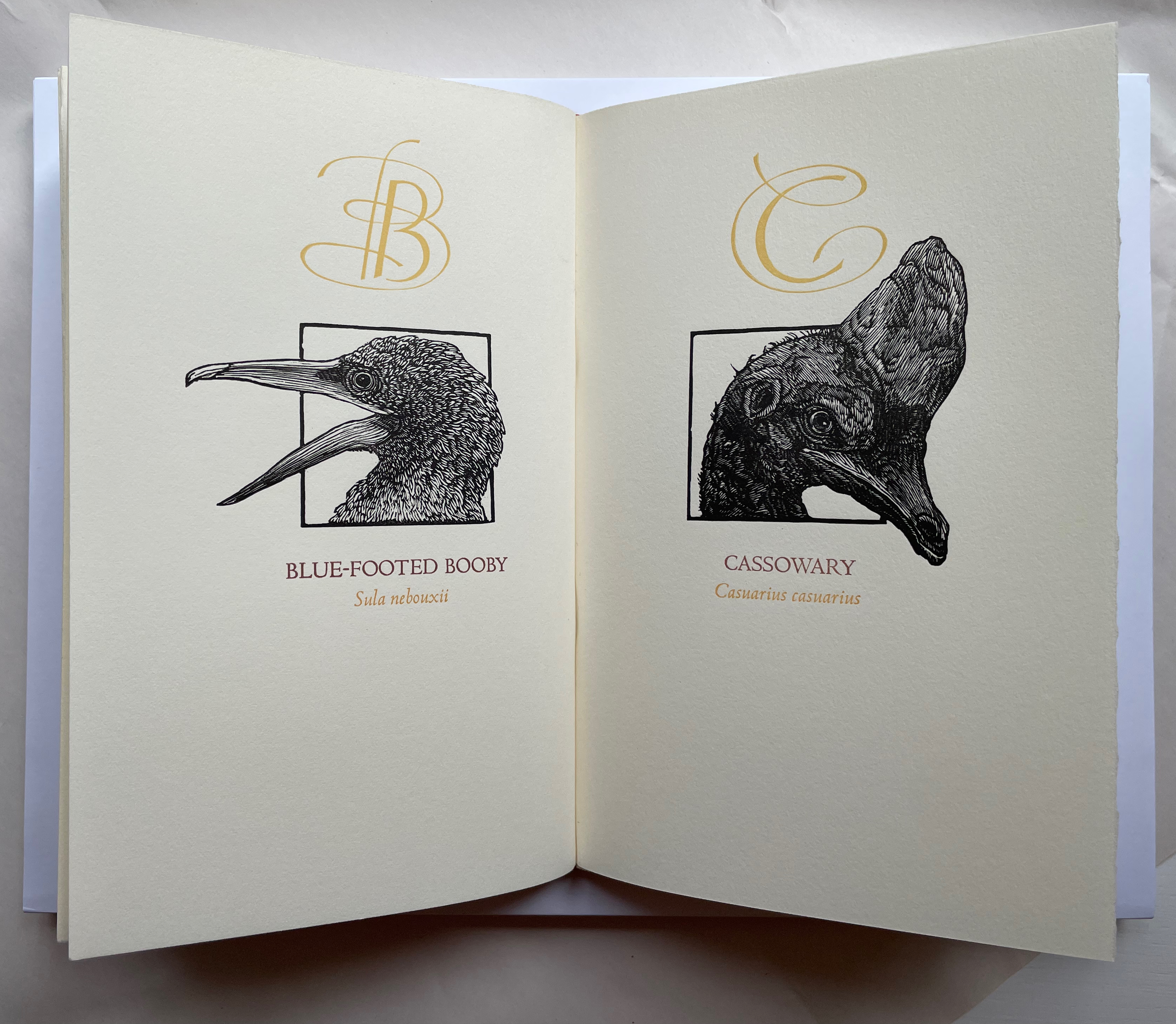 Under his Cheloniidae Press imprint, Alan James Robinson created three artist’s alphabets: A Fowl Alphabet with Suzanne Moore; An Odd Bestiary (1982) and The Birds and Beasts of Shakespeare (1990), arranged as a double abecedary, first the birds and then the beasts. Although this copy of A Fowl Alphabet comes from the regular edition and does not have the color of the deluxe editions of all three abecedaries, it does demonstrate the extraordinary fineness of Robinson’s wood engraving as well as his compositional talent, which also informs the book’s design. The positioning of the birds’ heads in their printed black frames conveys a sense of movement and three dimensionality on the individual page, but notice how Robinson varies the positioning from page to page and across double-page spreads to enhance the sense of movement.