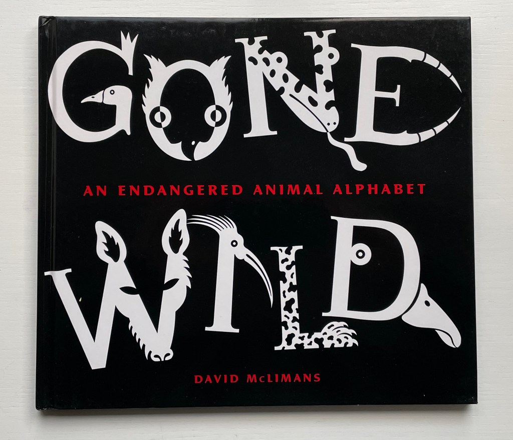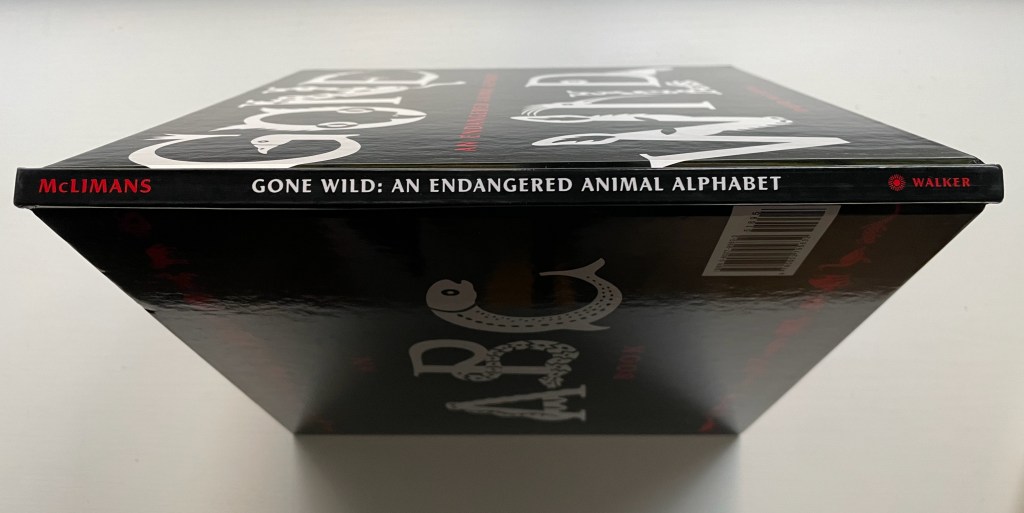 Gone Wild: An Endangered Animal Alphabet(2016) David McLimans Casebound, illustrated paper over boards, illustrated doublures, sewn book block. Illustrated, debossed glossy paper dustjacket. H255 x W285 mm. 36 unnumbered pages. Acquired from Gargoyle Books, 25 August 2022. Photos: Books On Books Collection.