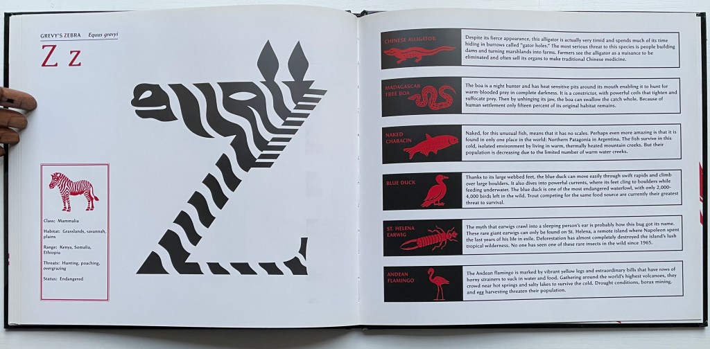 After the brief red-on-black thumbnails and descriptions following Grevy’s Zebra, McLimans provides further reading (online and in print). You have to go beyond a quick dive into the address he provides for the IUCN to find the Red List (see address above). There you will learn how up to the minute this book was in 2016 — and, unfortunately, still is.