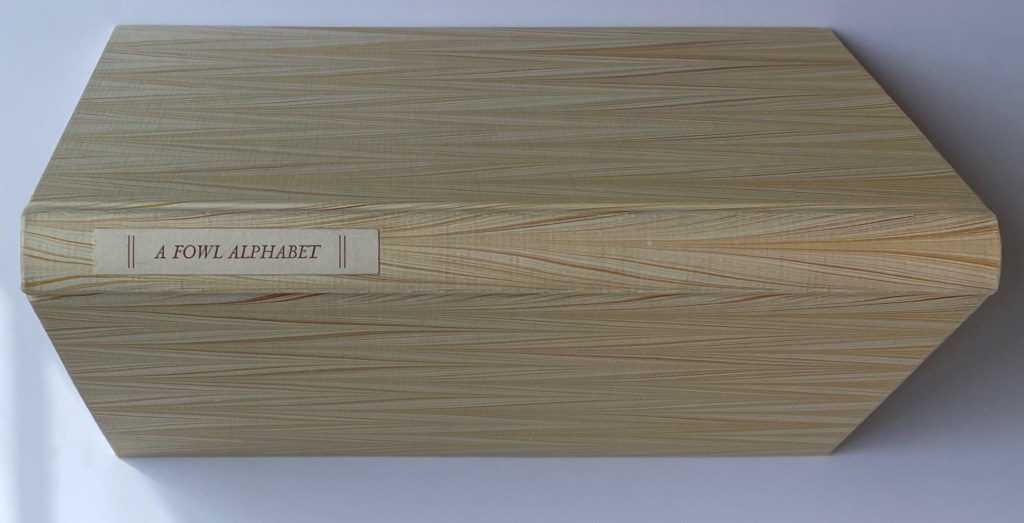 A Fowl Alphabet(1986) Alan James Robinson (etchings), Suzanne Moore(calligraphy) Casebound. Marbled paper over boards. Doublures and flyleaves. H218 x W145 mm. 26 Folios untrimmed at head. Four-page prospectus loose. Acquired from Bromers Bookseller, 16 August 2022. Photos: Books On Books Collection. Displayed with Suzanne Moore’s permission.