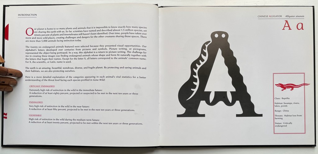 With Gone Wild, David McLimans adds a complex and subtle device to the explosion. The book is not so much about learning the alphabet with animals as learning about animals with the alphabet — or rather with “alphabetic art”. Wielding computer, pencil, pen, brush and India ink on bristol board, David McLimans redraws the alphabet’s capital letters to look like animals not yet extinct but on the Red List of the International Union for Conservation of Nature. Even the design of the traditional alphabet book subtly serves as a teaching tool about these animals. Notice how McLimans and John Candell, the book’s designer, turn the traditional presentation of uppercase and lowercase letters into a kind of running head that underscores the common and scientific names of each animal. Even the list of facts on each species — their habitats, geographic ranges, threats to survival and statuses — receives meaningful thematic design touches from the use of two-color printing — blood red and extinction black.