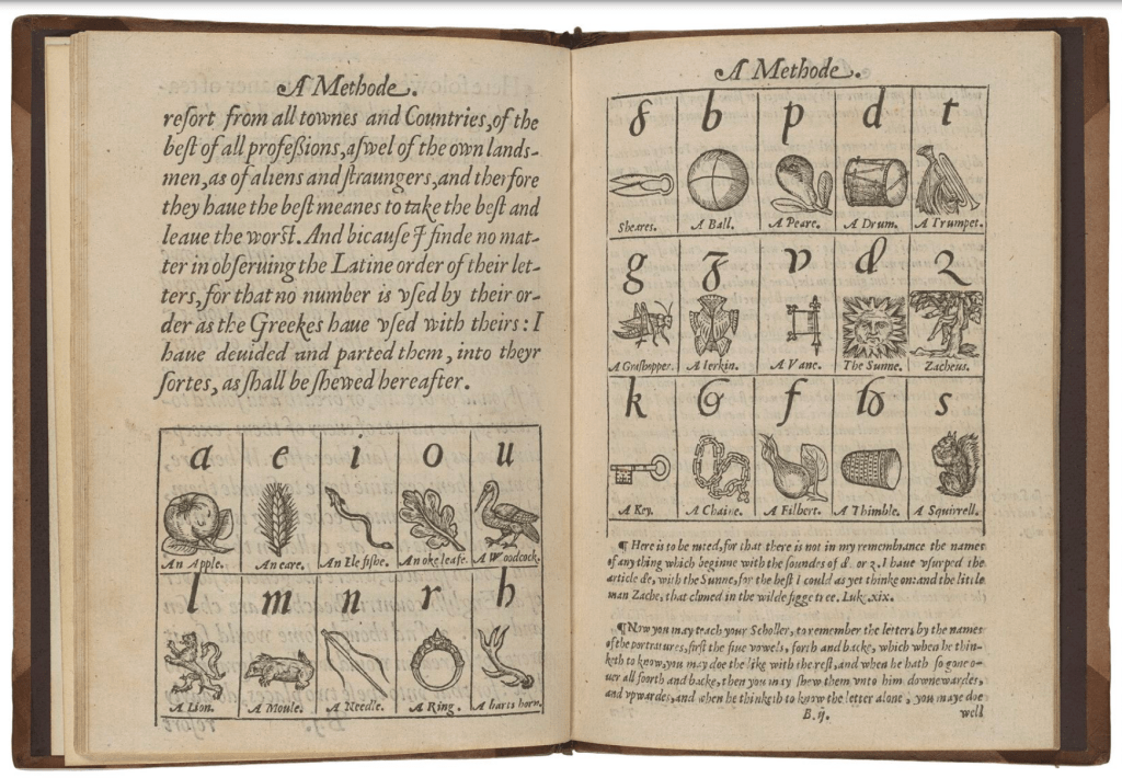 Whatever the cause, ever since John Hart’s A Methode, or Comfortable Beginning for All Unlearned (1570), which appears to be the first example of teaching the English alphabet with illustrations, we have had an explosion of imagination and wit choosing, finding or making up animals, birds, fish, insects and reptiles with which to decorate the letters, to make from letters (or make letters with), to be disguised with abstractions or to be hidden, revealed or popped out from behind letters. Now, in reverse over four centuries later, the alphabet has been mustered for teaching the endangered state of those creatures.