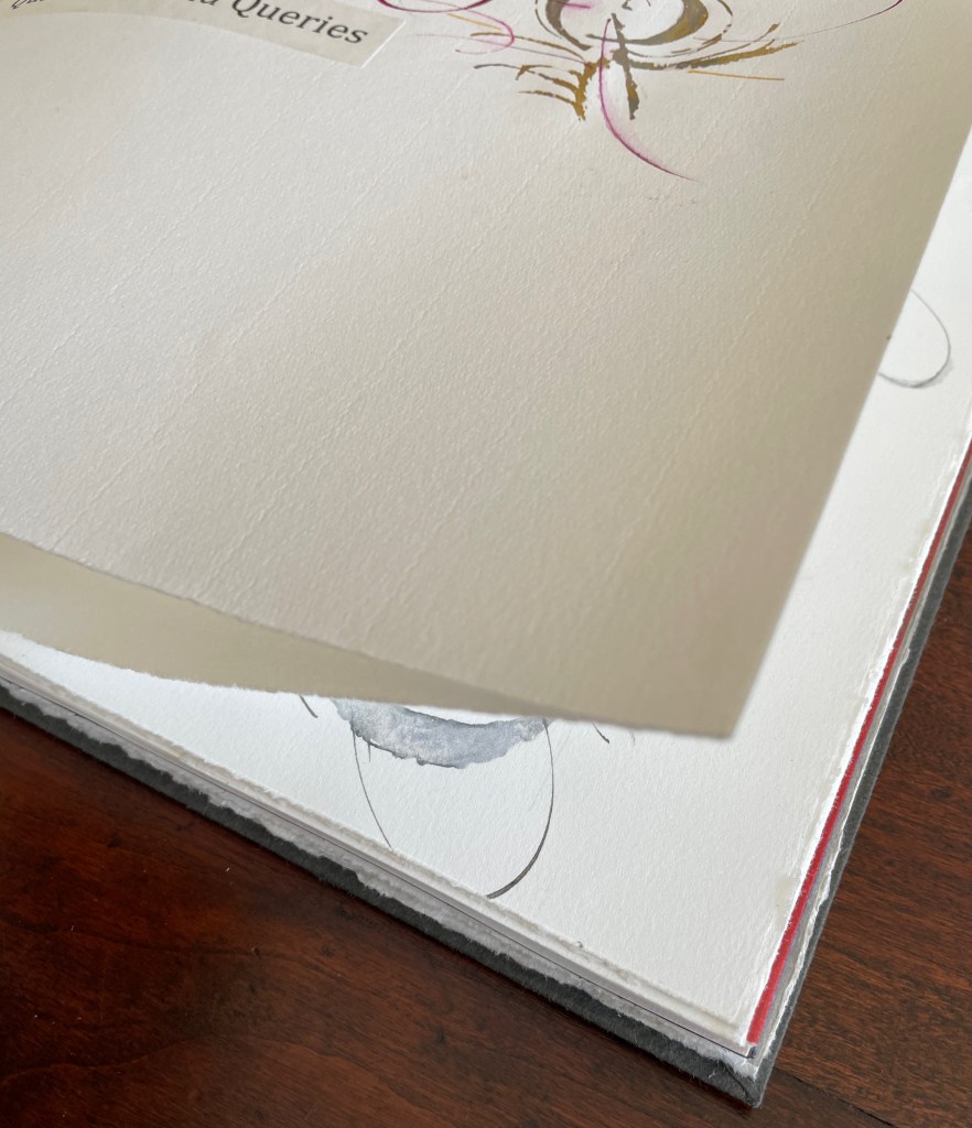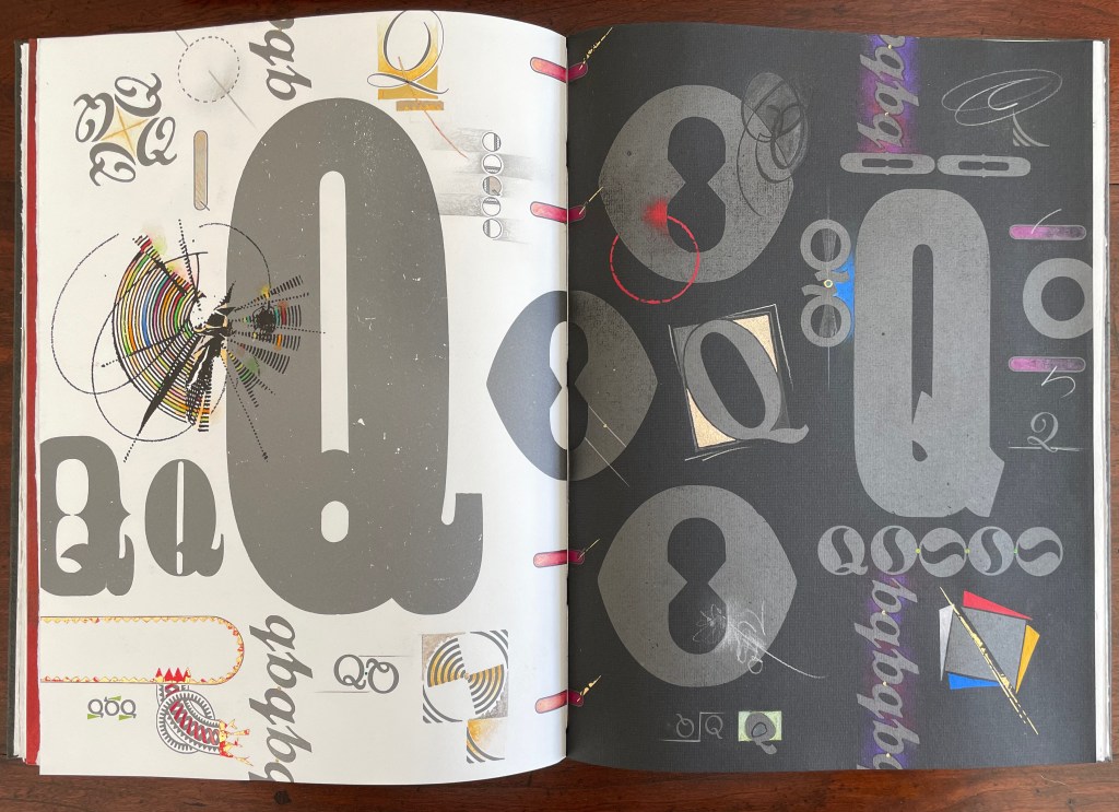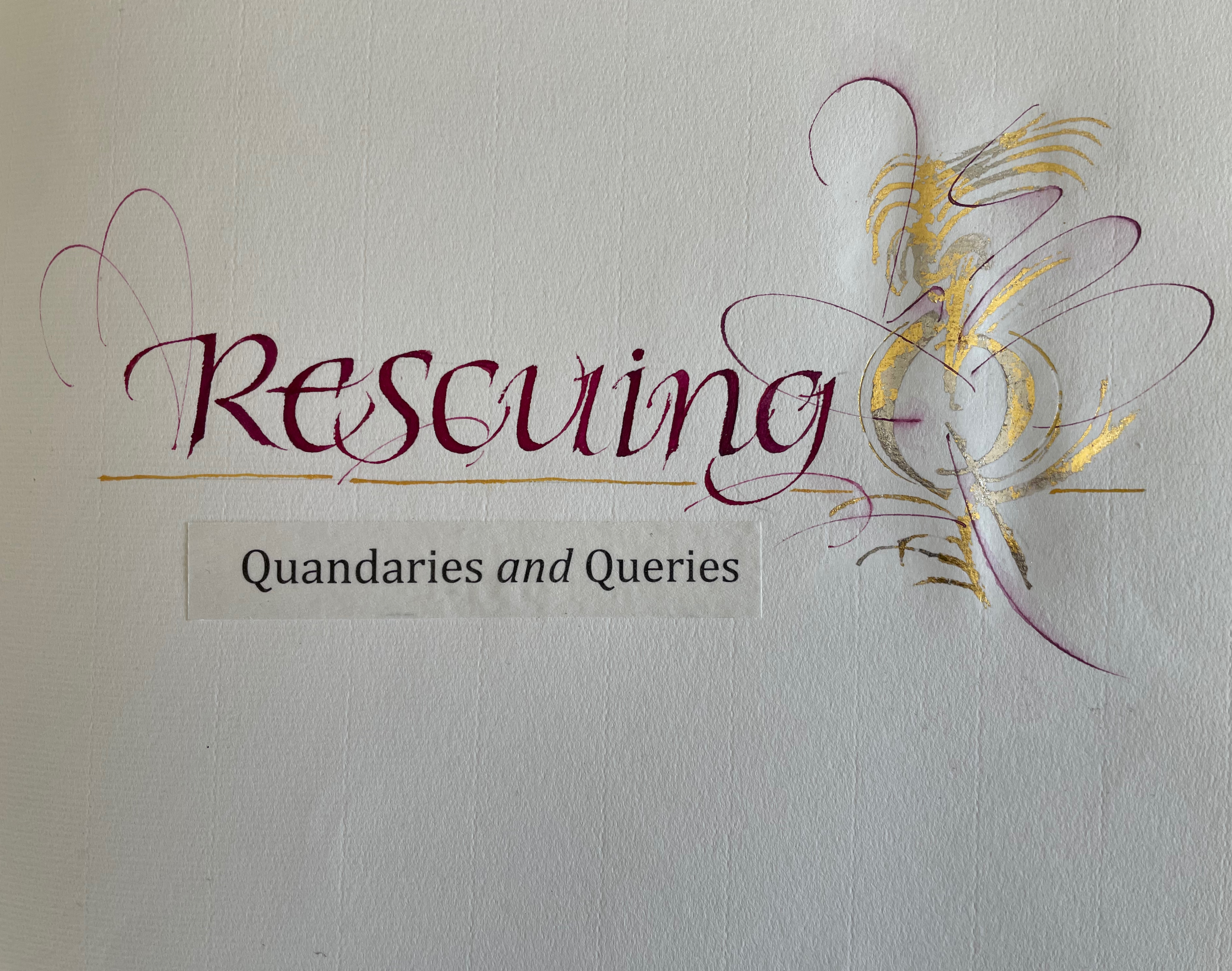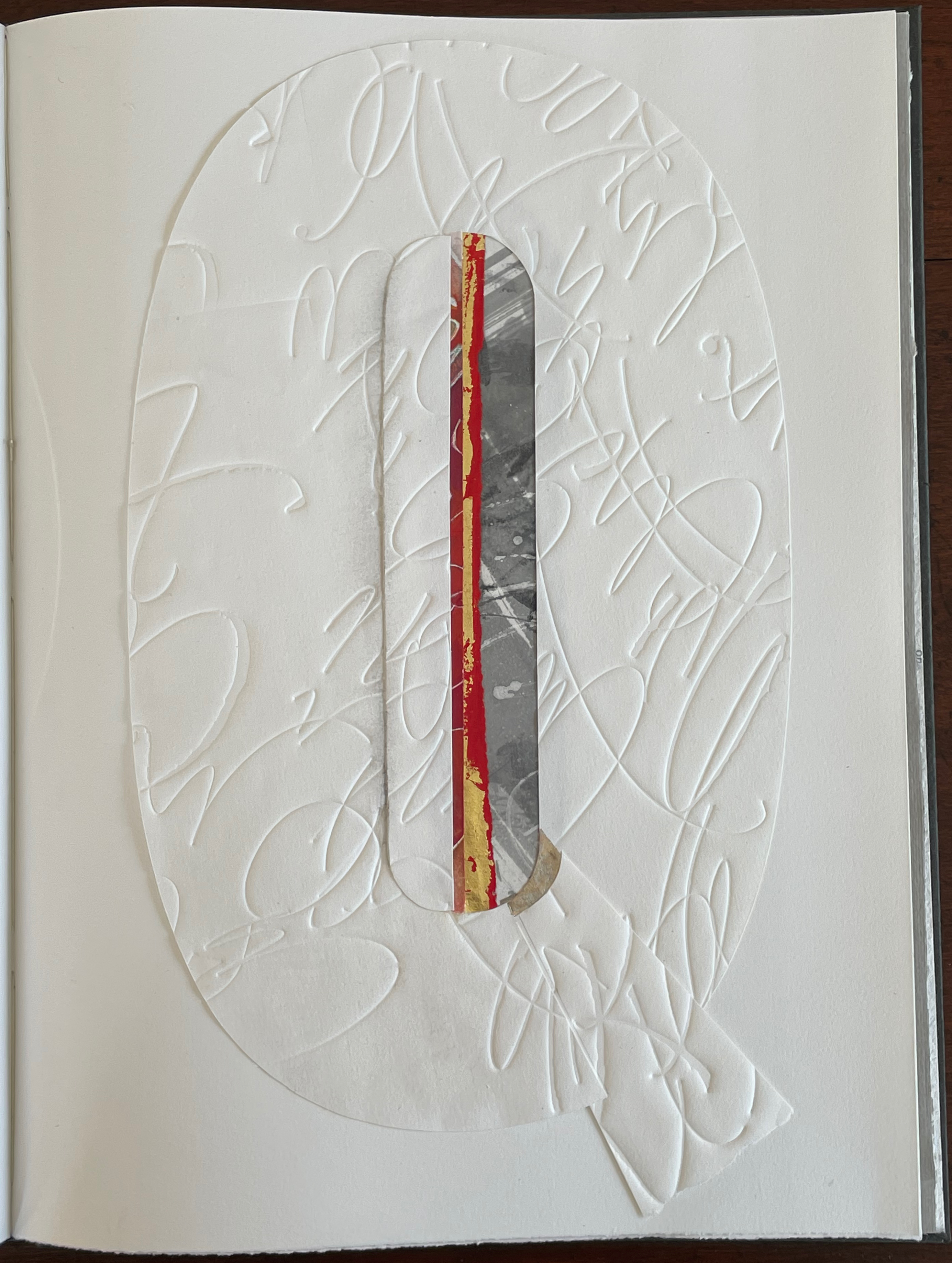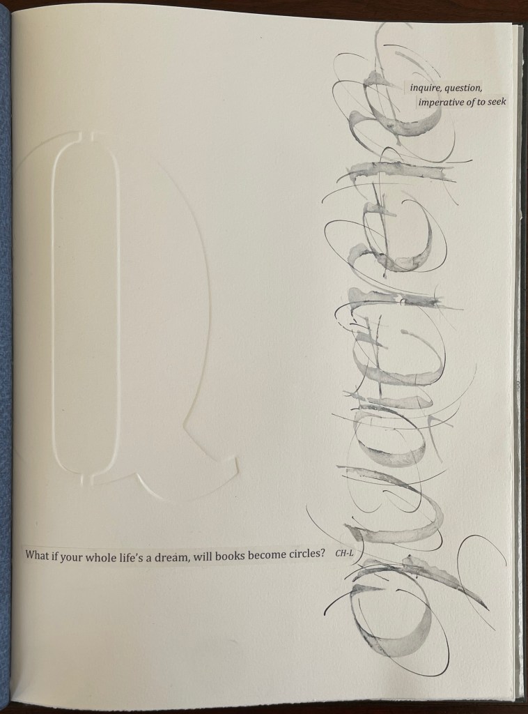 Rescuing Q is a manuscript book, consisting of original paintings, monoprints, collage, pigmented prints, embossing, debossing, gilding and handwork complementing the letterpress printing. It is one of several such works designed and created by Suzanne Moore after more than 20 years of experimentation.