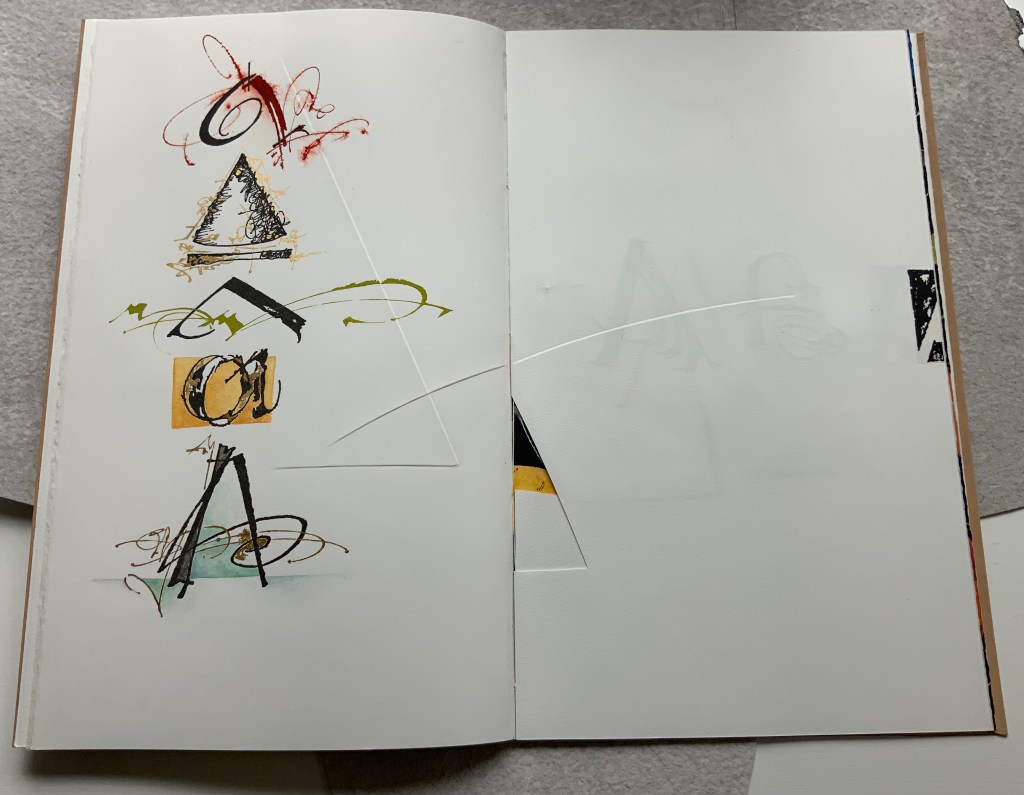 When the recto page above with its debossed line and angle is turned, another extraordinary integration of composition, paper, printing (inking, debossing and “embossing”) and, now, cutting occurs. Notice how the ink of the first and third As overlaps the now “embossed” angle, how the now “embossed” line becomes debossed as it crosses the gutter, how the previous double-page spread’s themes of geometry/freehand, printing/drawing and lowercase/uppercase likewise cross over, and how the cutout triangle uses the yellow ink showing through to form the crossbar of an A and the gutter to form the A’s lefthand stem.