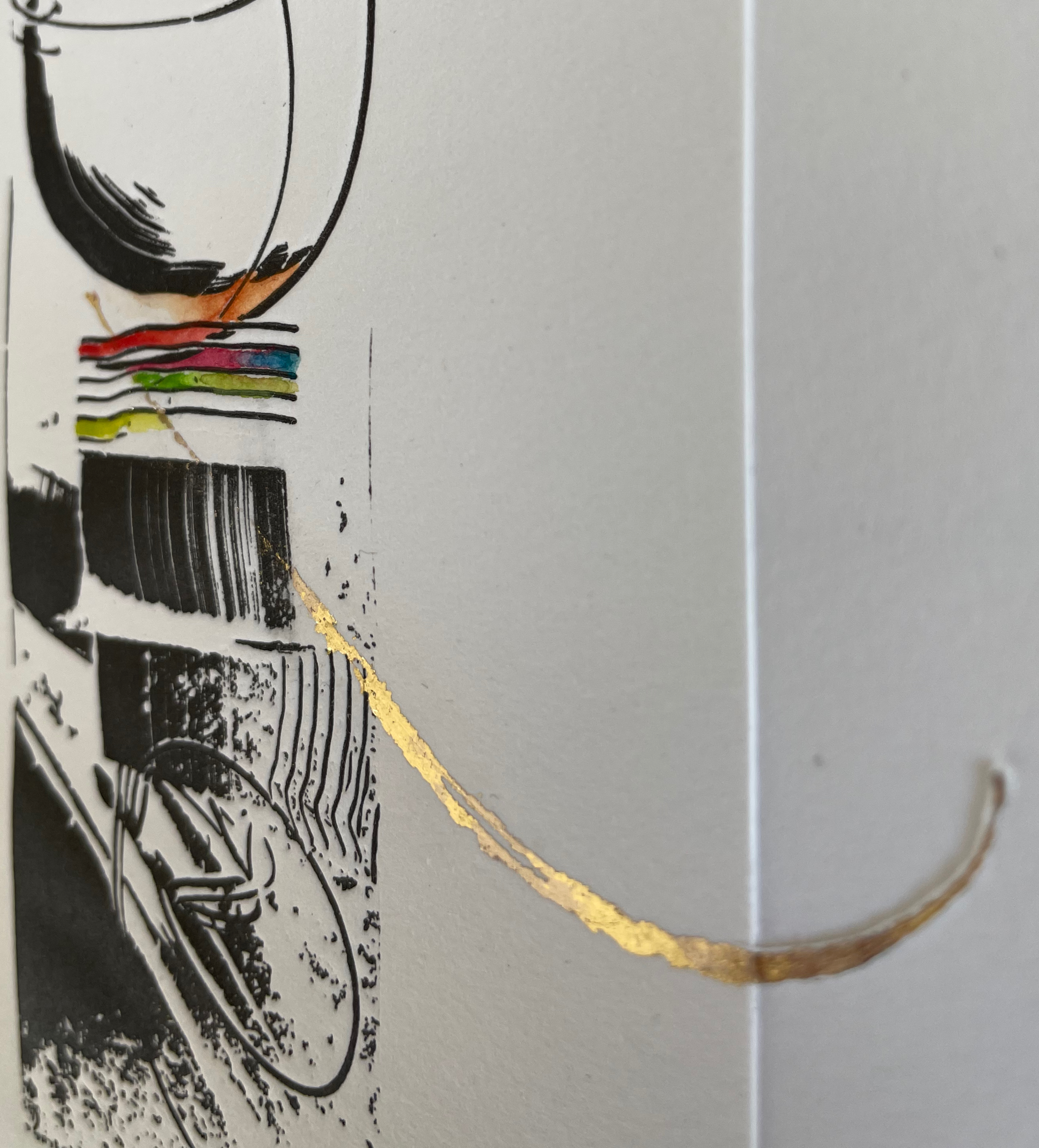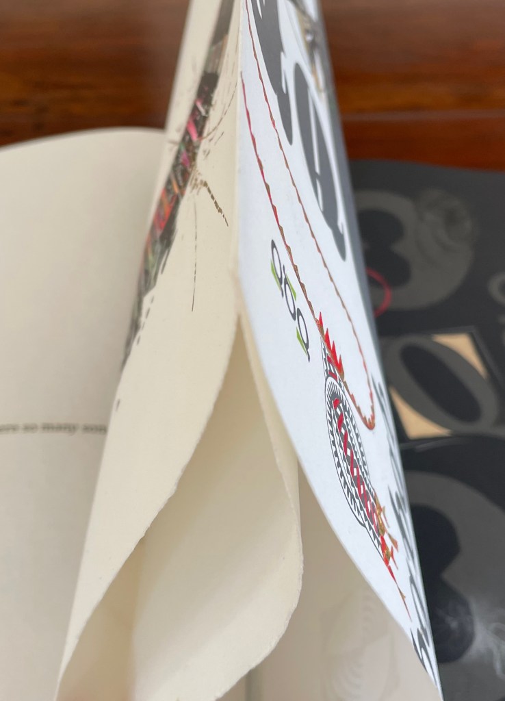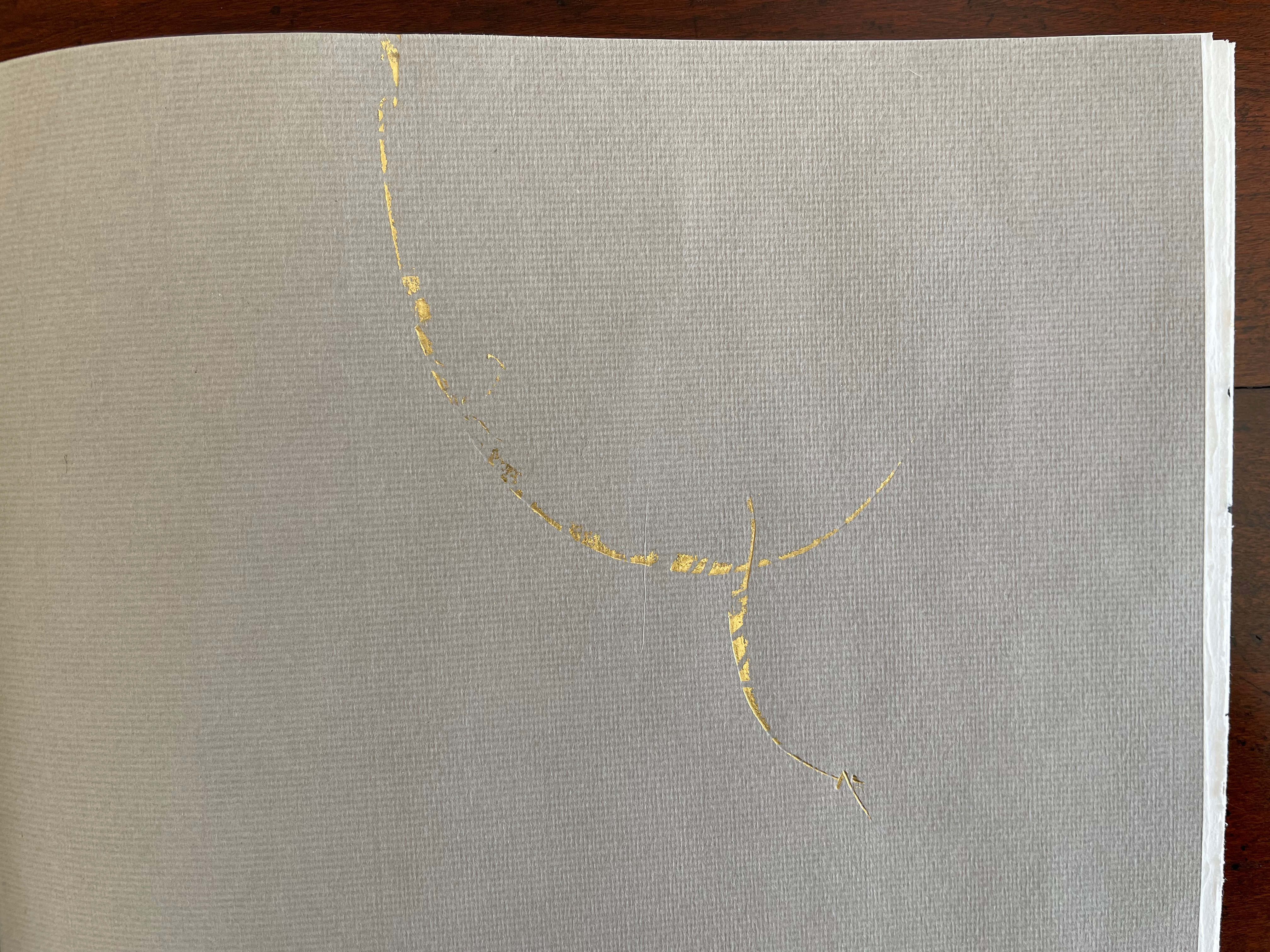 For most readers though, the question that will be uppermost is “How did she do that?” Moore is quick in her generosity and would insist on amending that question to “How did they do that?” Consider the selection of paper. More than Arches (a laid paper with visible mesh and watermark) had to be considered for these interactions of ink, gouache, gold leaf, palladium, debossing/embossing by etching press and hand, cuts and overlays.