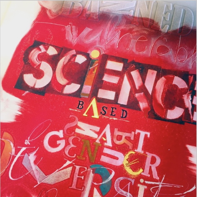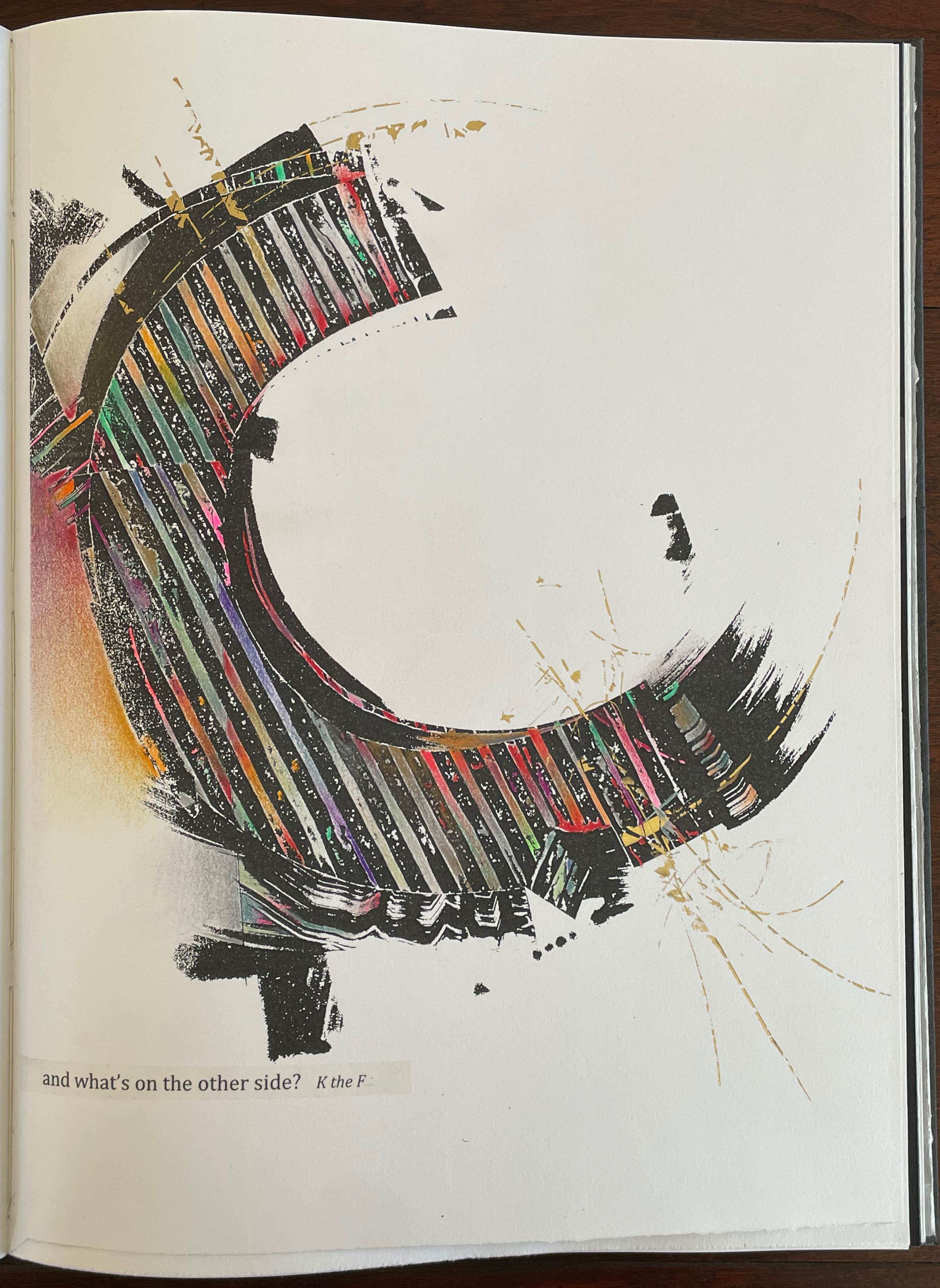 And when the page turns, notice how its gilt crossbar reveals its red paper beneath and becomes the spot of red completing the crossbar for the cutout A. The red spot against white seems to set off the explosion of color and calligraphy on the black final page, printed by Jessica Spring from polymer. The different shapes for A here come from African alphabets. The images are unique monoprints, done on an etching press. With the letters placed to block out the black and overlap one another, a sense of depth and texture arises. Contributing to that sense of texture, the white letters are hand-painted in gouache — sometimes layered, sometimes blended.
