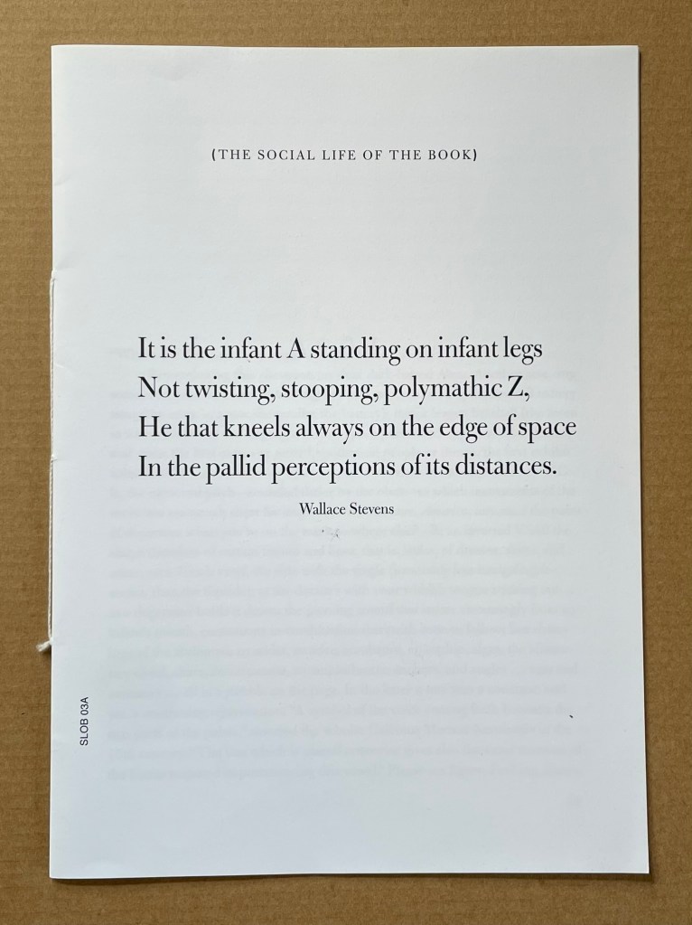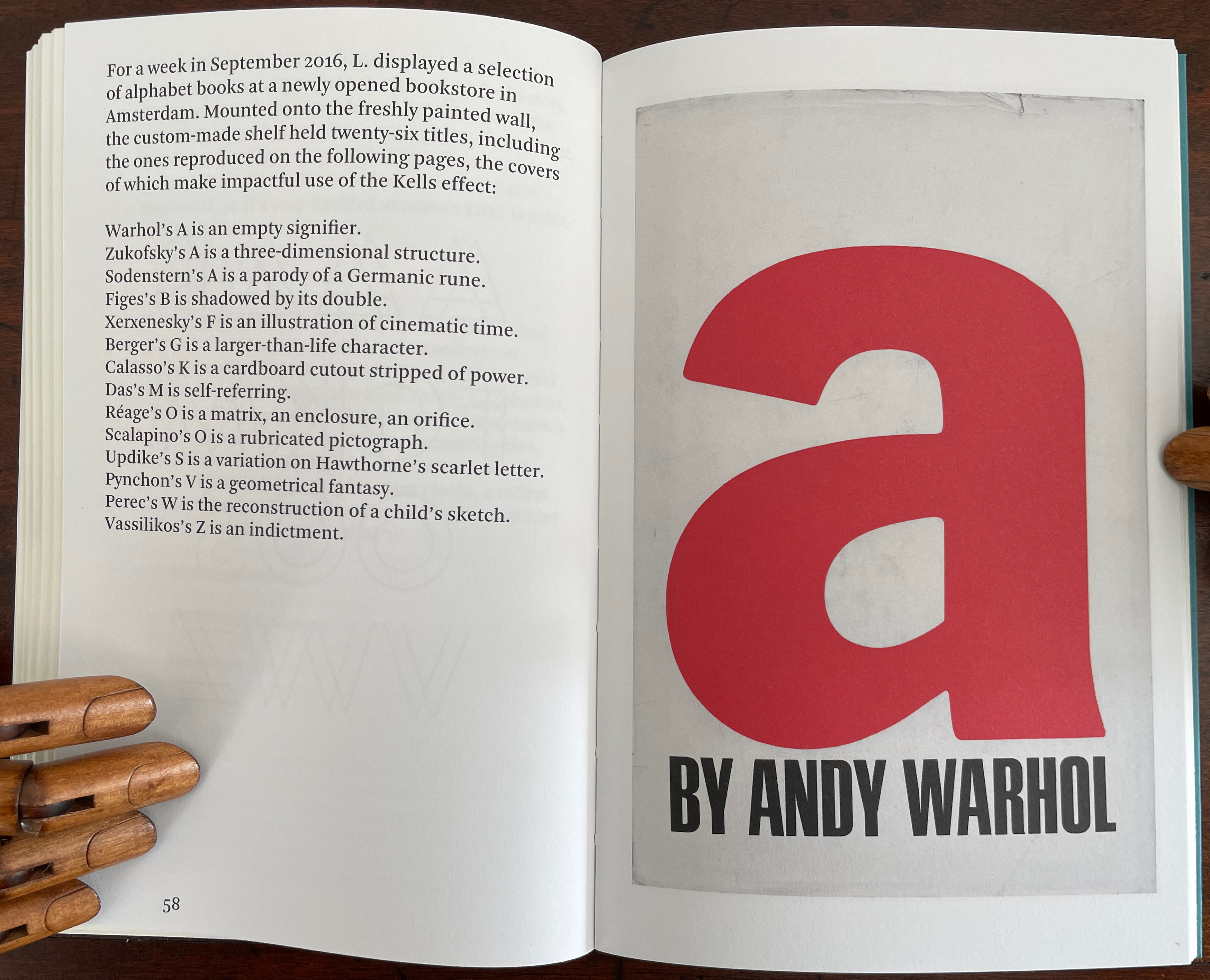 Infant A is part of a collection of essays commissioned by castillo/corrales and published by Paraguay Press under the series title The Social Life of the Book. Lüthi’s contribution fits the Books On Books Collection on several scores. First is the epigram’s invocation of the alphabet, which echoes the collection’s concentration of alphabet-related artists’ books and children’s books. See Alphabets Alive! Second is the epigram’s source: Wallace Stevens, whose poetry has inspired Ximena Pérez Grobet’s Words (2016). Would that other book artists be so inspired. Third is the narrator’s fictional conversation with Ulises Carrión in a celebration of all things A-related, in particular Andy Warhol’s novel a: a novel (1968), which finds analogues in Warren Lehrer’s A Life in Books: The Rise and Fall of Bleu Mobley (2013) and Derek Beaulieu’s a, A Novel by Andy Warhol (2017) (entry in progress). Fifth is how the dialogue reminds me of Suzanne Moore’s A Musings (2015).