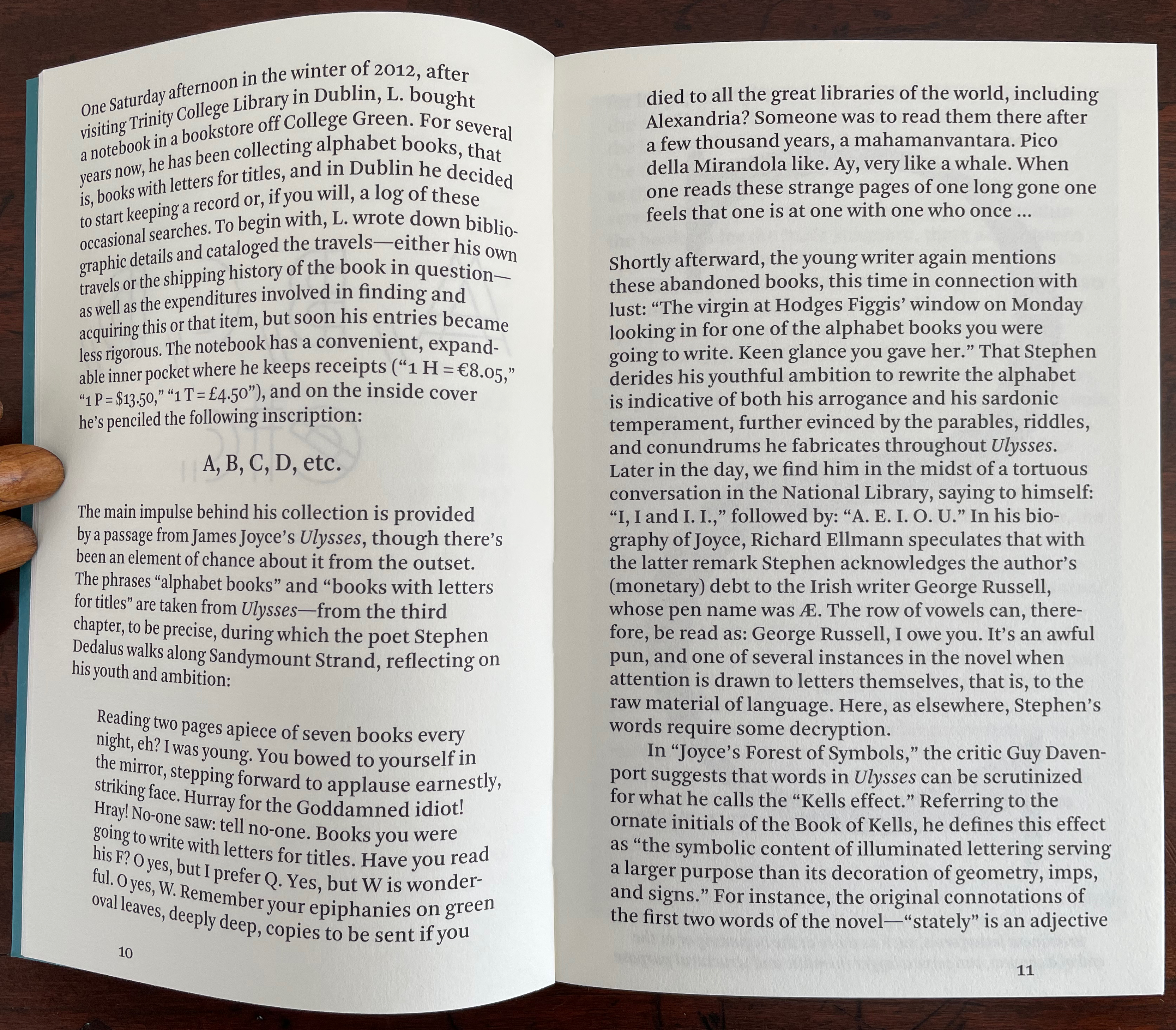 Publisher’s website: In A Die with Twenty-Six Faces, the author — let’s call him L. — guides the reader through his collection of alphabet books, that is, books with letters for titles. Some of these titles are well known: Andy Warhol’s “a,” Louis Zukofsky’s “A”, Georges Perec’s W. Others are obscure, perhaps even imaginary: Zach Sodenstern’s A, Arnold Skemer’s C and D. Tracing connections between these books, L. elaborates on what the critic Guy Davenport has called the “Kells effect”: “the symbolic content of illuminated lettering serving a larger purpose than its decoration of geometry, imps, and signs.”