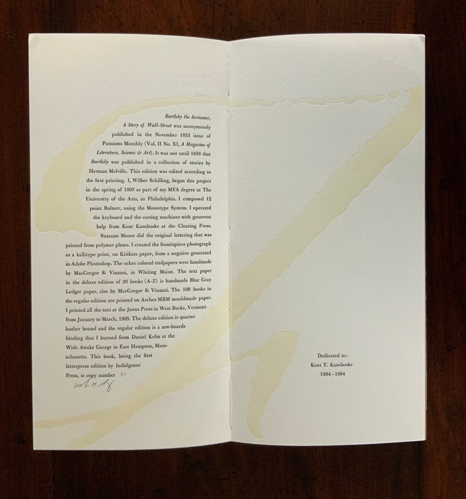 Adamson, Chris T. 11 August 2014. “Bartleby, the Scrivener: A Story of Wall Street, by Herman Melville, Indulgence Press (1995)”. Books and Vines. Accessed 14 January 2020.