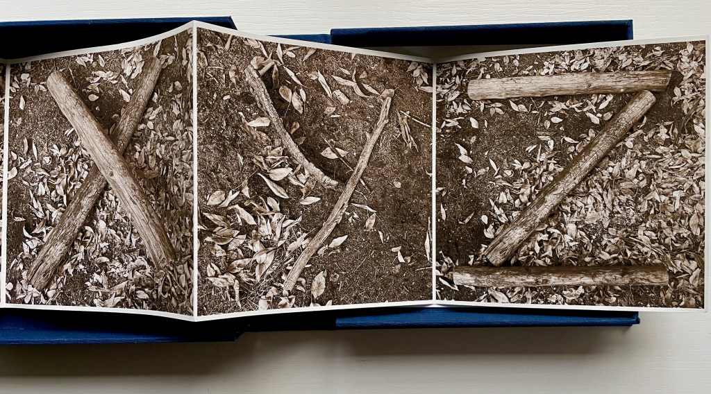 Reading Macken’s book will sharpen the ability of any reader or viewer to appreciate book art, especially her Ise Jingū: Beginning Repeated. Ise Jingū is a Shinto shrine complex in the Mie Prefecture, Japan. “Once every 20 years, since … the seventh century, every fence and building is completely rebuilt on an identical adjoining site, a practice of transposition known as shikinen-zōkan” (Binding Space, p. 101). For Macken, this ritualistic rebuilding poses architecture as performative process rather than as inert object; it “manifests the replication of a beginning, of a process” (p. 100).
