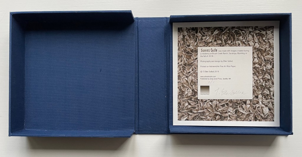 Source Code (2019) Ellen Sollod Cloth- covered clamshell box with image tipped on holds a leporello book with a loose colophon sheet laid in. Book: H5.5 x W5.5 x D1 inches closed; W154″ open. Unique edition. Acquired from Vamp&Tramp Booksellers, 7 October 2022. Photos: Courtesy of the artist; Books On Books Collection.