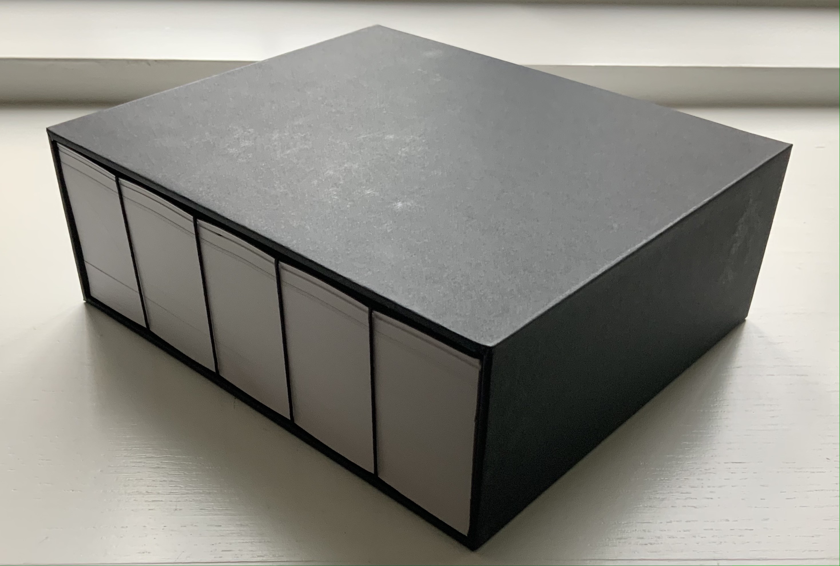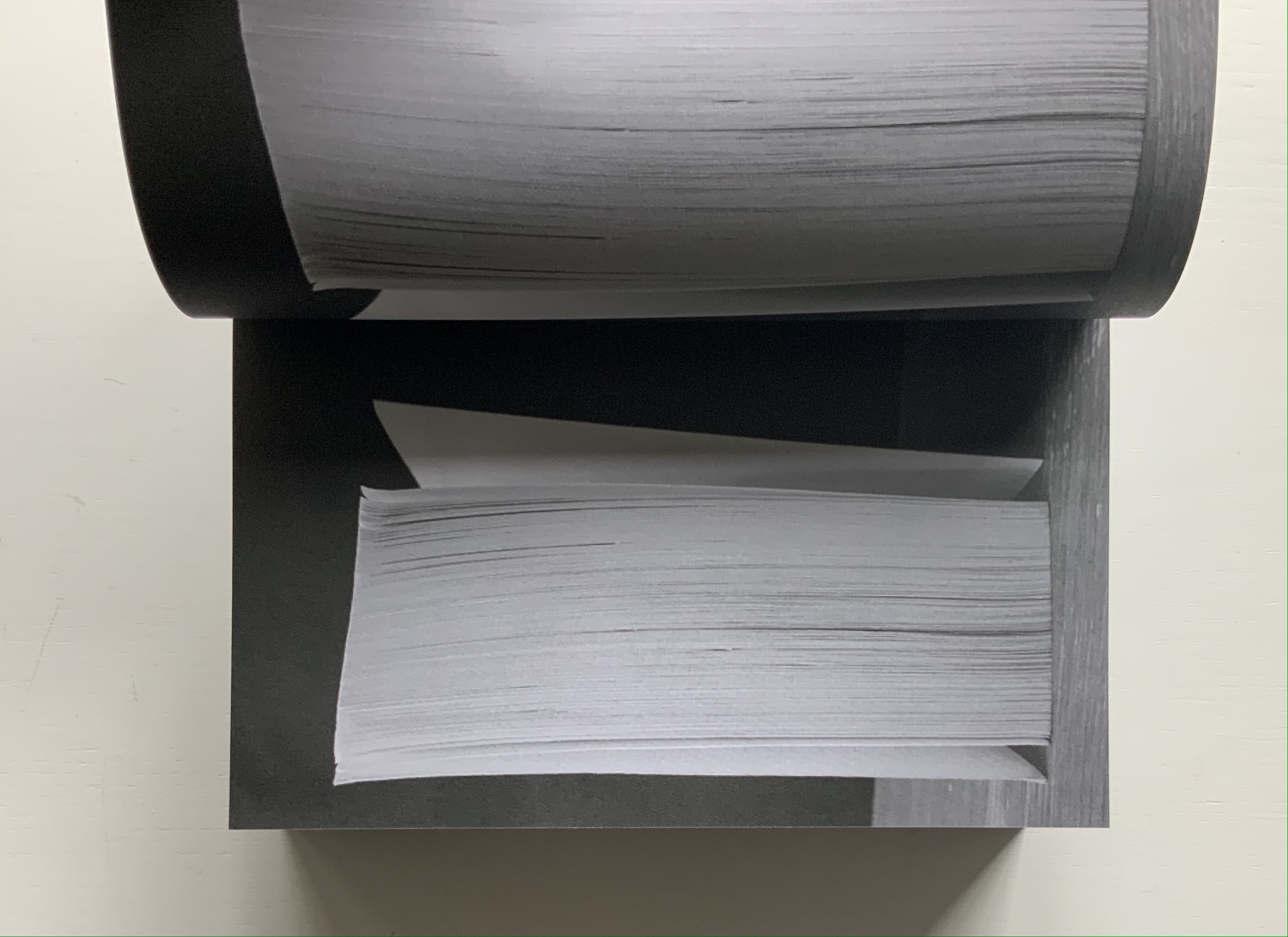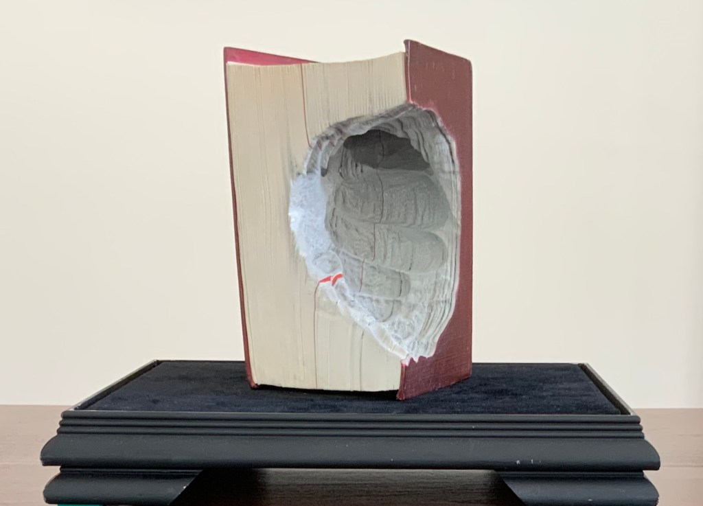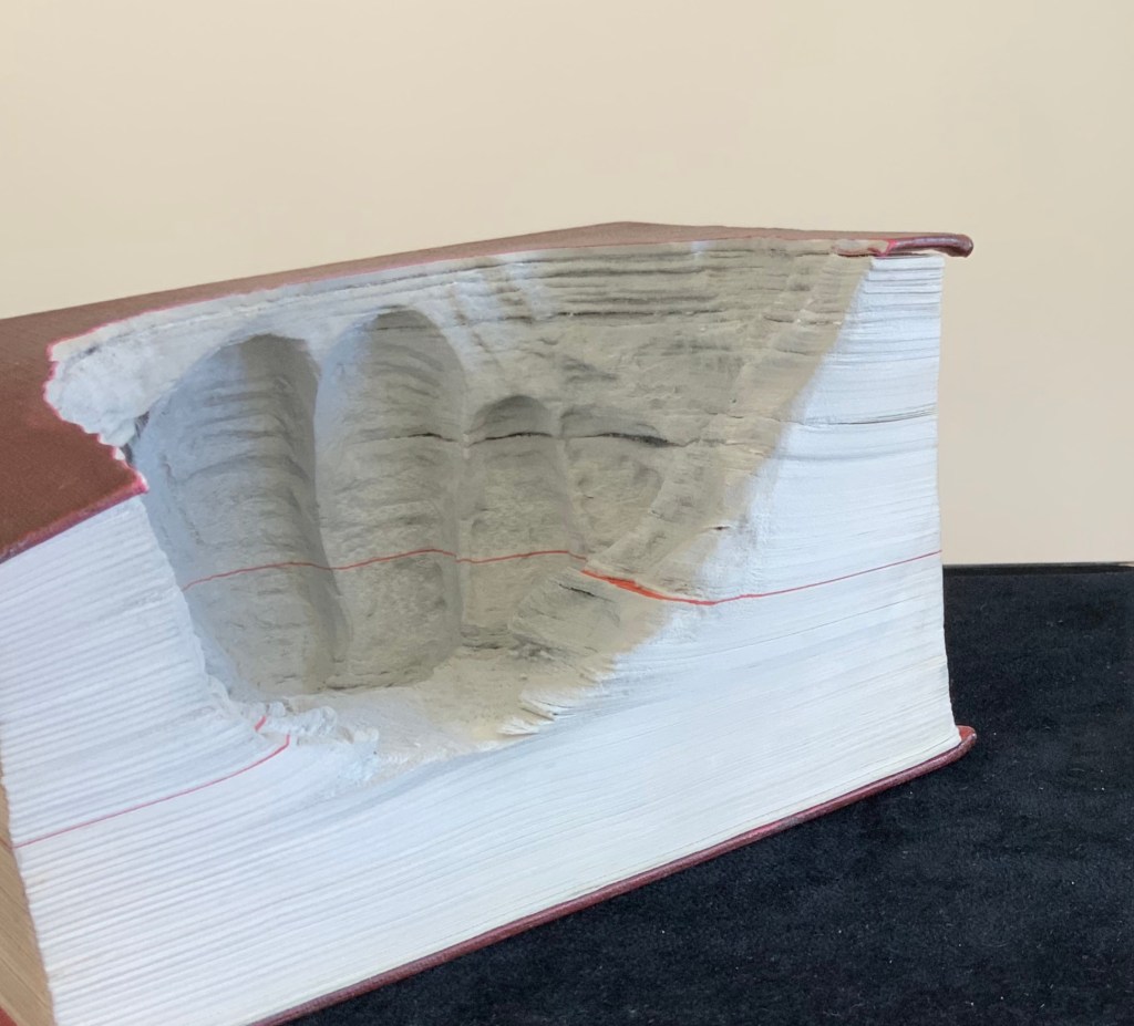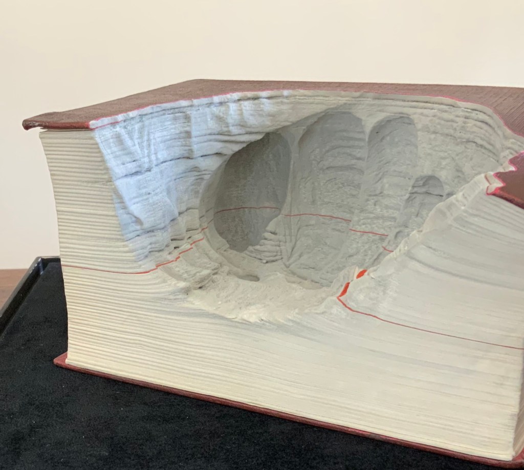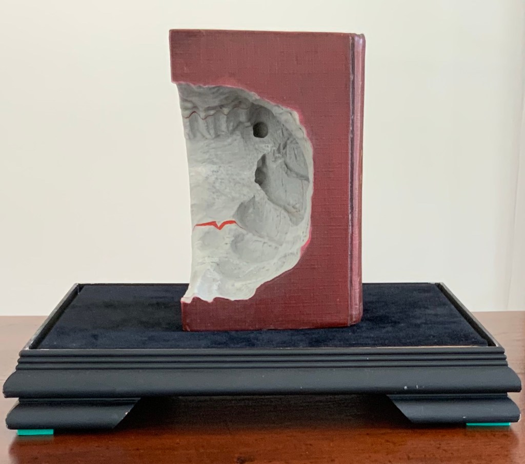 Lüthi’s work is just one in the Books on Books collection of several inspired by Tristram Shandy. There is Erica Van Horn’s Born in Clonmel (2011), Simon Morris’ Do or DIY (2012), Abra Ancliffe’s The Secret Astronomy of Tristram Shandy (2015), and Shandy Hall‘s The Black Page Catalogue (2010), Emblem of My Work (2013), Paint Her To Your Own Mind (2018) and The Flourish of Liberty (2019). Outside the collection, there is Brian Dettmer’s Tristram Shandy (2004), commissioned by Shandy Hall’s Laurence Sterne Trust, and also Sean Silver’s Shandean online venture called The Motley Emblem (2022~) celebrating Sterne’s marbled leaf and the analytical chemistry of marbling. The latter may become a book, even an artist’s books to add to the tally. In The Century of Artists’ Books, Johanna Drucker draws attention to Sterne’s novel twice as an example of self-reflexivity or self-interrogation, but in 1994 and 2004, Sterne did not rise to the same level of precursor to book artists as William Blake or Stéphane Mallarmé in Drucker’s view. With these later works of book art inspired by Uncle Toby’s nephew in the bag, a dozen or so more might nudge Sterne up the scale.