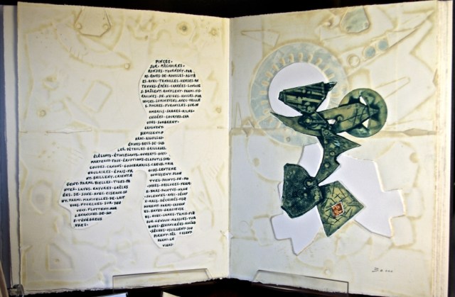 Spector’s essays are tonic. His comments on Margaret Wharton’s bookworks could refresh any reader and viewer lucky enough to see her works (Union League Club-Chicago or Yale) or remind the viewer of them when looking at works by later artists such as Thomas Wightman or the “Mystery Book Artist of Edinburgh”. In the past few months, Walter Hamady and John Baldessari have died, and Spector’s essays on them bring them both and particular works of theirs to present life. His essay and letter on Broodthaers would enhance any reading of the artists who have stood on Broodthaers’ shoulders to address Mallarmé’s Un Coup de Dés: Bennequin, Mutel, Pichler, Wyn Evans, Zboya. The essay “Going Over the Books” may have inspired Alden’s curation of ‘The Library of Babel” exhibition.