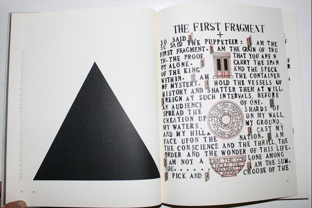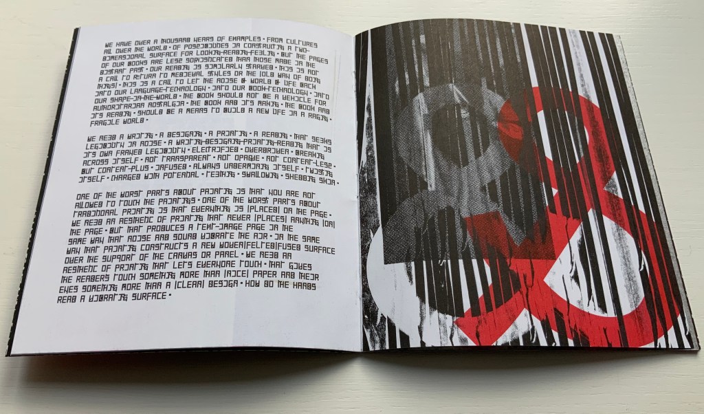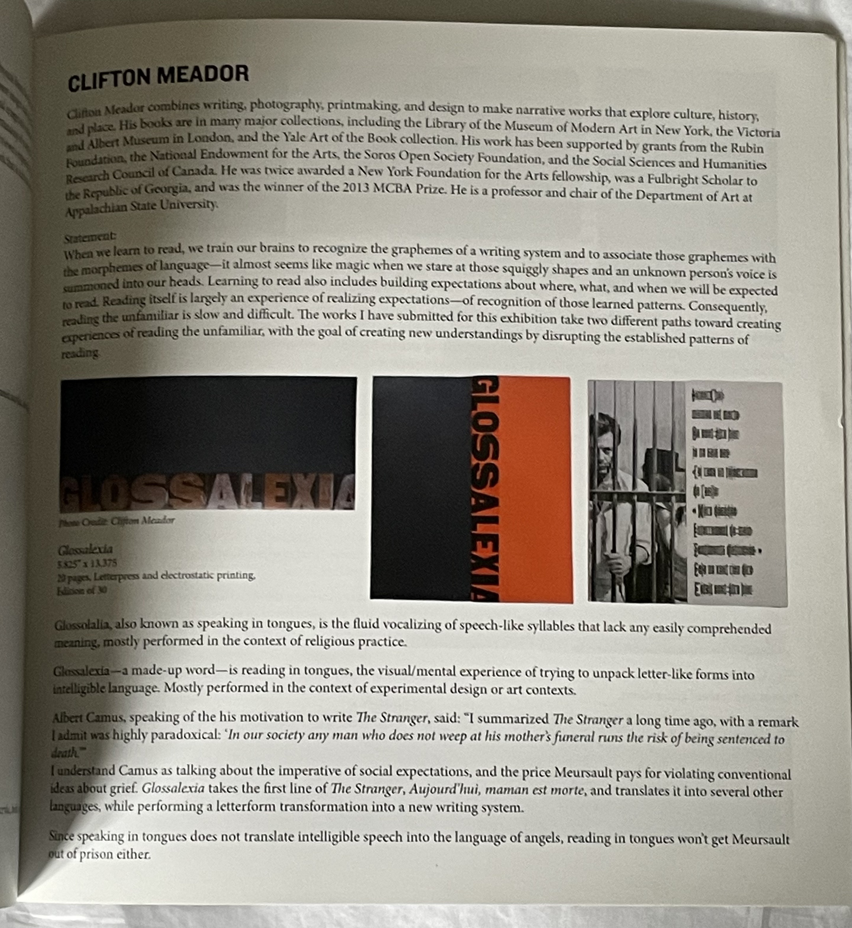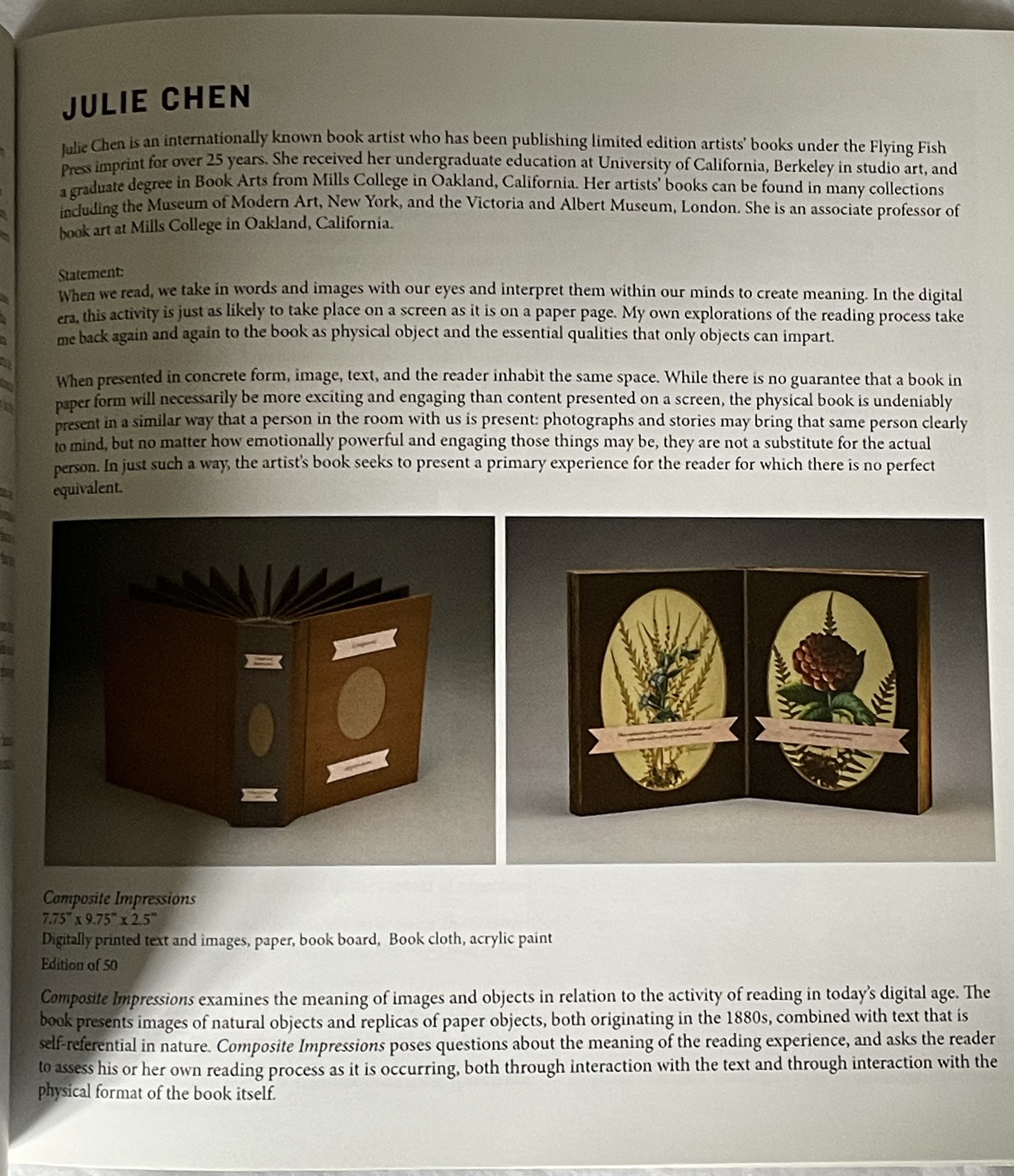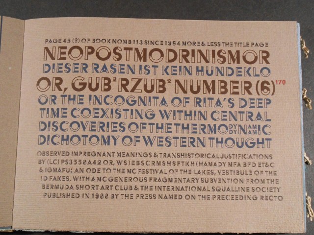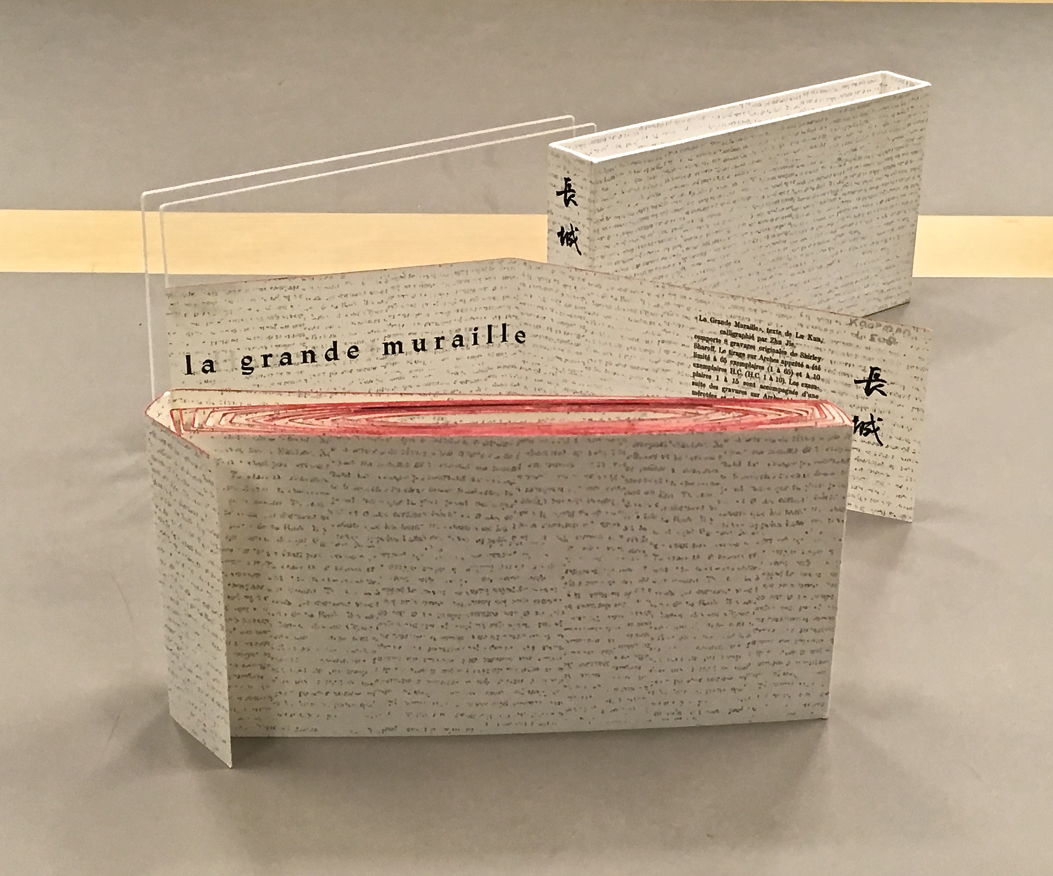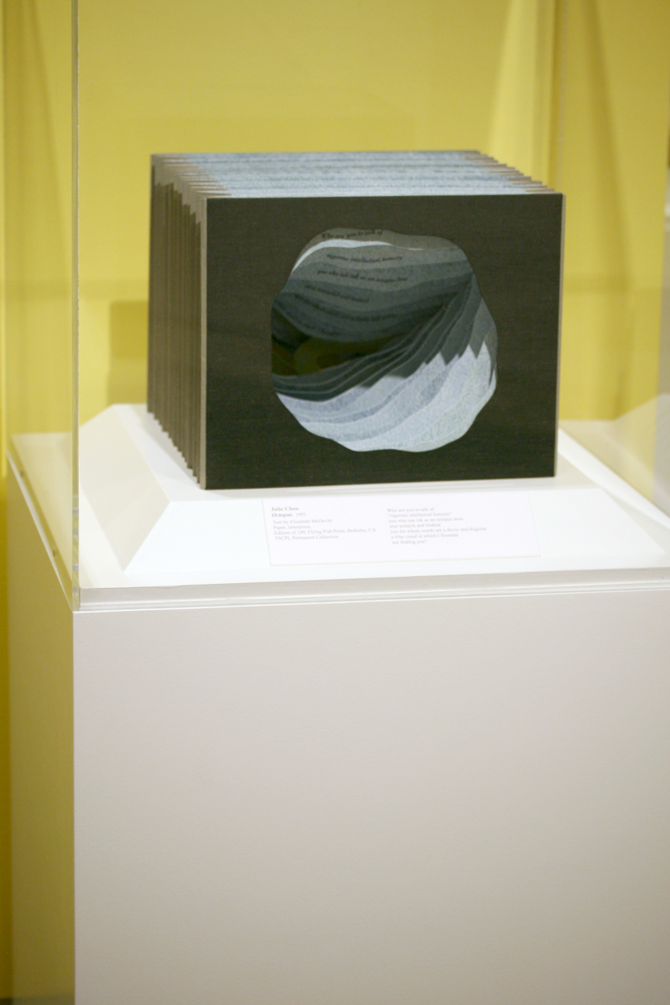 But a viewer standing in the “brutalist” construct of the Regenstein Library and holding the finished catalogue might have asked, “What makes these objects I cannot touch — or, in some cases even if I could, cannot read — art?” There is the catalogue’s third chime. From the start, book art has faced a constant definitional or identity crisis and even the challenge “but is it art?” The catalogue’s title echoes Lucy Lippard’s Duchampian proposition: “It’s an artist book if an artist made it, or if an artist says it is”. The catalogue’s design says, “This is the gallery, these are the objects on display in it, they are art”.