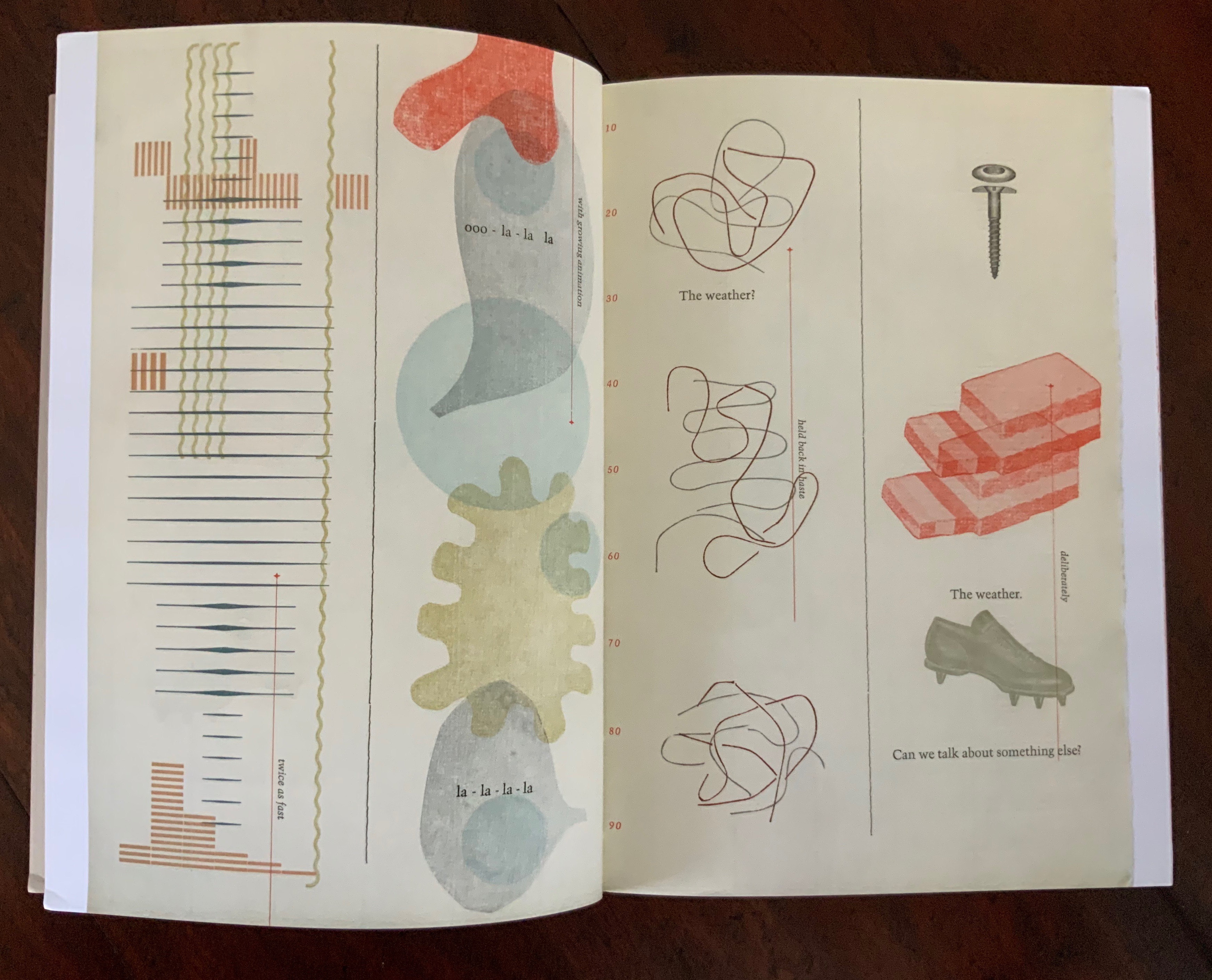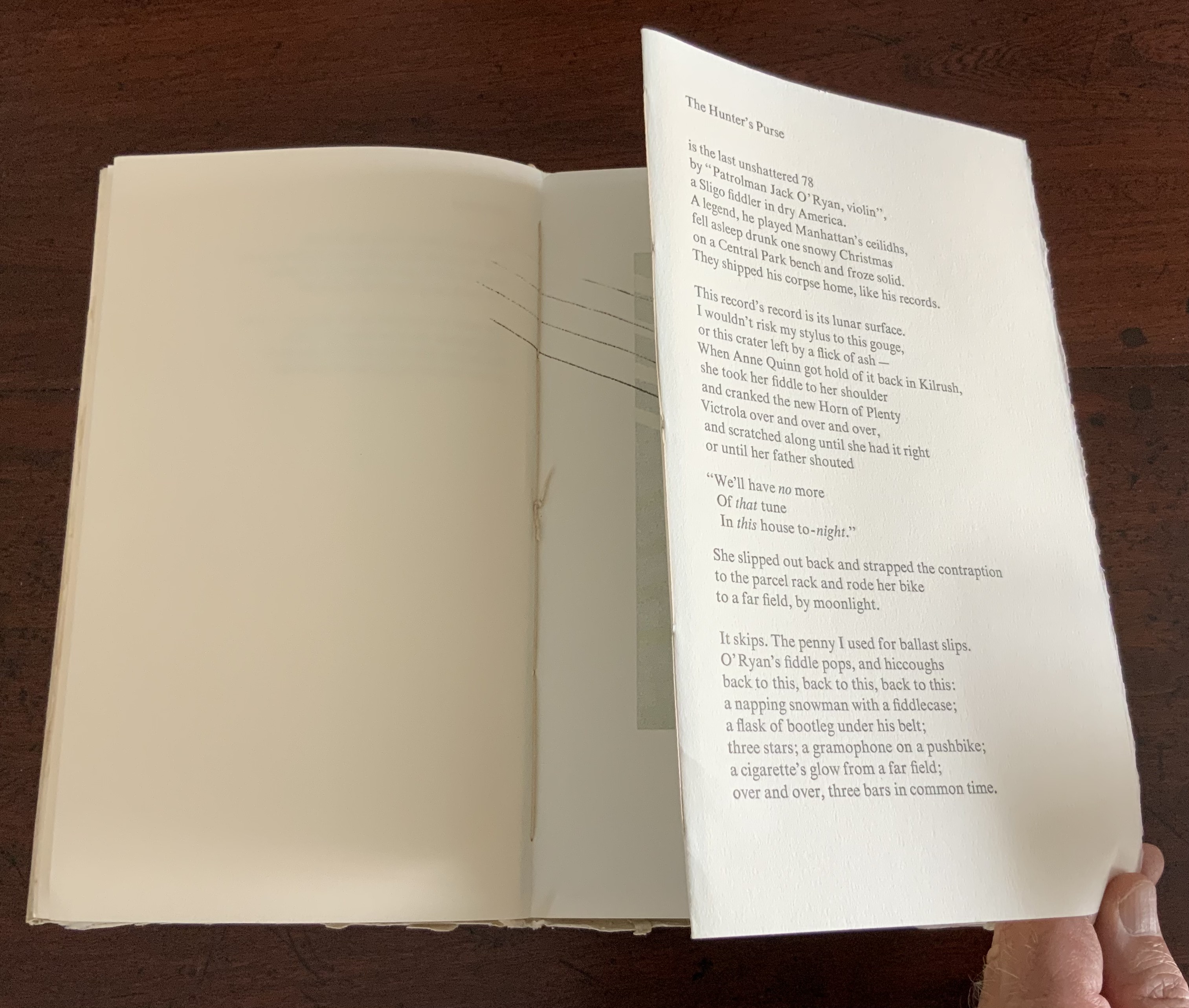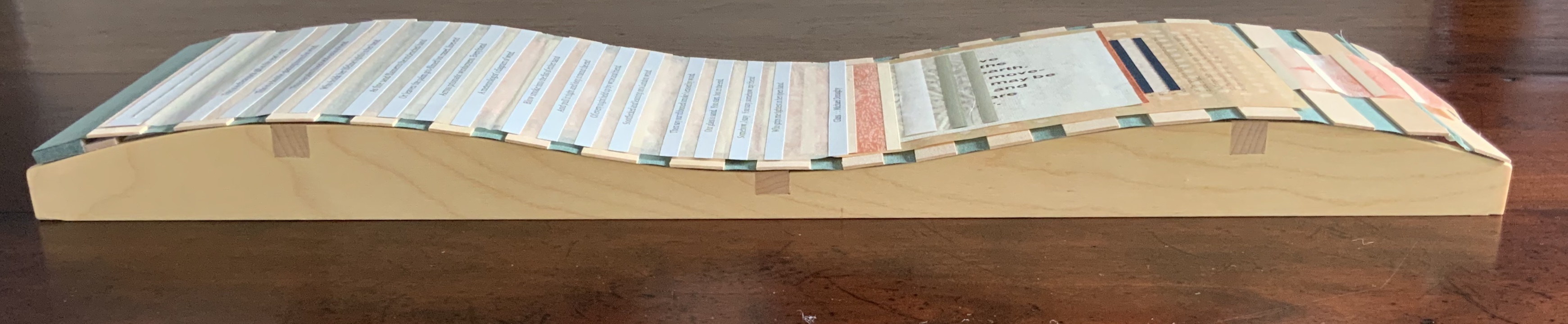 While Abt’s introductory essay rings the historical changes on the roots of book art — once there was Mallarmé’s Un Coup de Dés Jamais N’Abolira Le Hasard, but before Mallarmé, there was William Blake — the works included and the catalogue’s design ring some chimes of their own about book art. One way or another, all book art self-consciously draws attention to some particularly bookish element. For the most part, the 49 works listed in this catalogue ring true. The catalogue’s design itself, however, not only chimes to that notion of self-reflexiveness but also to wider notions about the nature of book art within contemporary art.