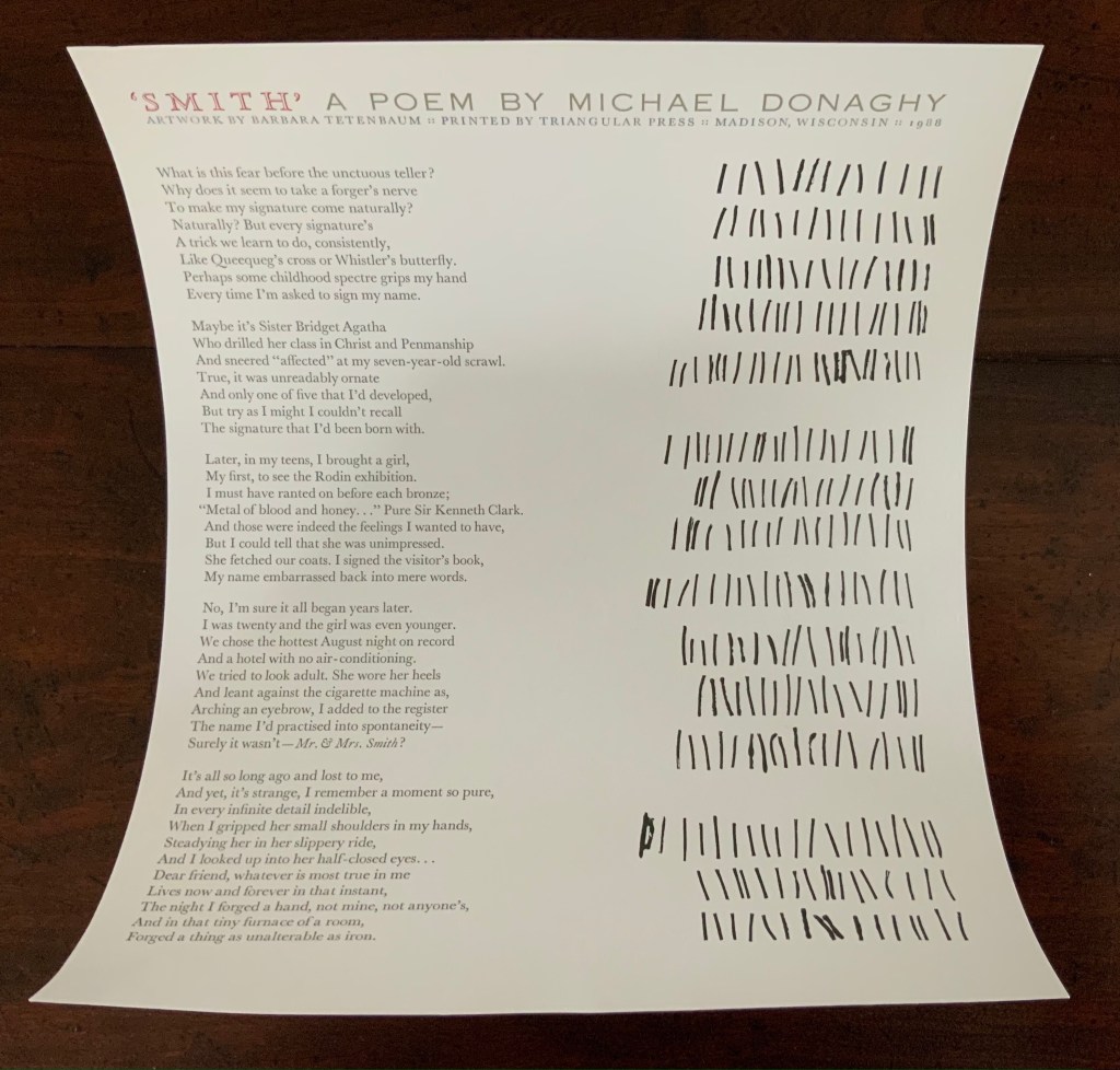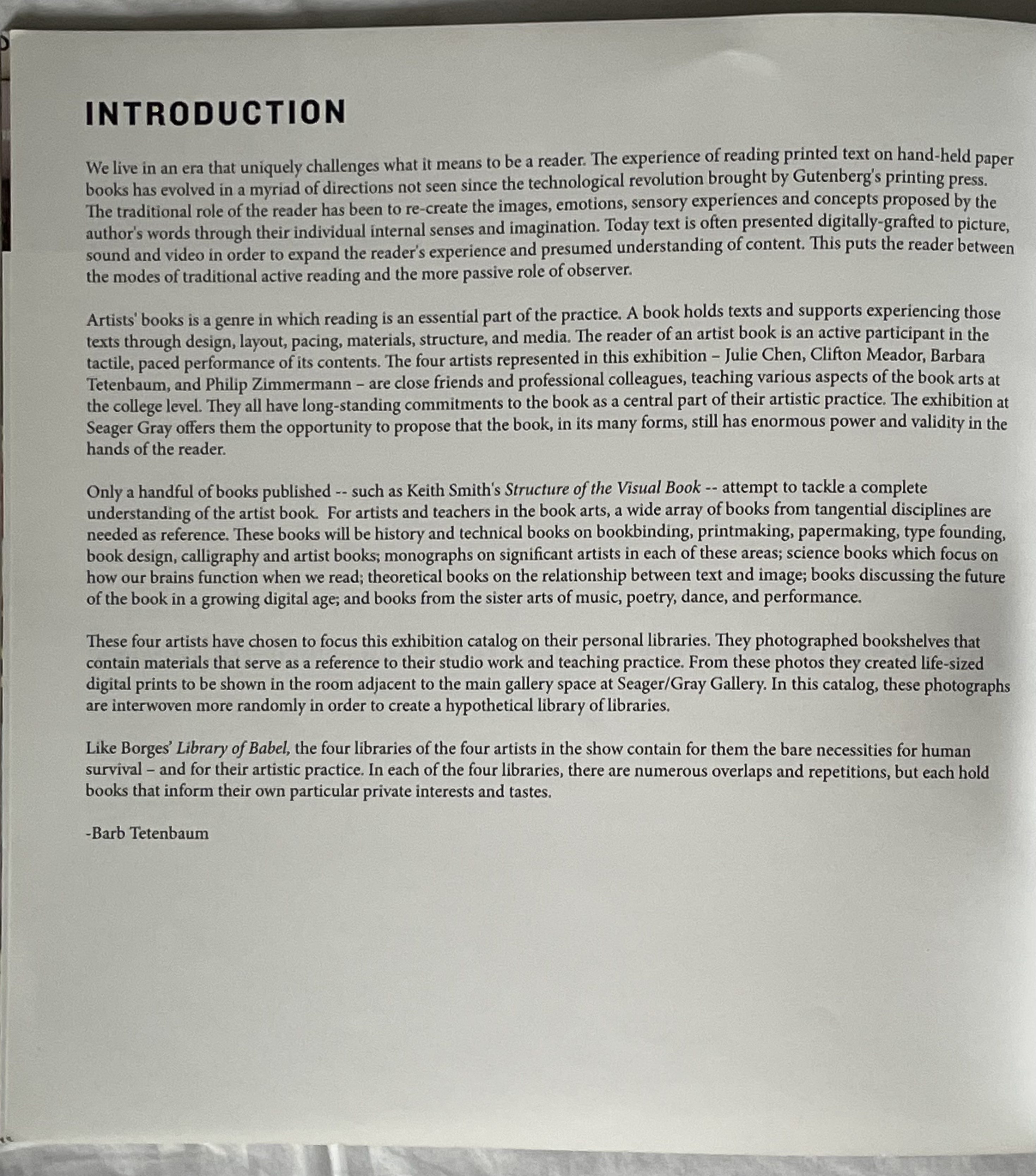 Artist, curator and historian Jeffrey Abt wrote that the “irresistible” idea of placing an exhibition of artists’ books alongside the University of Chicago Library’s collection “broadly representative of the history of the book” started with a visit to famed art dealer Tony Zwicker‘s studio. It was also, however, almost as if he were taking a cue from this statement by artist-printers Betsy Davids and Jim Petrillo just the year before: