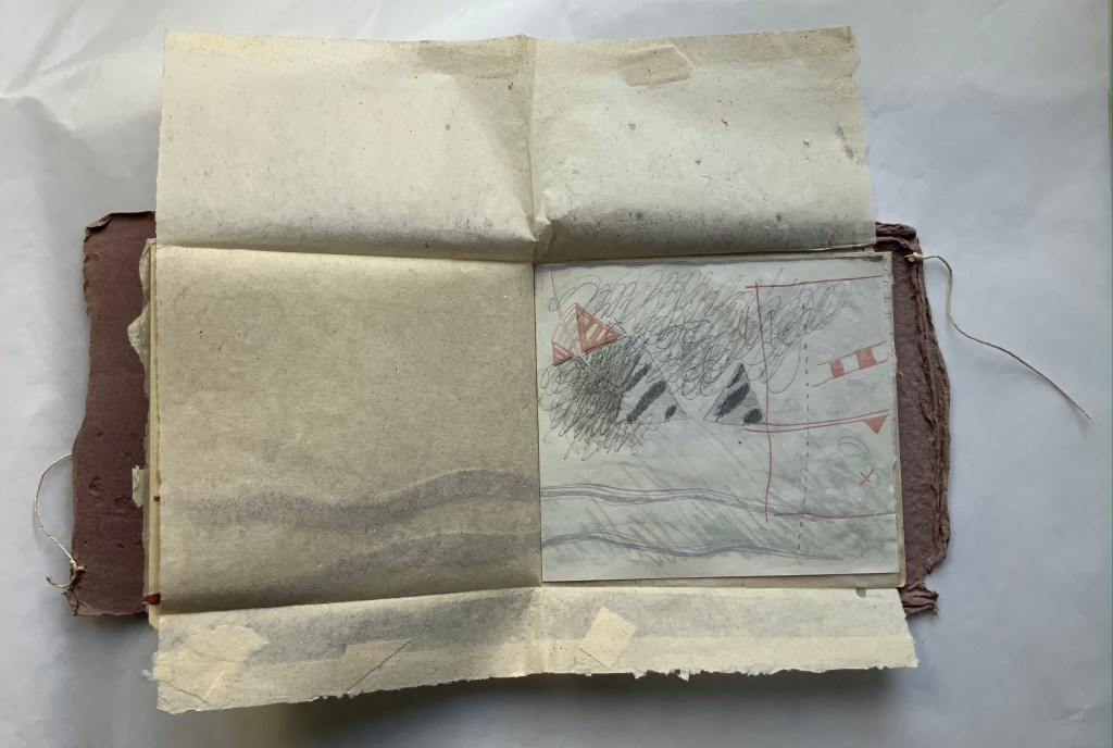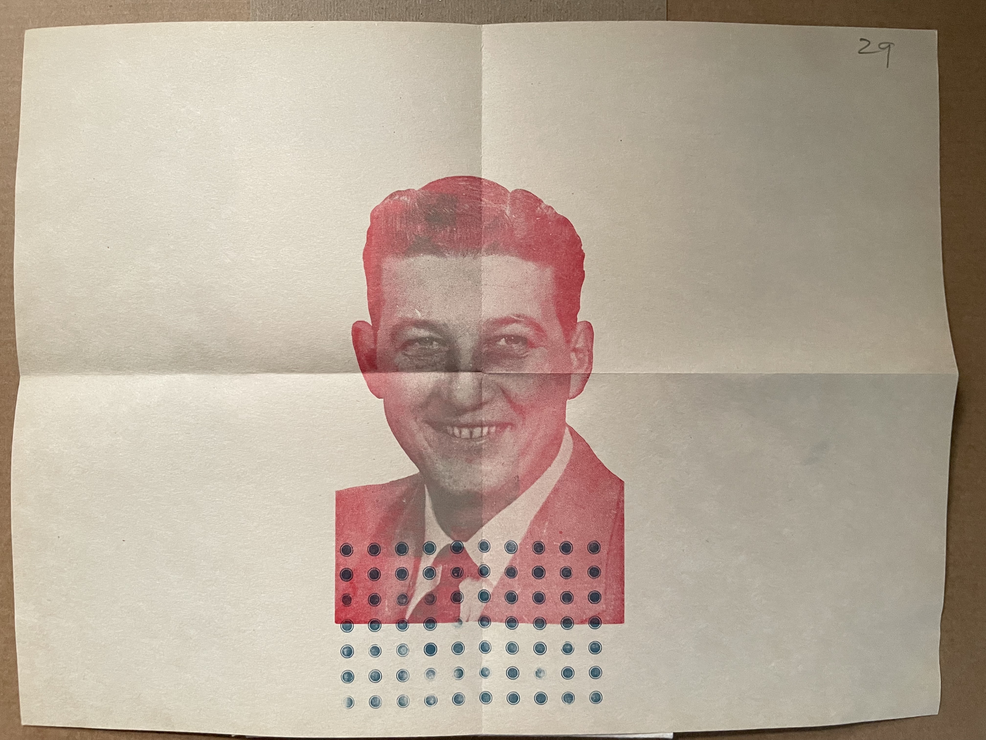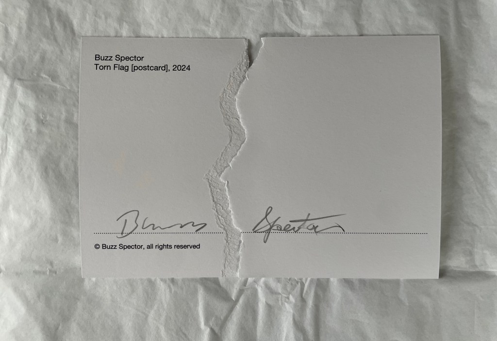 Three items of ephemera conclude this entry. The first is a pristine copy of the announcement for Spector’s retrospective at the Saint Louis Art Museum, held 20 November 2020 through 31 May 31 2021, along with a copy of it with the front cover hand torn by the artist. The second is the catalogue from his show in 2021 Between the Lines. With both, Spector makes an ephemeral piece echo the works in the exhibition. The third item is a hand torn postcard reproducing his drawing Torn Flag (2022).