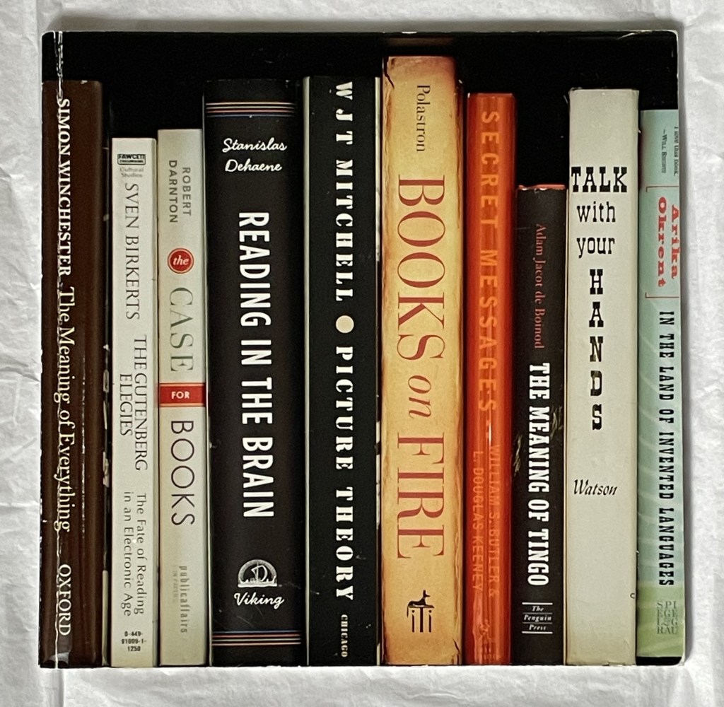 The length of all the publications in my library was 165 feet; the single shelf, at the UCSD Art Gallery, on which they were placed ran 188 feet. That additional space implied a future, and life-affirming, growth of my collection. — Buzz Spector, 26 March 2020.