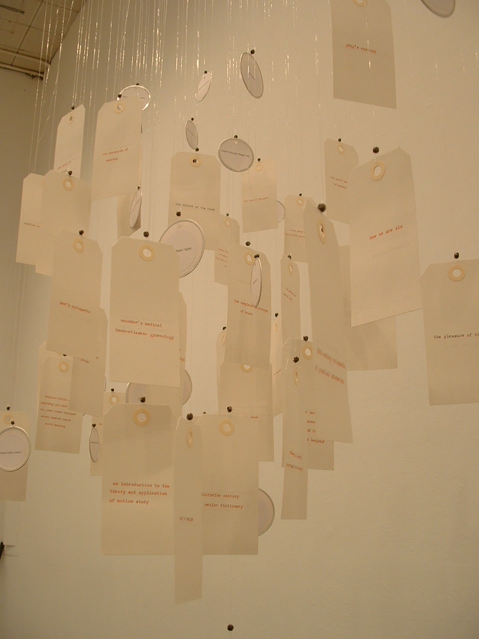 Clearly from his entry in The Library of Babel, Spector’s artistic output extends beyond altered books and catalogue design to larger scale installations. One of the more well-known, Unpacking my Library imposes multiple orders on what Walter Benjamin called “the chaos of memories”. How “multiple orders”? First, because of its subtleties; second, because of its several forms.