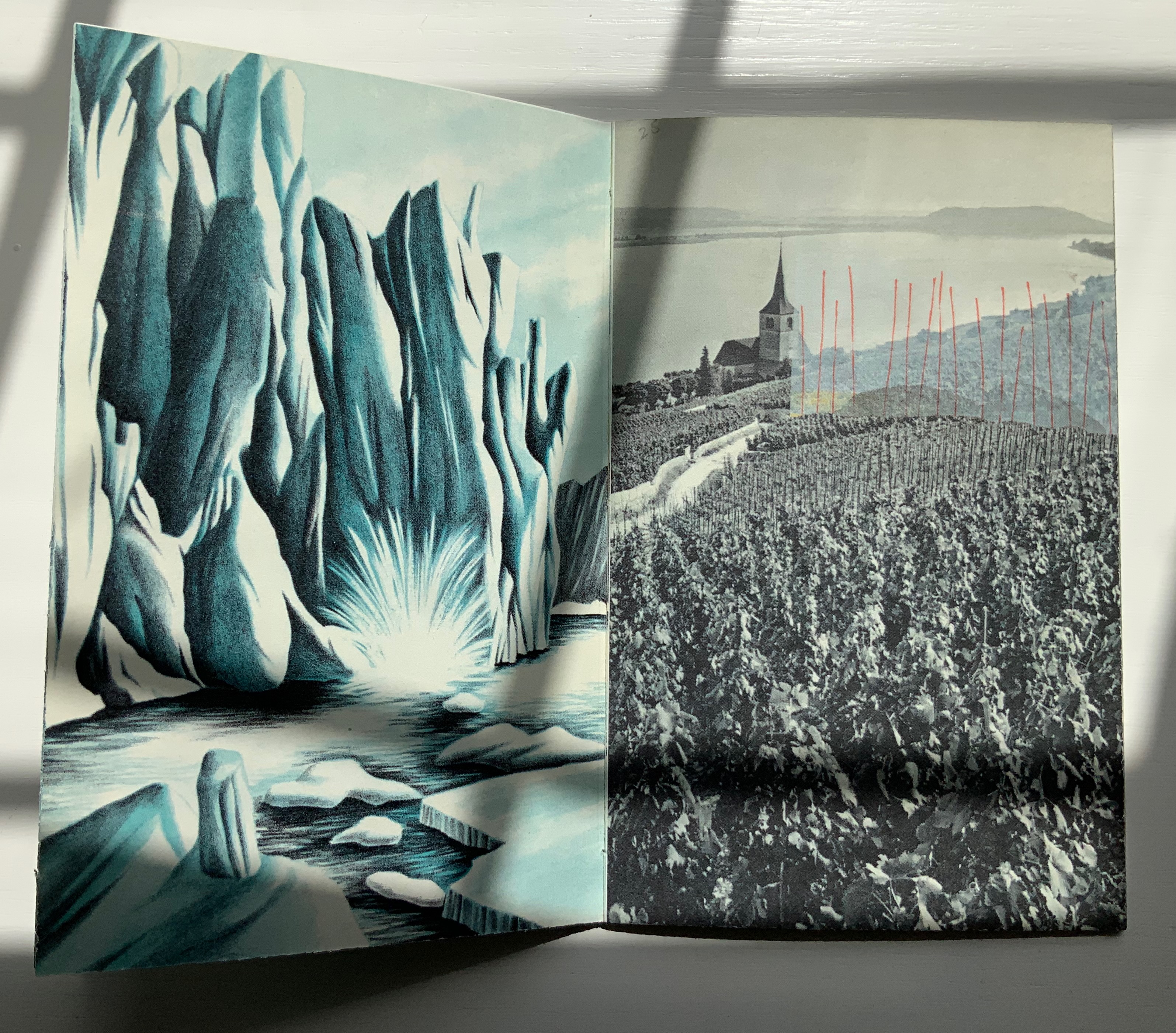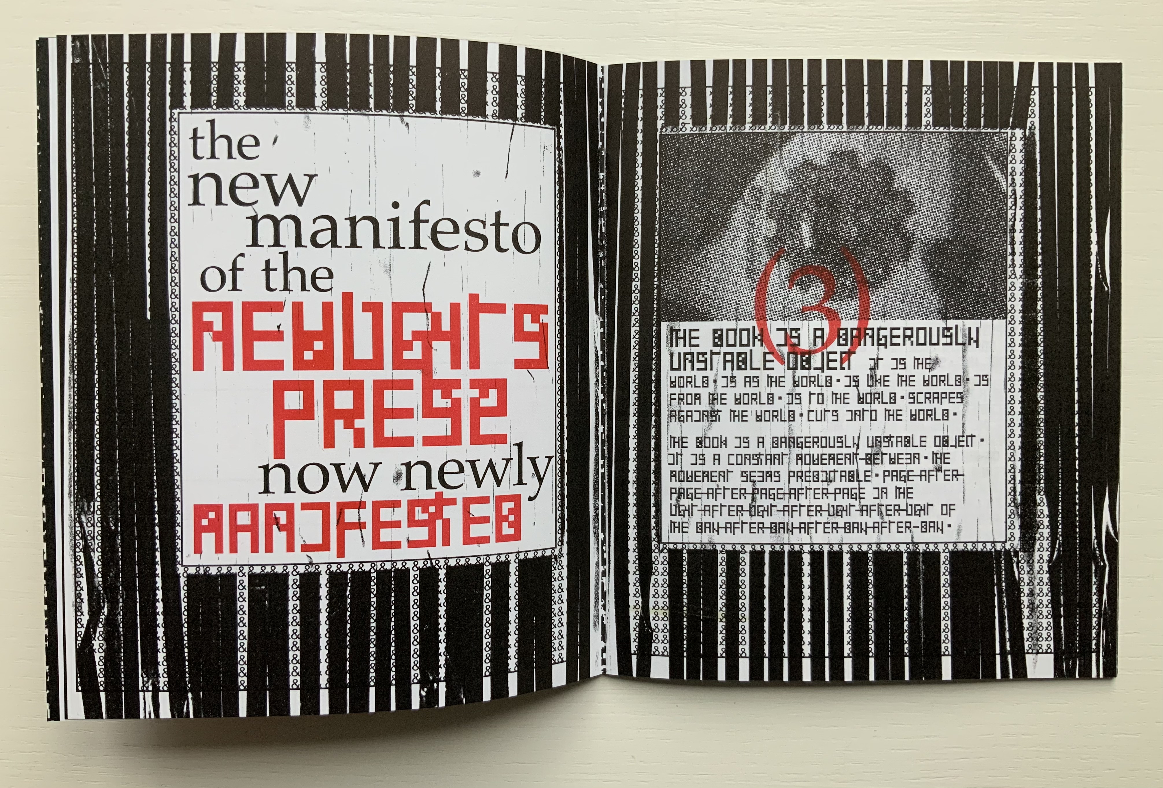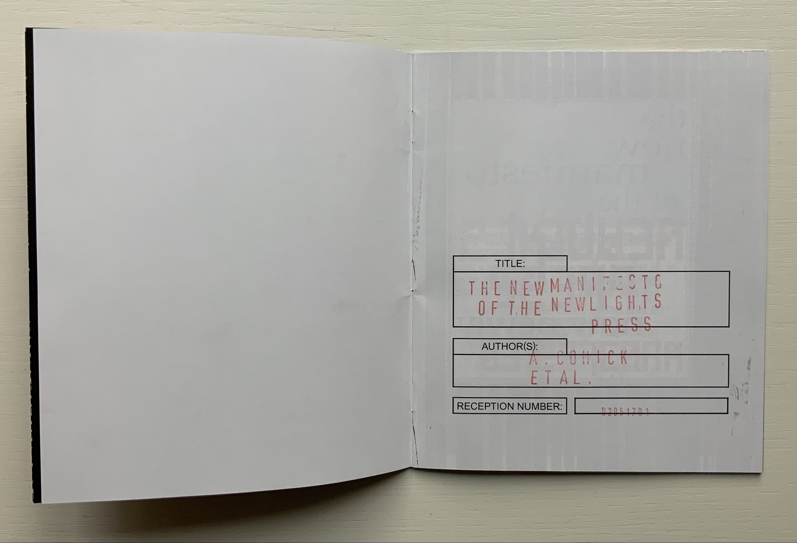 The catalogue also teases with its title and design by suggesting that once books have been placed on display like this, the setting is no longer a library but a “white cube gallery“. As the catalogue progresses, black-and-white photos of items from the exhibition appear on the verso page in frames that appear to be hanging on the trompe l’oeil cube’s rear wall.