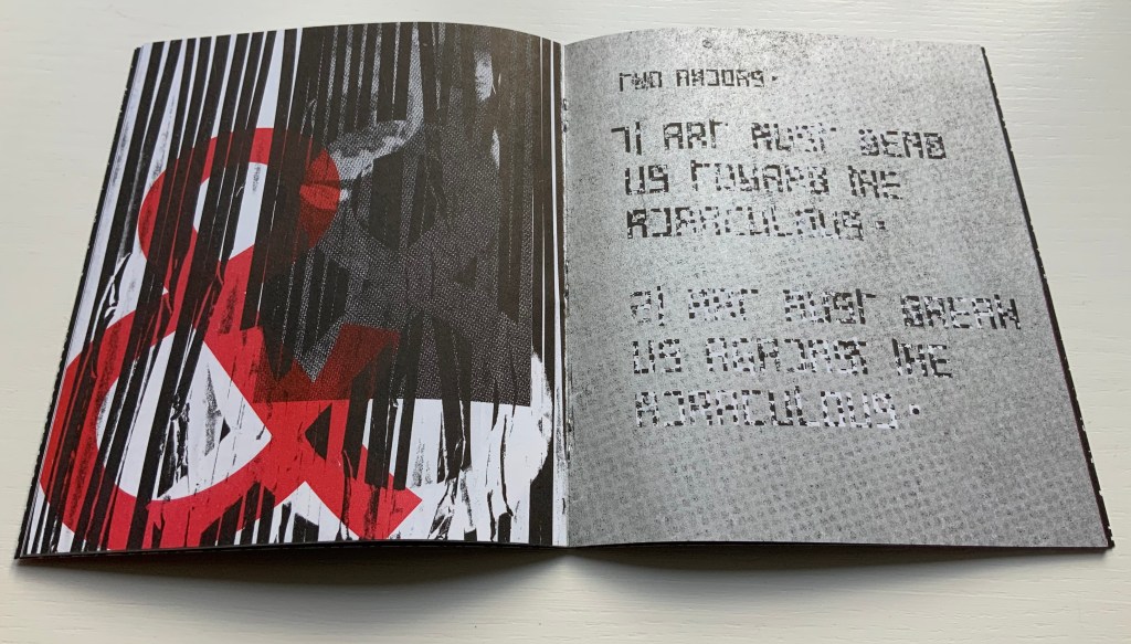 With Between the Sheets, we have on our hands a decidedly multi-layered diversion. At one layer, it diverts by questioning Debord’s own words, consigning their “theoretical authority” to a fate of falsification by “having become a quotation — a fragment torn from its context”. Like a fun-house mirror, the page bows to give this distorted reflection of Debord’s words.