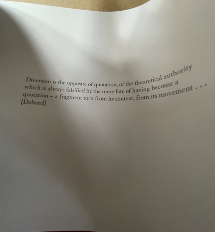 Diversion is the opposite of quotation, of the theoretical authority which is always falsified by the mere fate of having become a quotation — a fragment torn from its context, from its movement … [Debord]