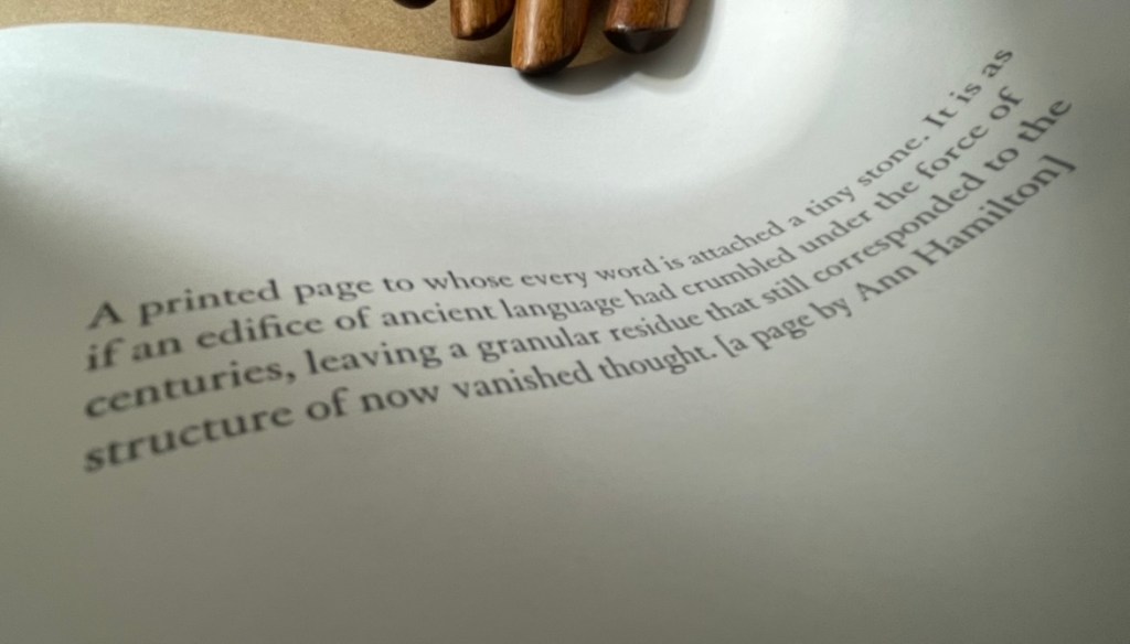 A printed page to whose every word is attached a tiny stone. It is as if an edifice of ancient language had crumbled under the force of centuries, leaving a granular residue that still corresponded to the structure of now vanished thought. [a page by Ann Hamilton]