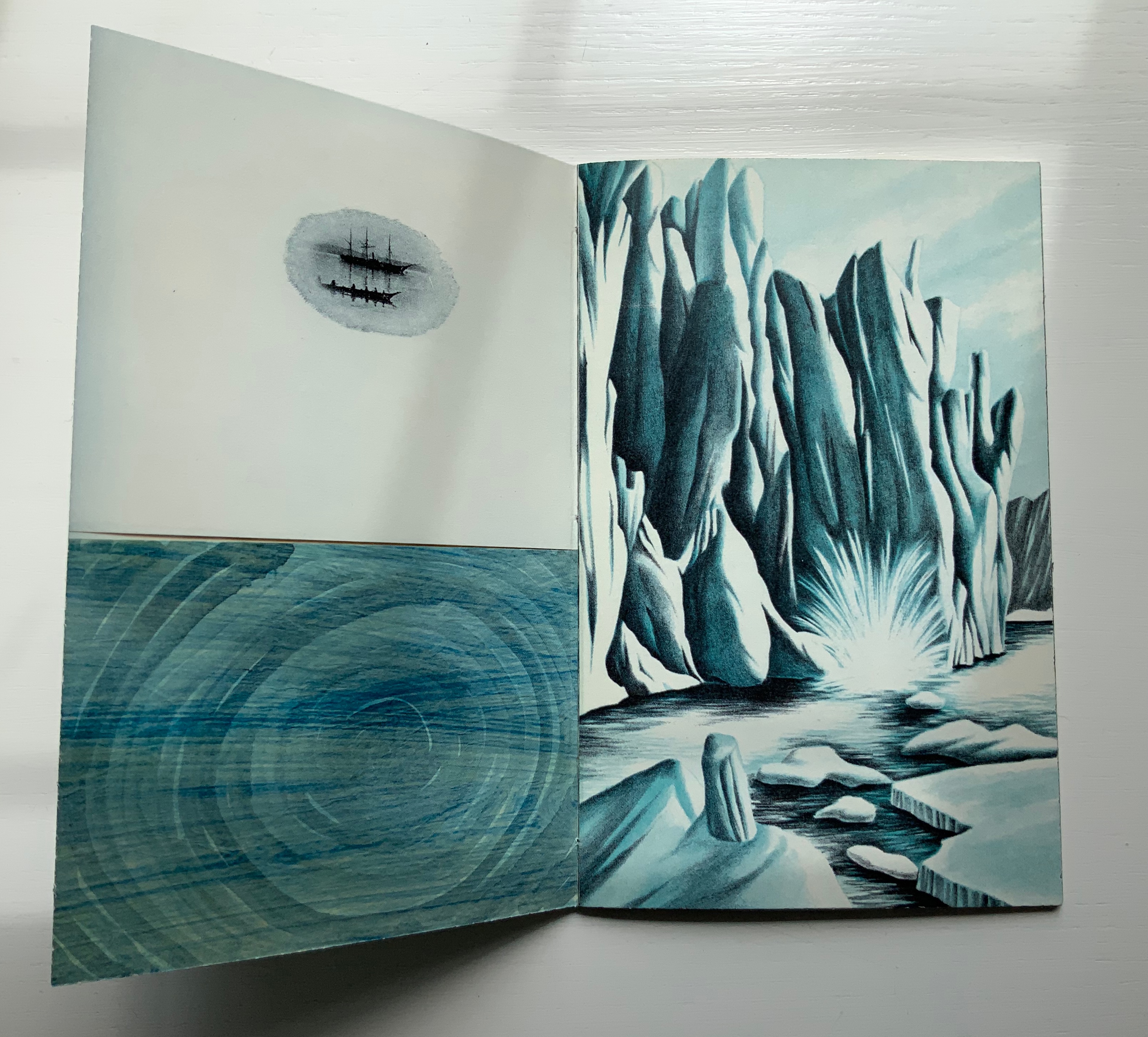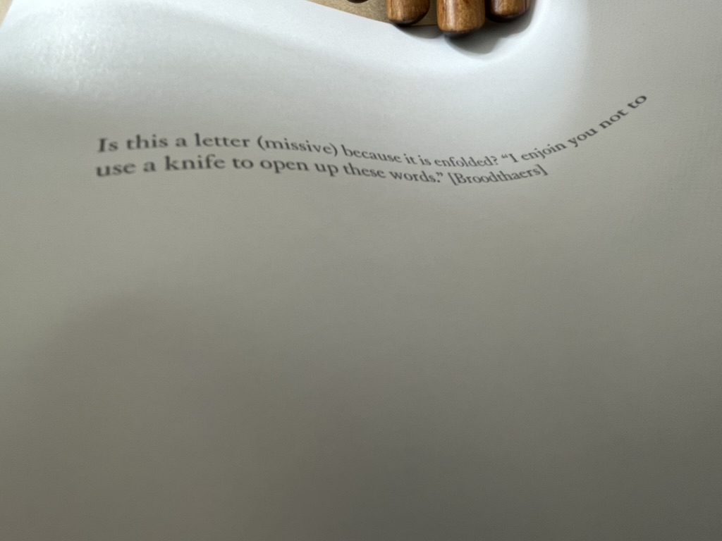 Spector’s library contains a copy of Broodthaers’ 1974 artist book, A Voyage on the North Sea. These layered references and self-references — direct references to Broodthaers’ A Voyage, indirect references through the self-reference to Spector’s Marcel Broodthaers (1990) — bring into sparkling focus two features of book art and, in particular, late 20th century book art: reverse ekphrasis and bookworks in conversation with one another.