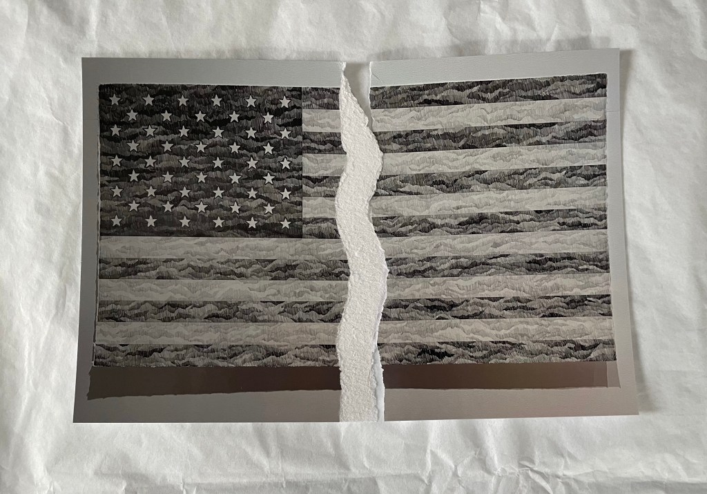 Revisiting Spector’s works this time was prompted by an invitation from the Center for Book Arts to “BookTalk: Full Dress or Half Dress, Not Casual with Buzz Spector” on 8 October 2024. The postcard reproduces the drawing Torn Flag (2022), a 565 × 1118 mm drawing (graphite on paper) that appeared in the Zolla/Lieberman Gallery. Spector describes the postcard as an “(informal) edition … Elegy to the Divided States”. Ephemeral though the postcard may be, its tearing makes a self-reflexive artistic gesture. But it also serves as an injunction: Vote. Always.