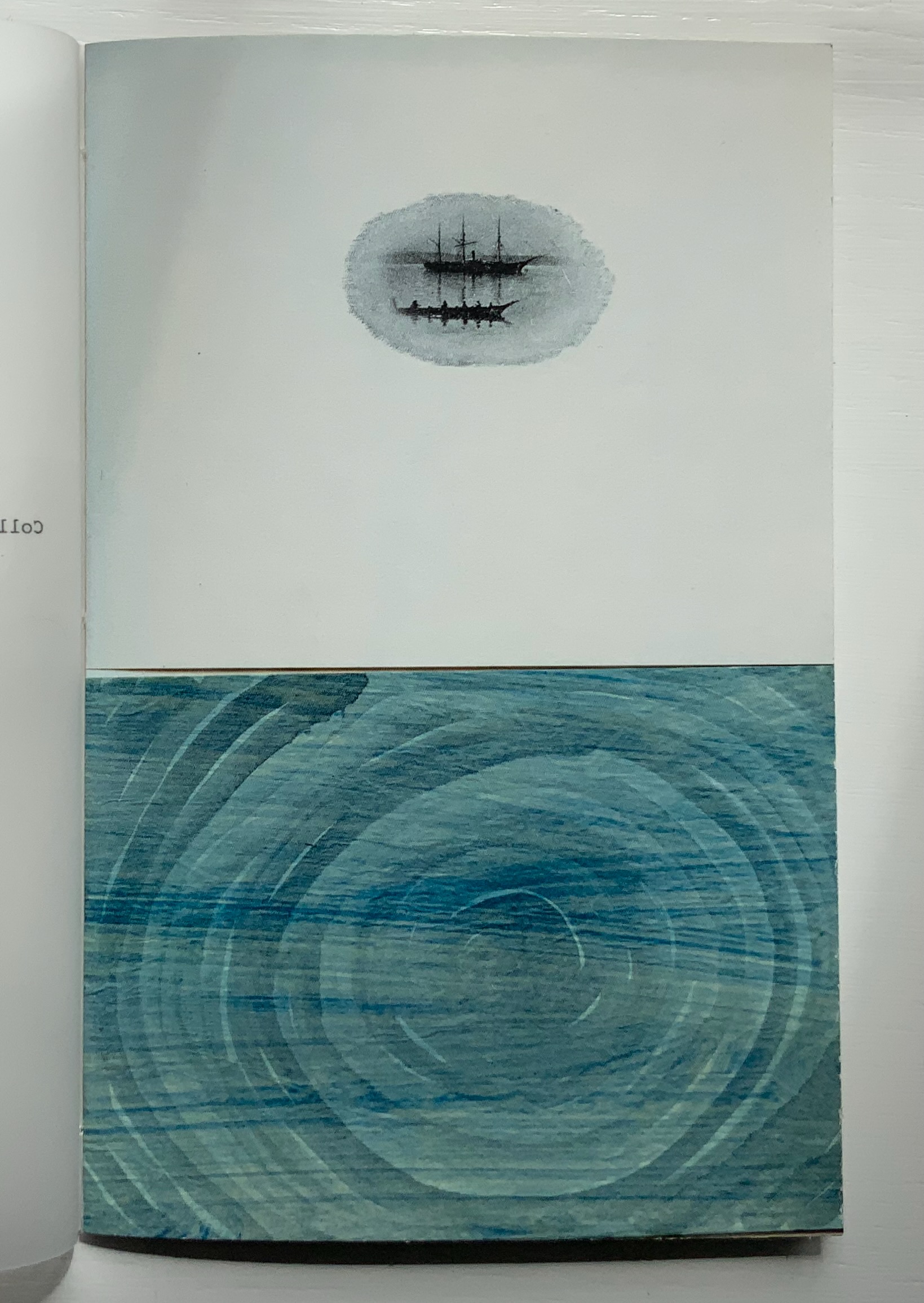 Is it a coincidence that Between the Sheets also consists of 40 in the edition just like Hamilton’s commission? Spector quotes not only images and words from others’ works and his own, he quotes the details of their production and form. It is certainly no coincidence that Between the Sheets quotes the stab bound structure of Marcel Broodthaers’ A Voyage on the North Sea. After all, in his hidden prefatory explanation, Spector makes no bones about the fact that Between the Sheets arose in part from his astonishment at finding the page numbers hidden within the bound edge of A Voyage. But how did he find them? In the process of creating his own North Sea (for M.B.) (1990). So yet another self-quotation of production process.