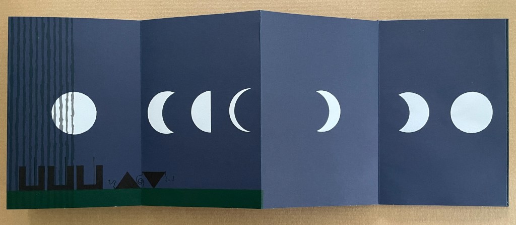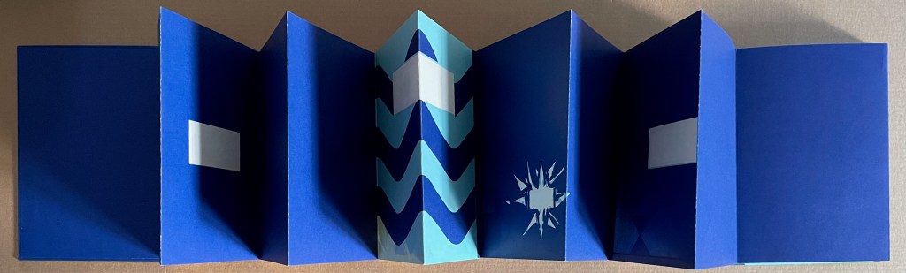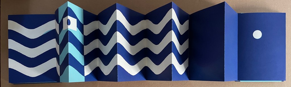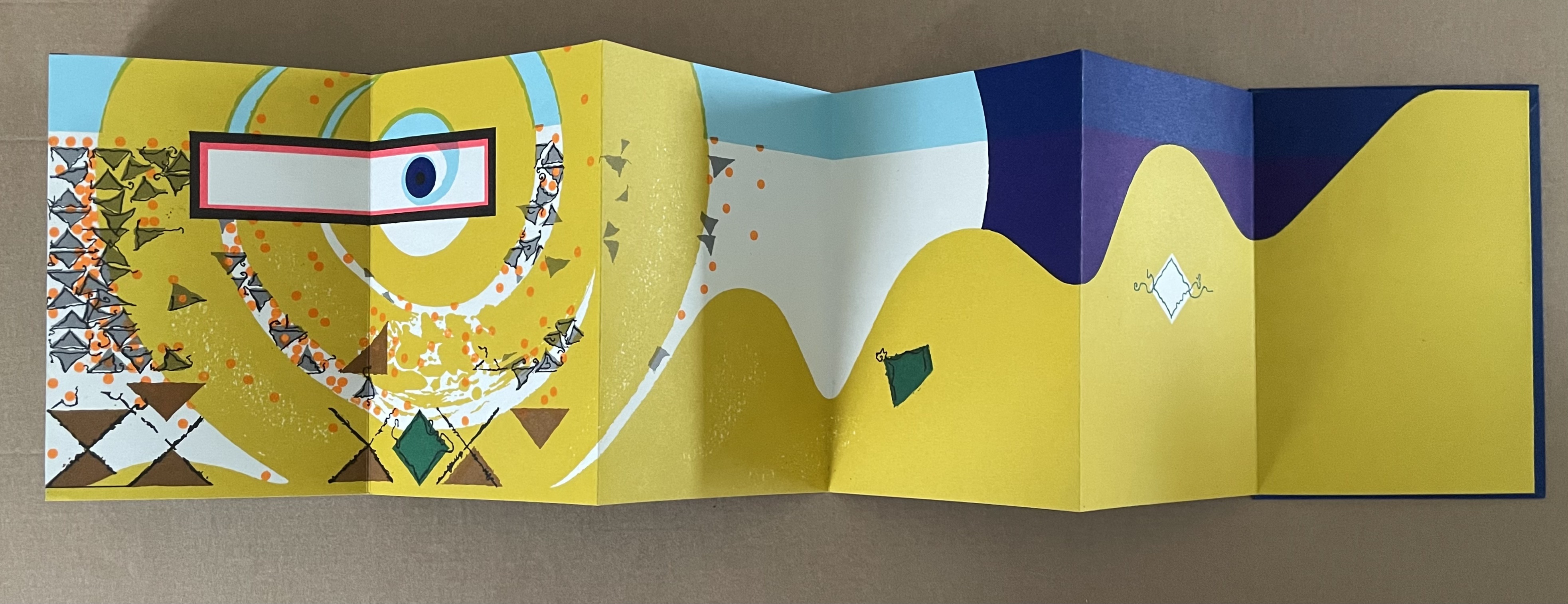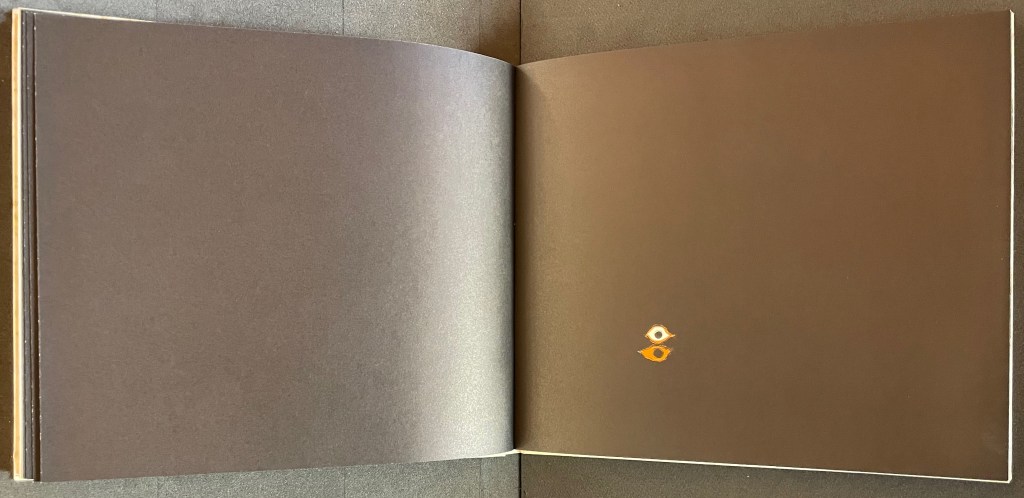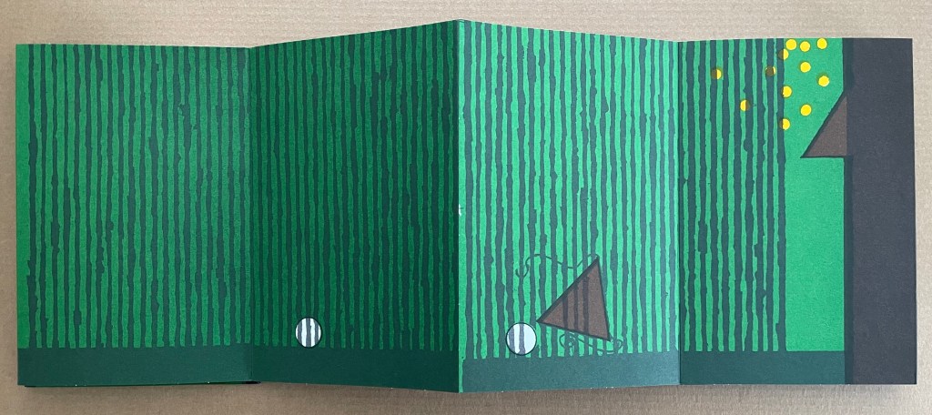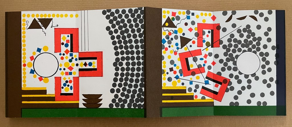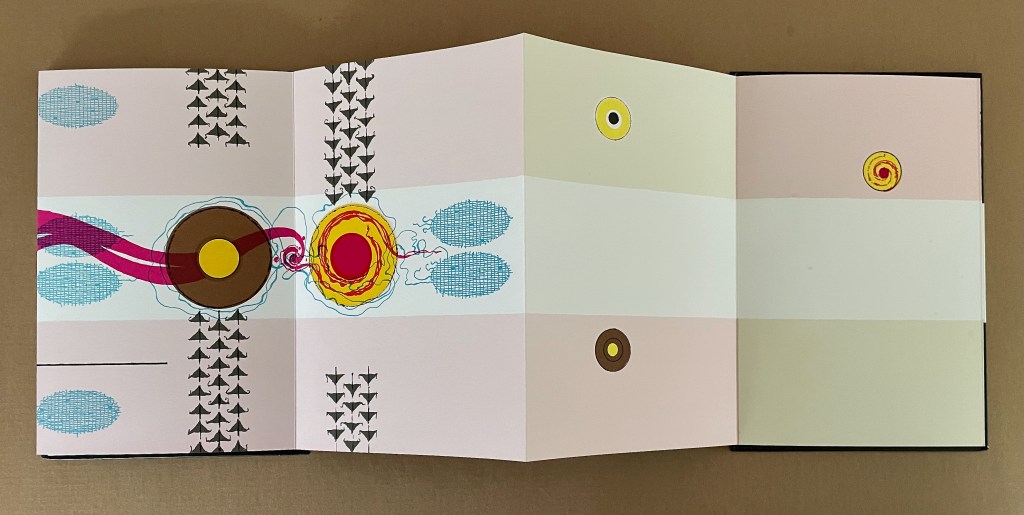 Based in Montélimar, France, and Seoul, South Korea, iOiO Studio produced this ingenious micro-edition leporello that invites its audience to behold and play. The folds and registration of images allow the viewer to find and create new shapes and color combinations. Its shapes and colors might remind viewers of Heinz Edelmann’s art for The Yellow Submarine. In its appeal to the child in the adult, it will remind book art enthusiasts of the works of Katsumi Komagata, Warja Lavater, Bruno Munari, and Peter and Donna Thomas. In its sophistication, it might remind them of the contributions to LL’Éditions leporello series. Many other connections can be found in Stephen Perkins site Accordion Publications, where Pliplop first came to my attention.
