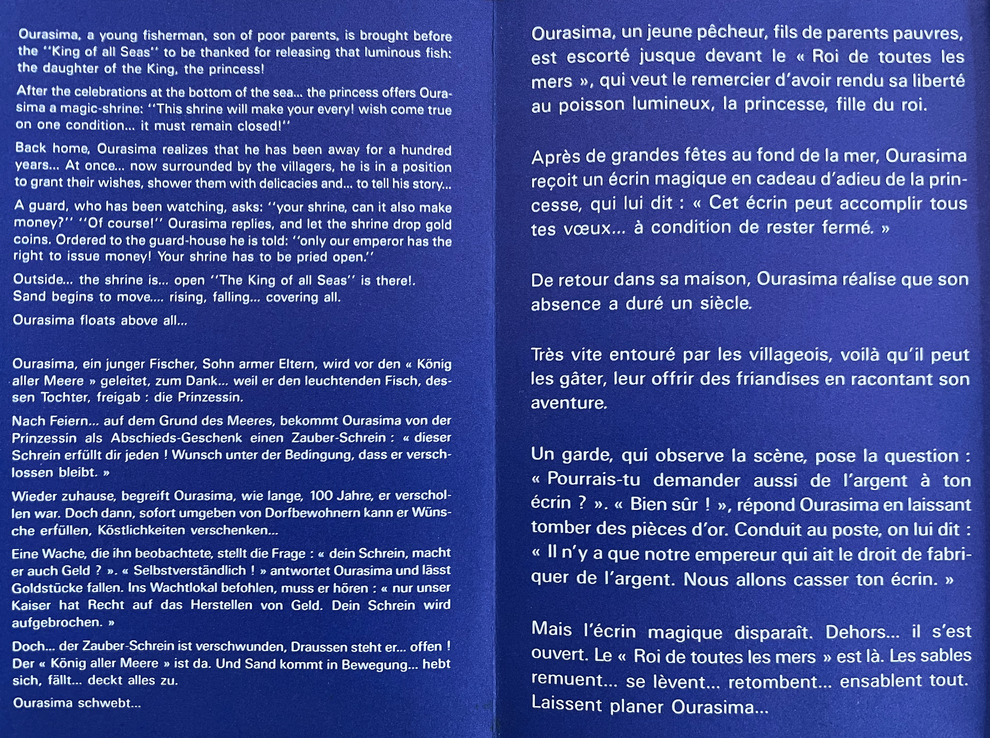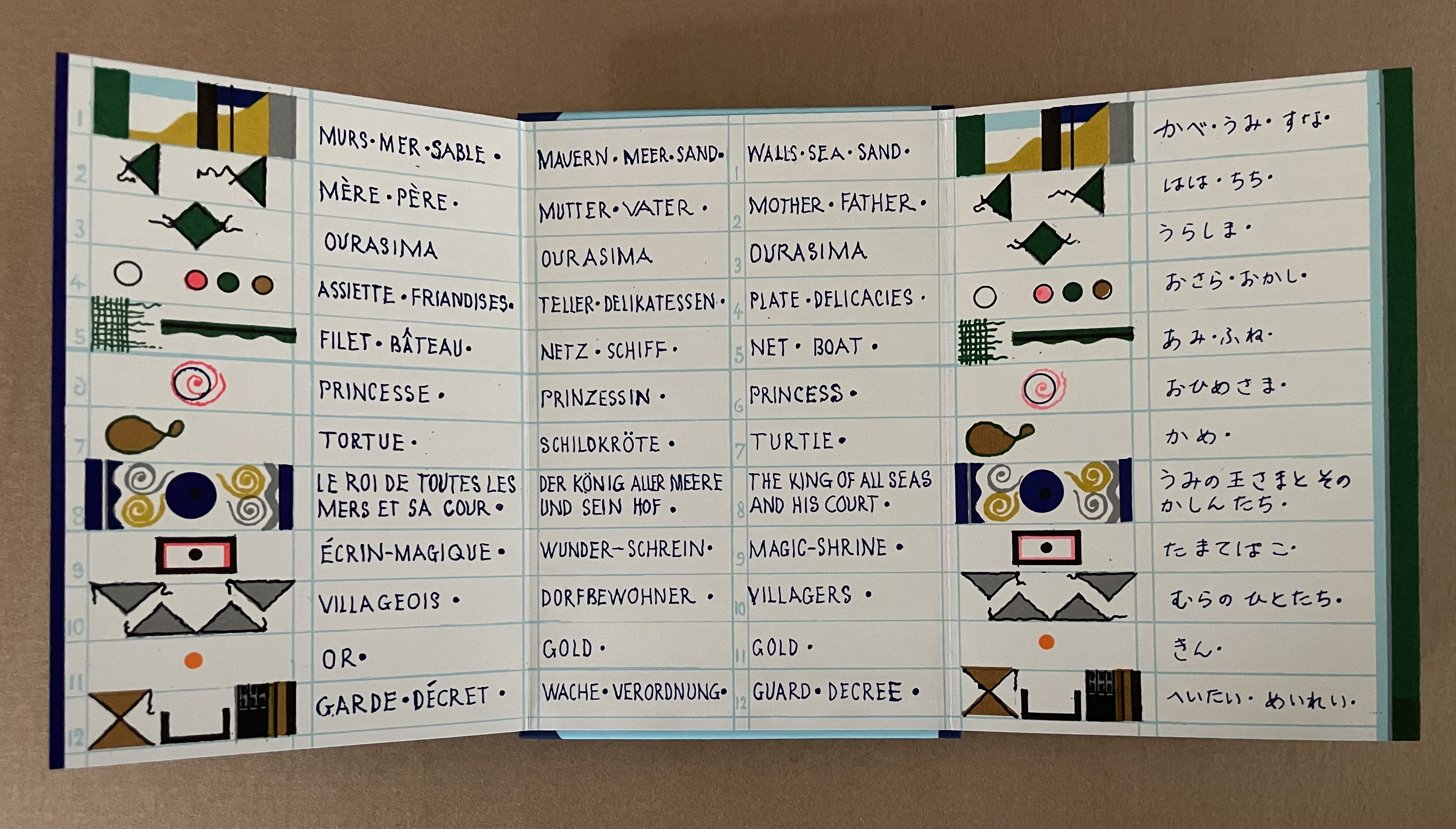 Ourasima, also known as Urasima Taro, is a Japanese folktale that reaches back to the eighth century. Lavater’s version is a cross between the stories of the Golden Goose, Rip Van Winkle and Pandora’s Box. In keeping with her treatments of Western folk and fairy tales, Lavater brackets her wordless retelling with a cast of characters, objects and their corresponding emblems at the beginning and a brief summary of the story at the end — all annotated in French, German, and English, but this time in Kanji as well.
