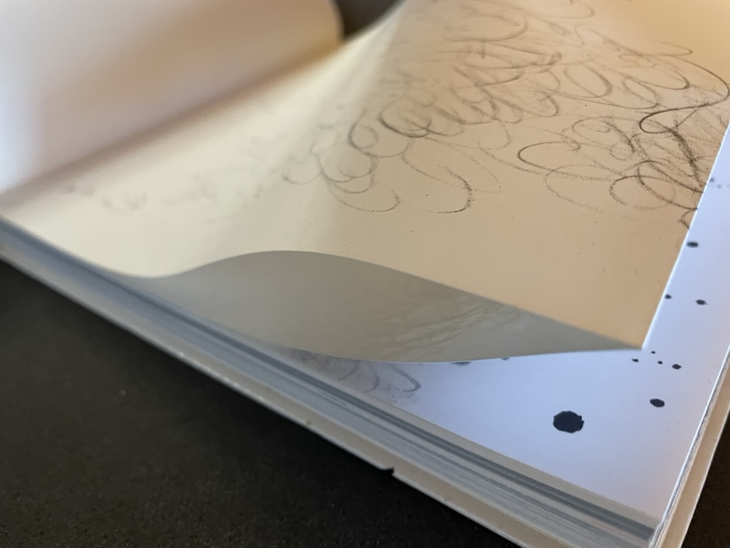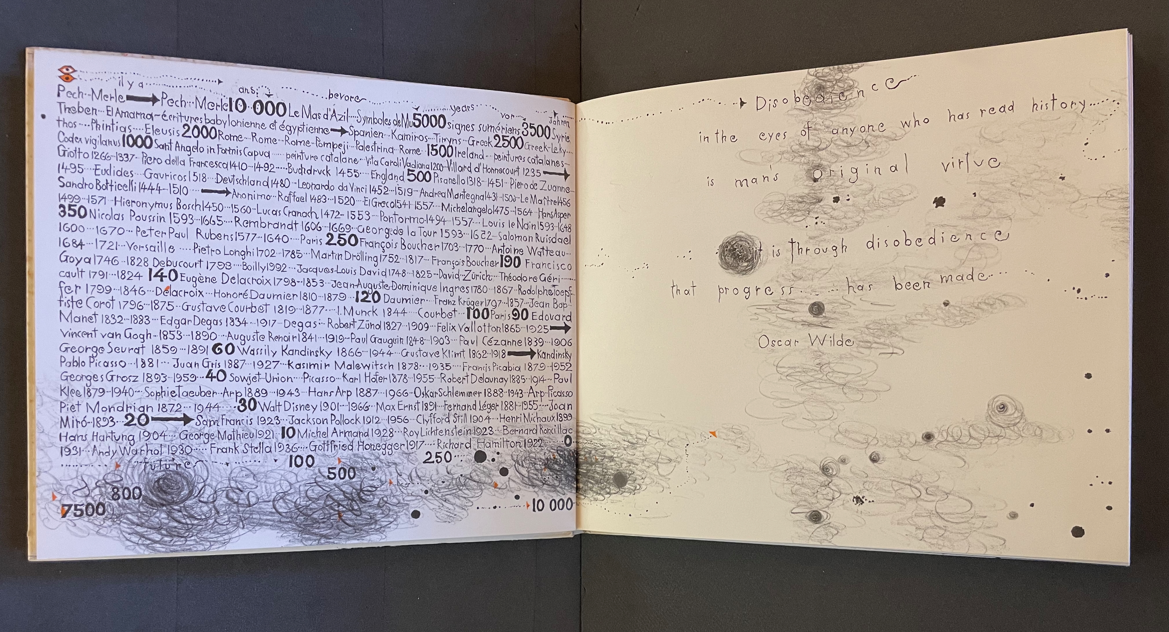 Warja Lavater’s Sketchbook opens with a page of pencil scrawling that wraps from the first side of a Chinese-fold folio, over the fold, and onto the folio’s other side, where a 10,000+ year timeline of artists appears in cramped handprint. The scribbling continues onto the next folio, embroidering Oscar Wilde’s aphorism