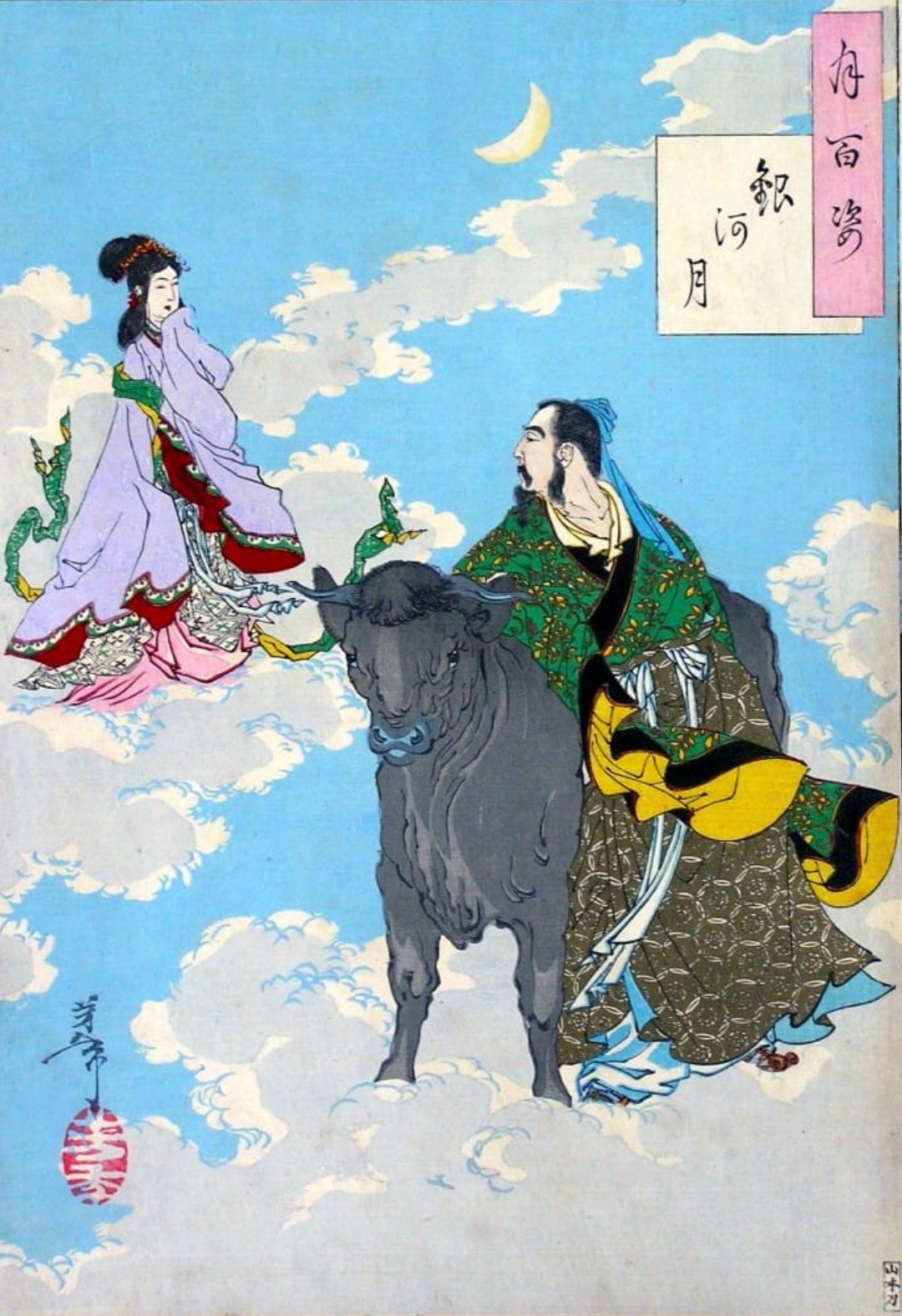 From 100 Aspects of the Moon, by Tsukioka Yoshitoshi. Late 1800’s. (Public Domain). Orihime and Hikoboshi during the night of Tanabata. Photo: Tomo Japan.