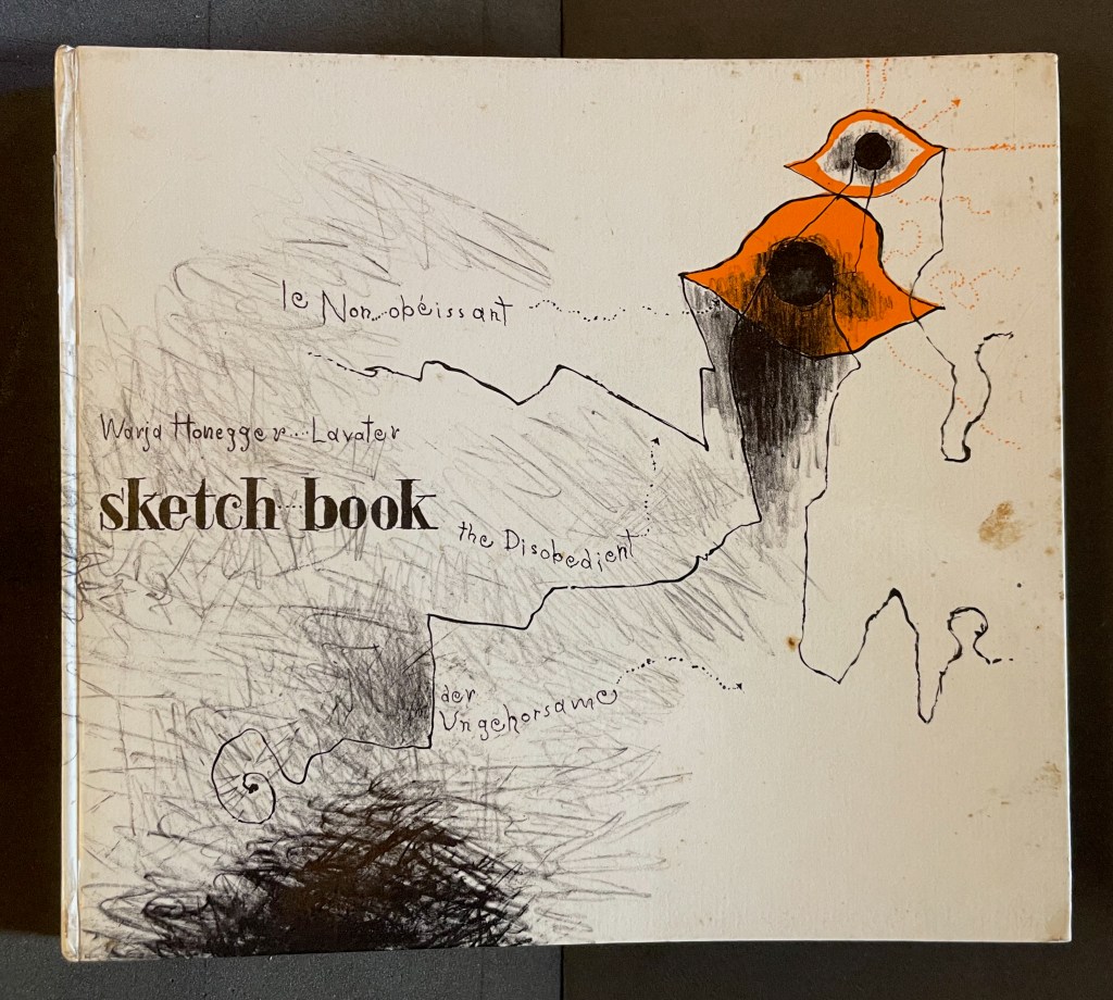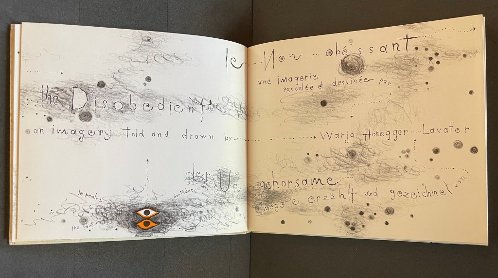 The scrawling runs over the fold of the folio and across a double-page spread to become the multilingual title page. Or rather the “subtitle becomes title page”. Look again at the cover. Wasn’t the title Sketchbook? Now it is Le Non-obéissant | The Disobedient | Der Ungehorsam, and it has acquired a new subtitle, and a strange one at that: Une Imagerie Racontée et dessinée par … |An Imagery Told and Drawn by … | Eine Imagerie Erzählt und Gezeichnet von Warja Lavater.