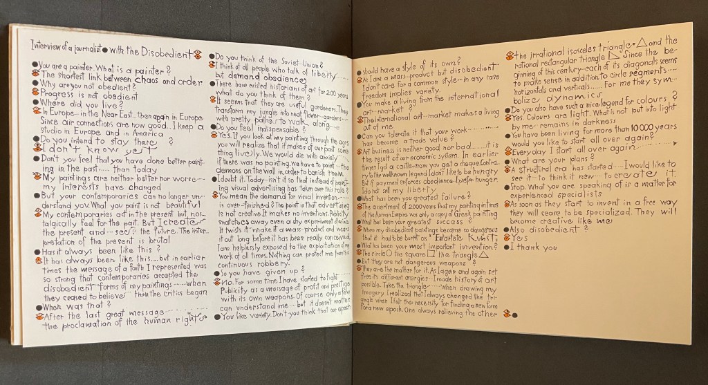 Sketchbook: Le Non-obéissant; The Disobedient (1968) Warja Lavater Casebound, printed gloss paper over boards, plain endpapers and fly leaves. H210 x W235 mm. [45] Chinese fold folios.Acquired from Ken Sanders Rare Books, 18 July 2024. Photos: Books On Books Collection.
