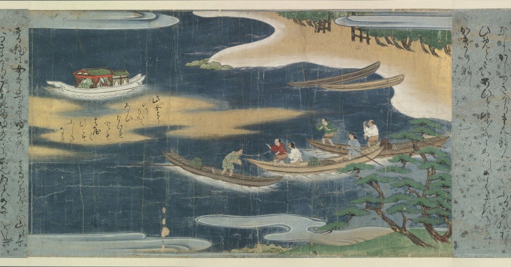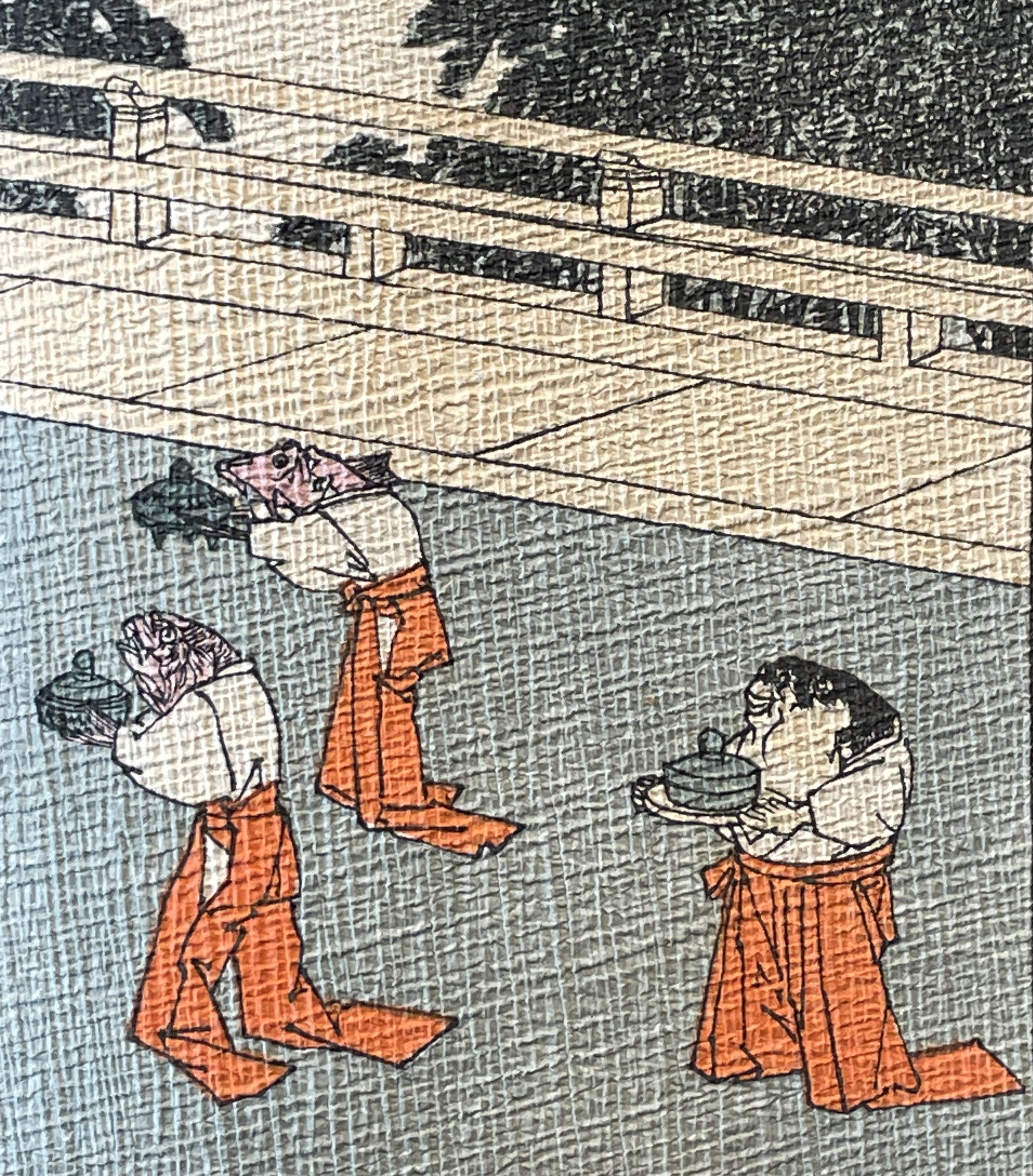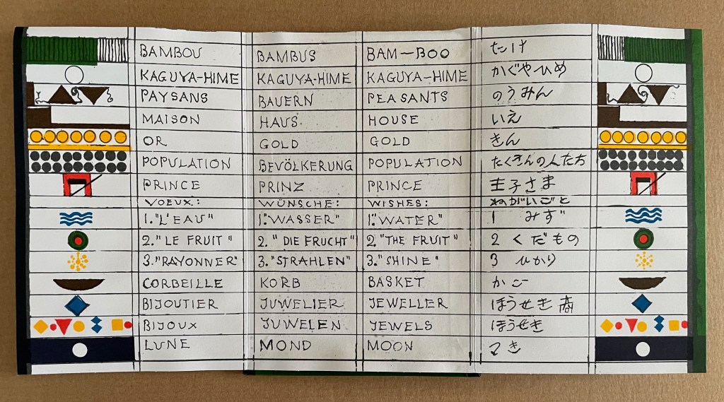 On the other side of the leporello, Kaguyahime, the moon princess, watched by the princes and her guardians, rises through the bamboo forest into night sky where she waxes and wanes ever after.