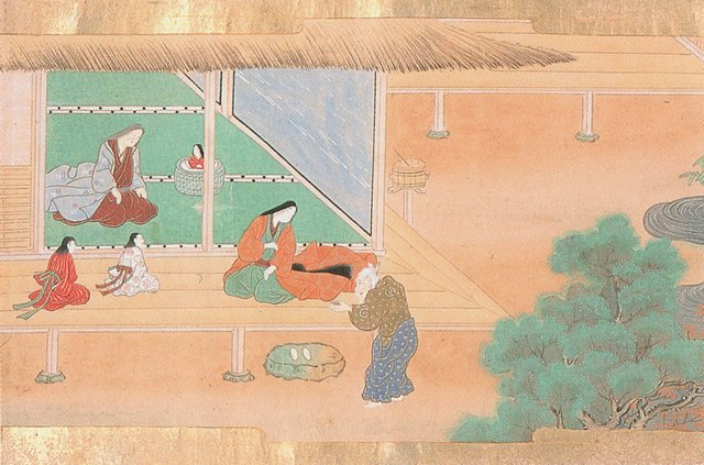 Kaguyahime in the bamboo forest. The poor farmer discovers her and takes her home, where already gold is beginning to fall.