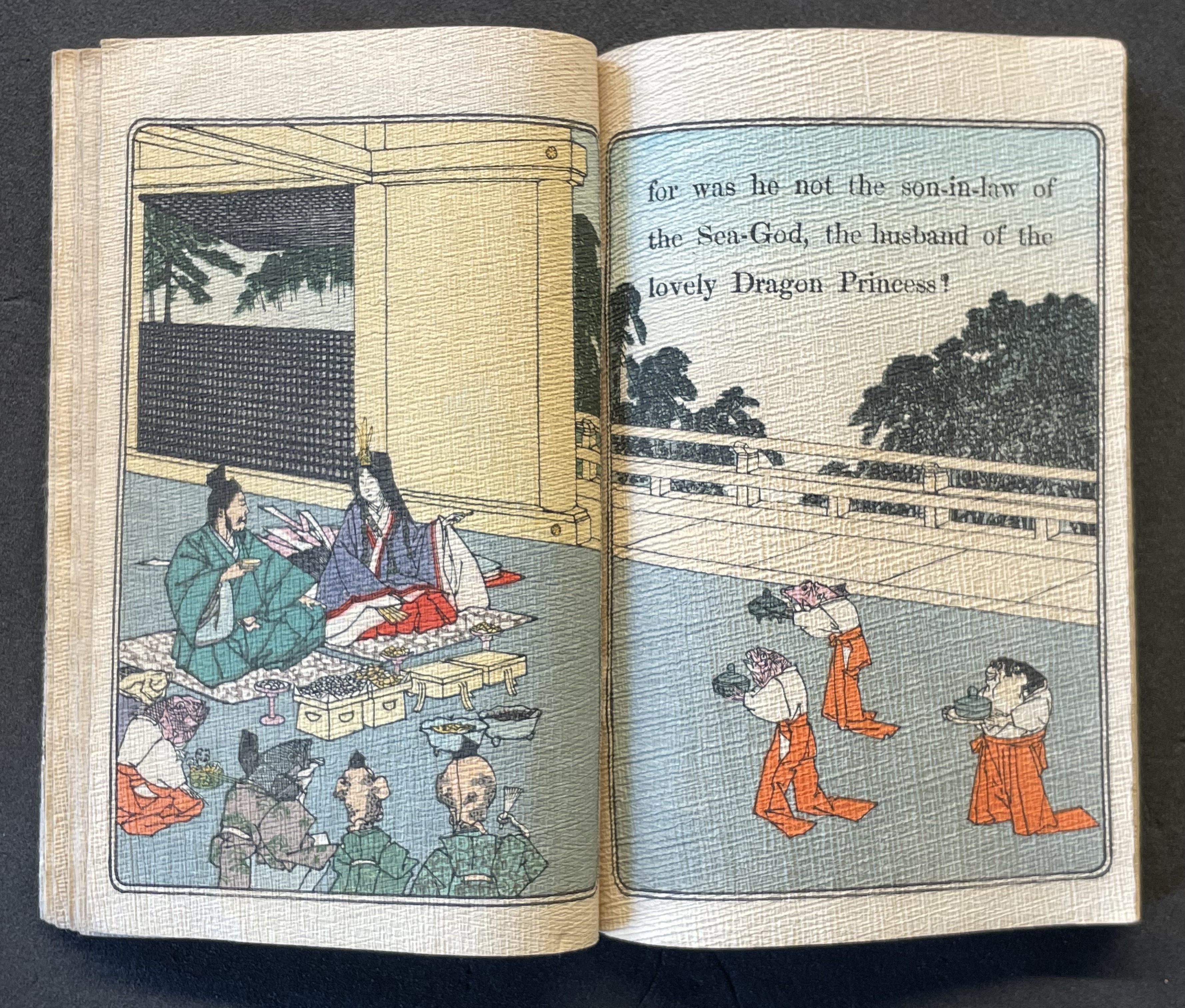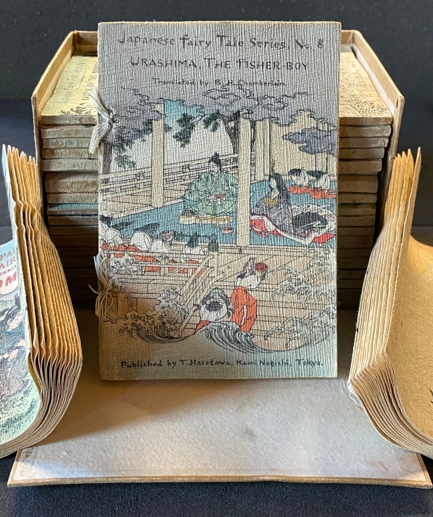 In the same period, the first translation into English appeared within a boxed set of Japanese fairy tales, printed on cloth folios and stab bound.