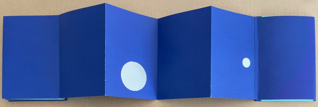 The reverse side of the leporello represents the two lovers as two solid white balls separated by the Milky Way represented as a solid white band, running right to left from the front cover. Over the course of the leporello, the lovers move to join one another on one side of the Milky Way then to separate according to their celestial fate.